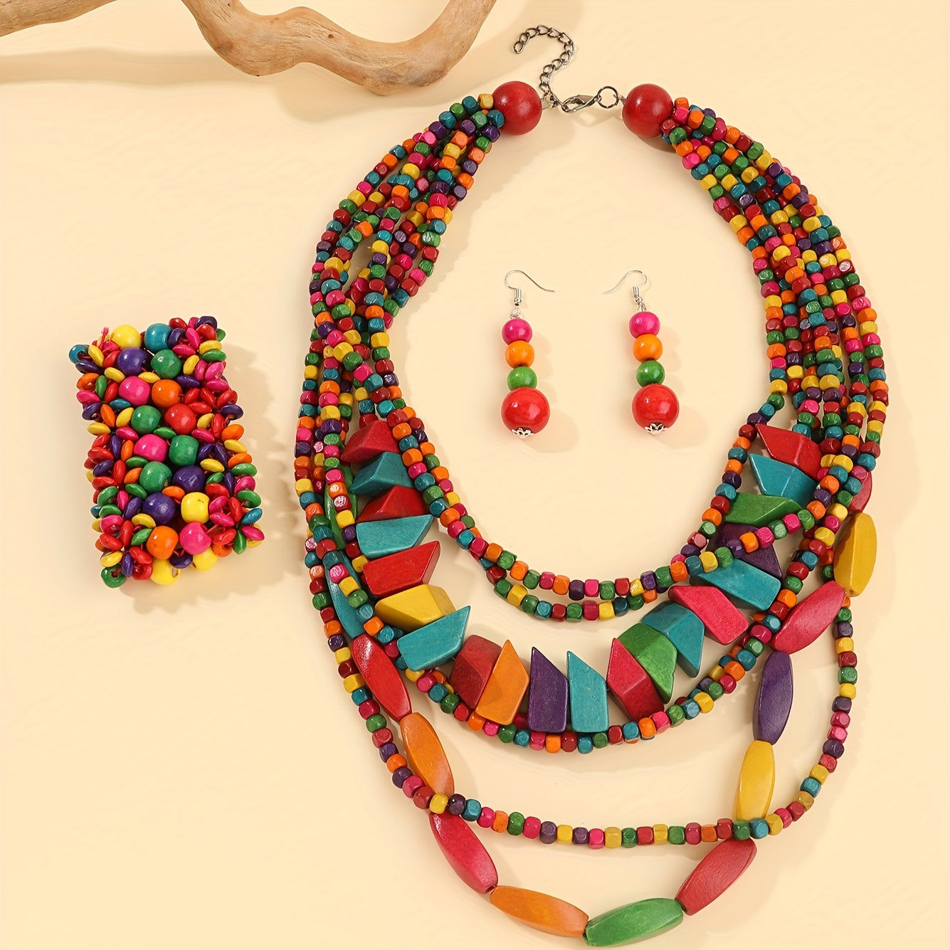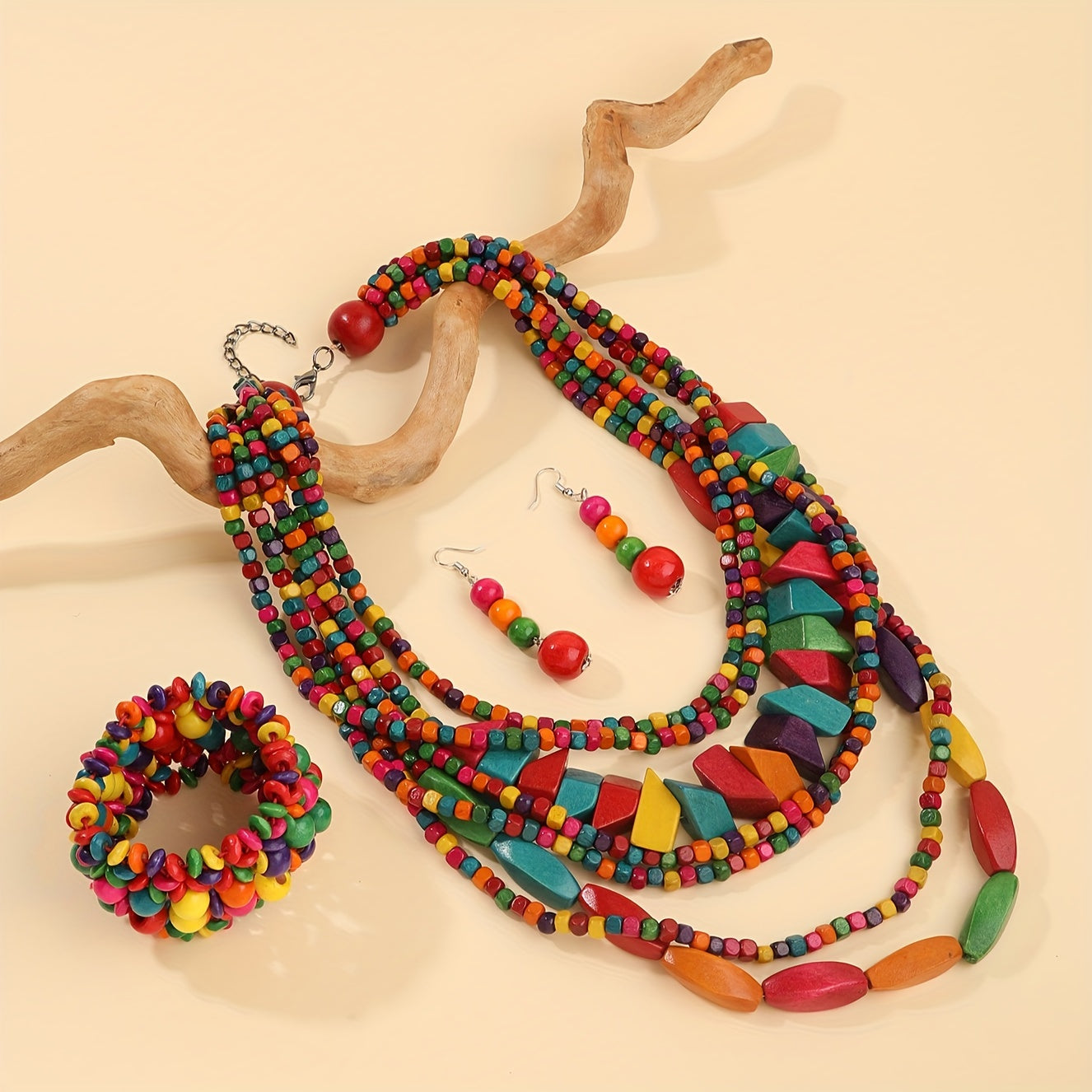 Набор ручной работы из украшений с яркими деревянными бусинами в преувеличенном многослойном дизайне, включая 4 пары серег, ожерелье и браслет. Идеально подходит для добавления потрясающего акцента к нарядам для вечеринок.