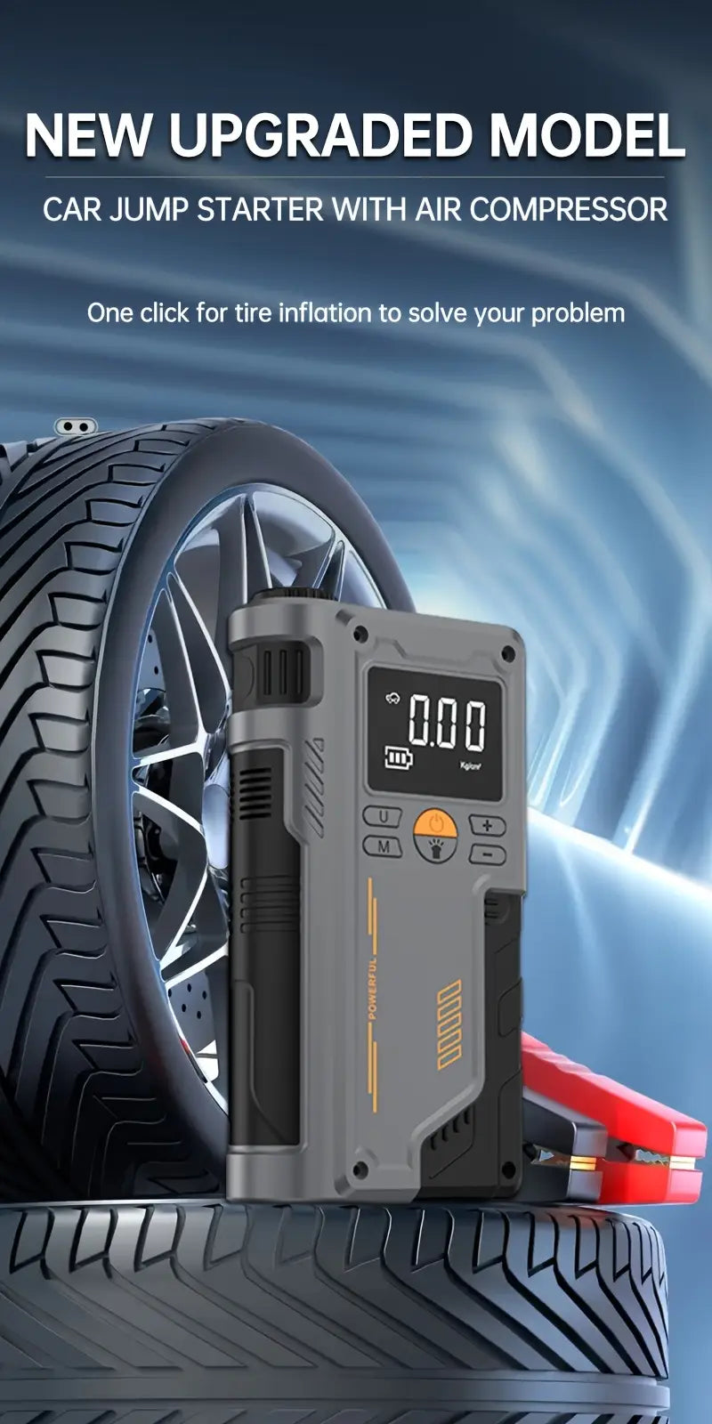 Портативный аварийный автомобильный пускатель с насосом для шин, USB-зарядным устройством, светодиодным фонарём