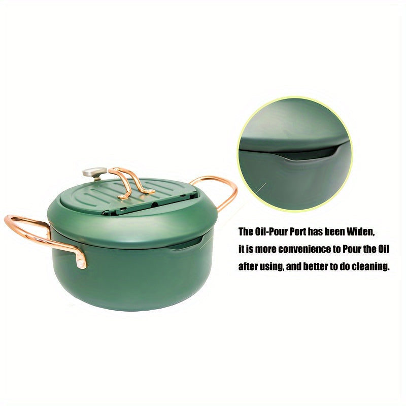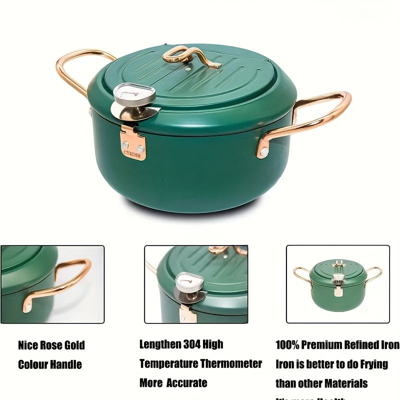 Большая зеленая сковорода для темпуры с термометром Фаренгейта, изготовленная из антипригарной углеродной стали для легкой очистки. Идеально подходит для жарки темпуры, курицы, рыбы и креветок.