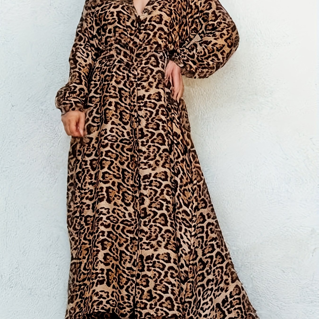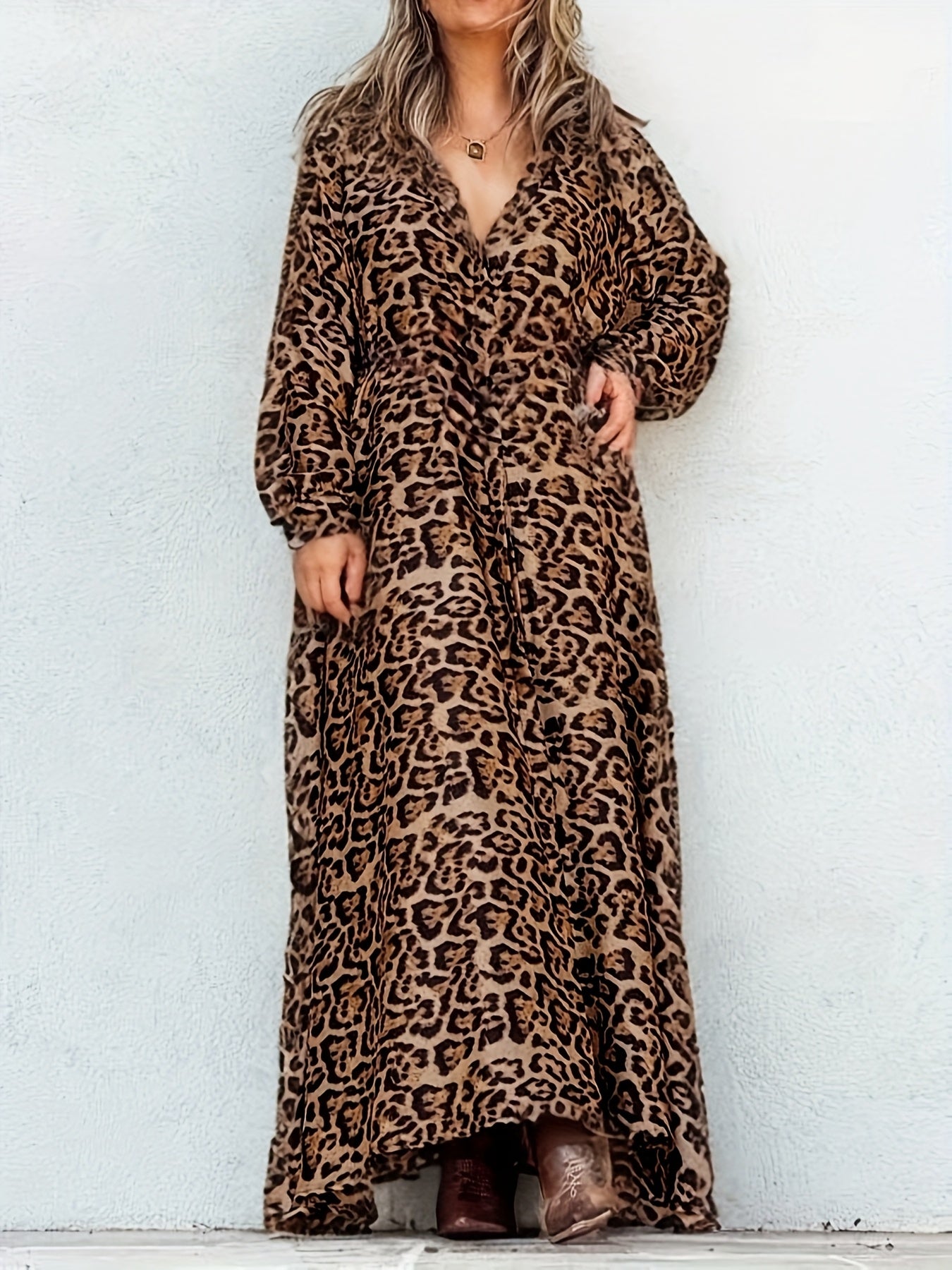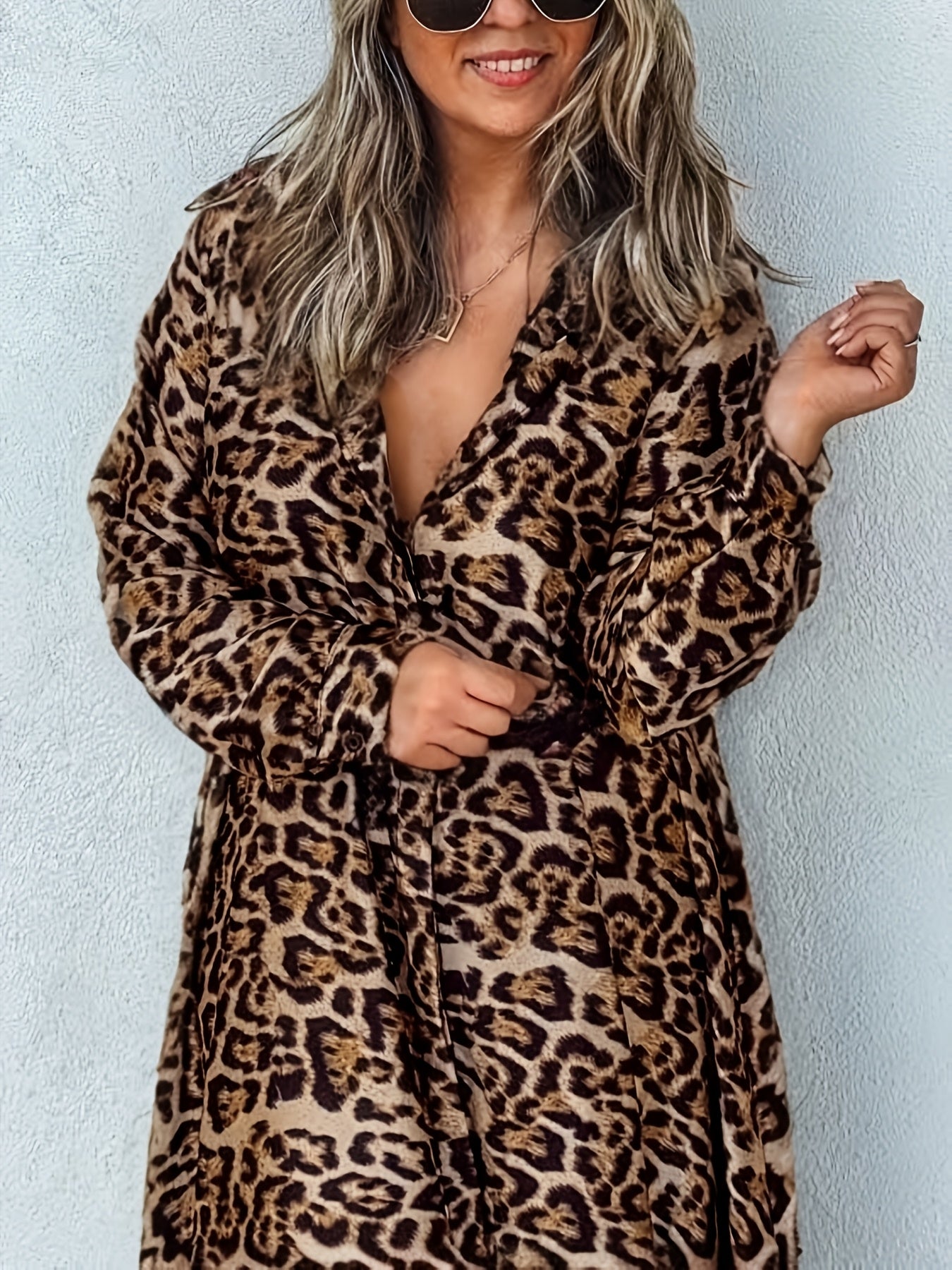 Платье с леопардовым принтом большого размера с V-образным вырезом и поясом, легкий полиэстер для весны, лета и осени