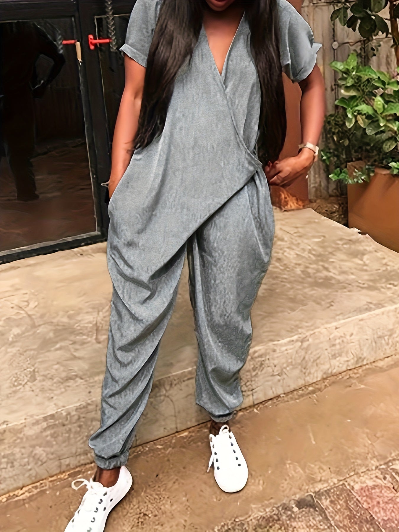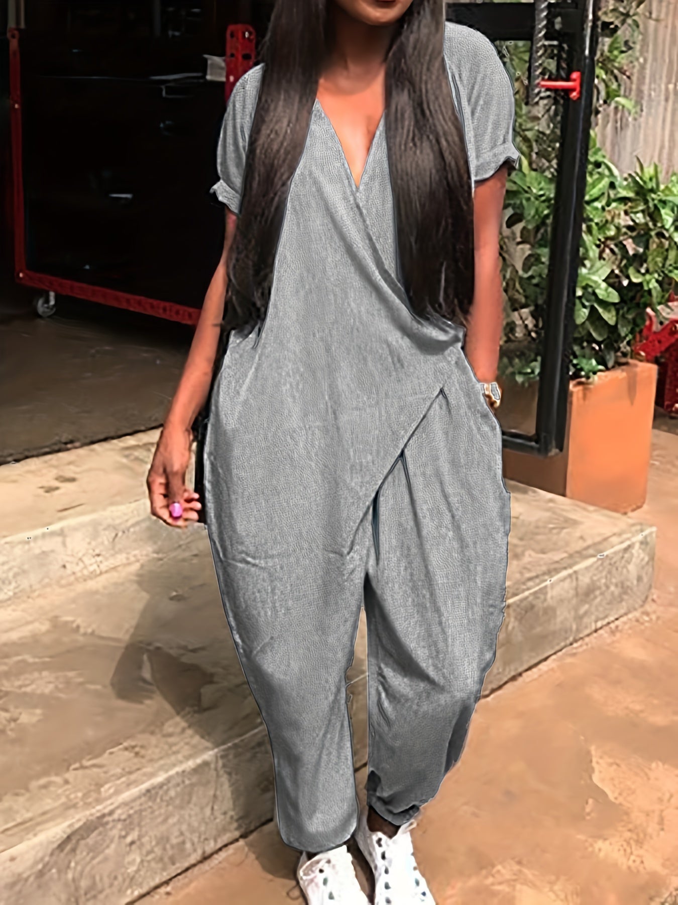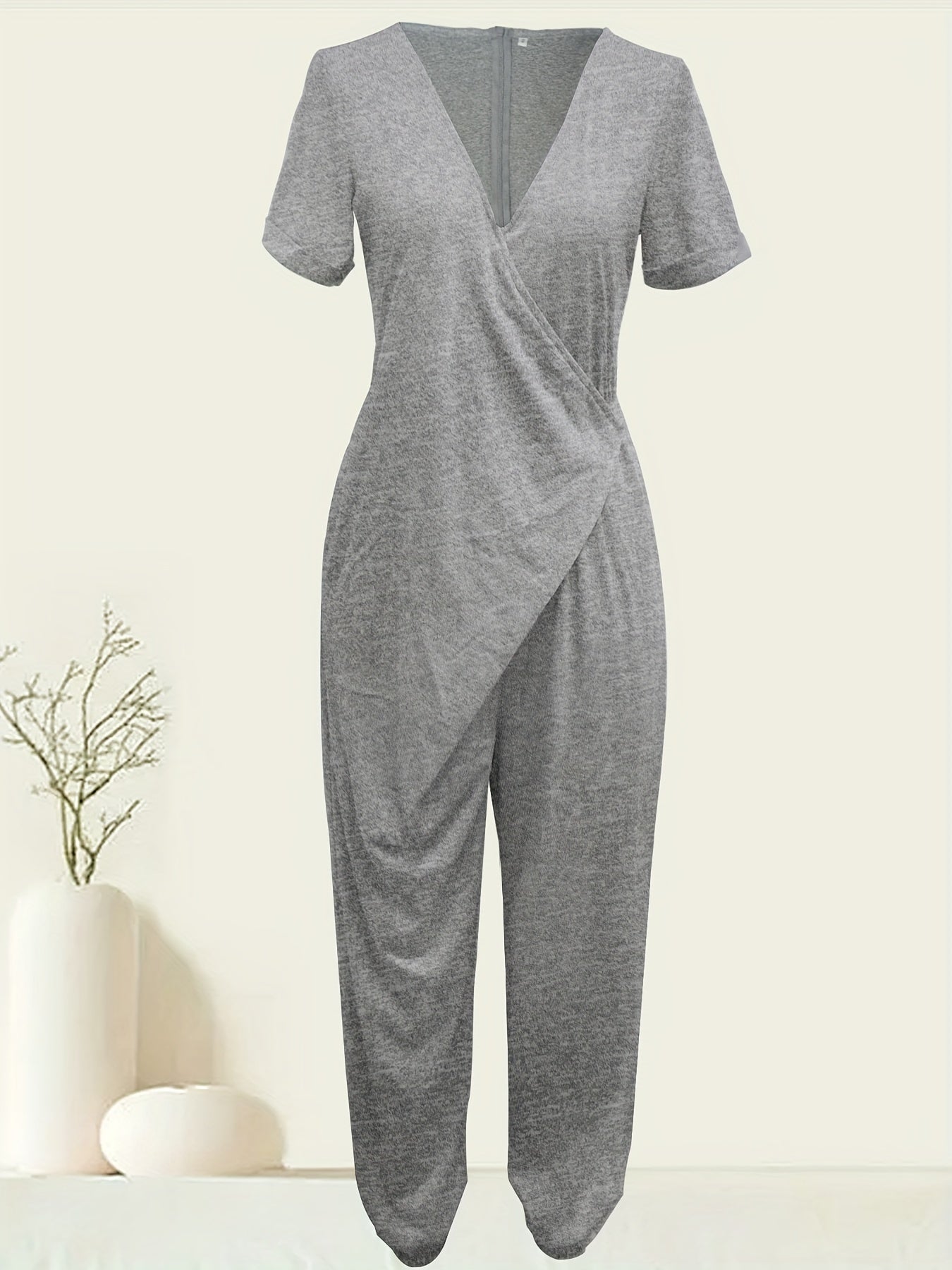 Свободный комбинезон для женщин в стильном хarem с короткими рукавами, асимметричным подолом, однотонного серого цвета. Изготовлен из смеси полиэстера и спандекса, который можно стирать в машине. Идеально подходит для