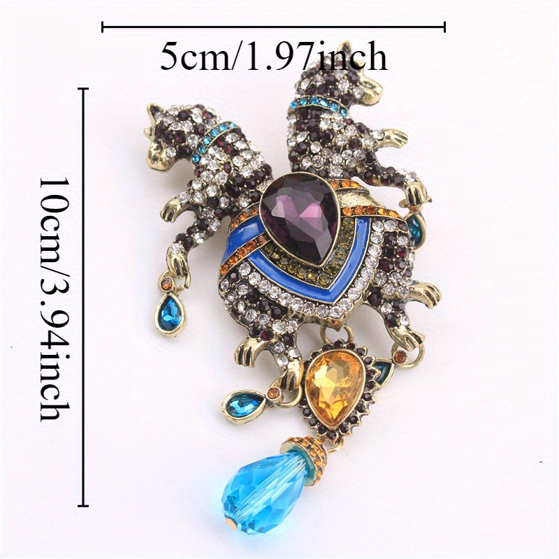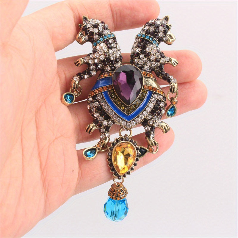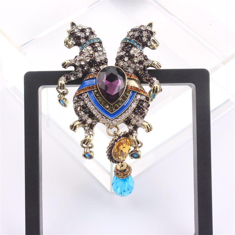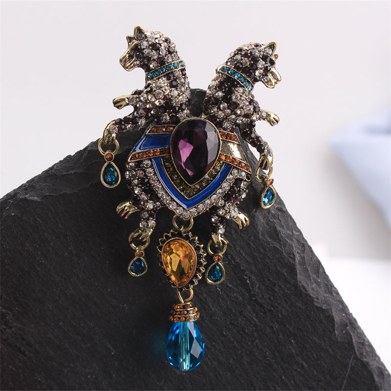 Животное брошь булавка с двойной головой леопарда, стразы, кисточка, ювелирные украшения