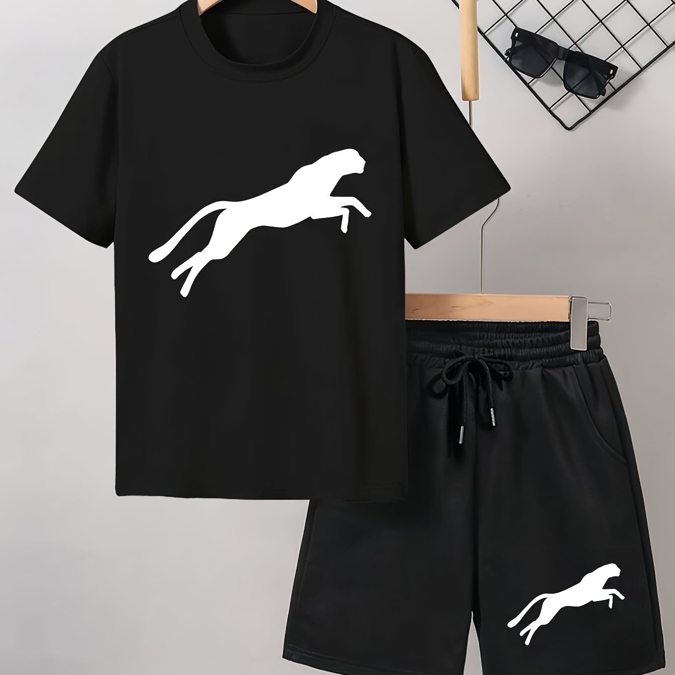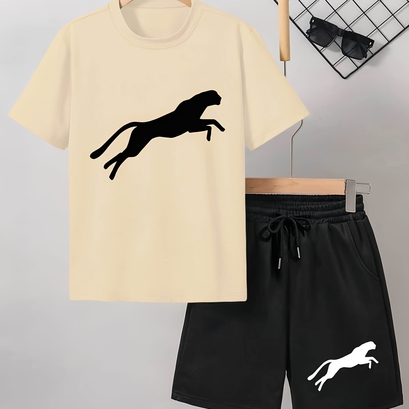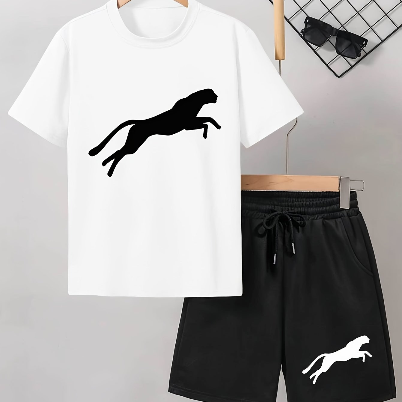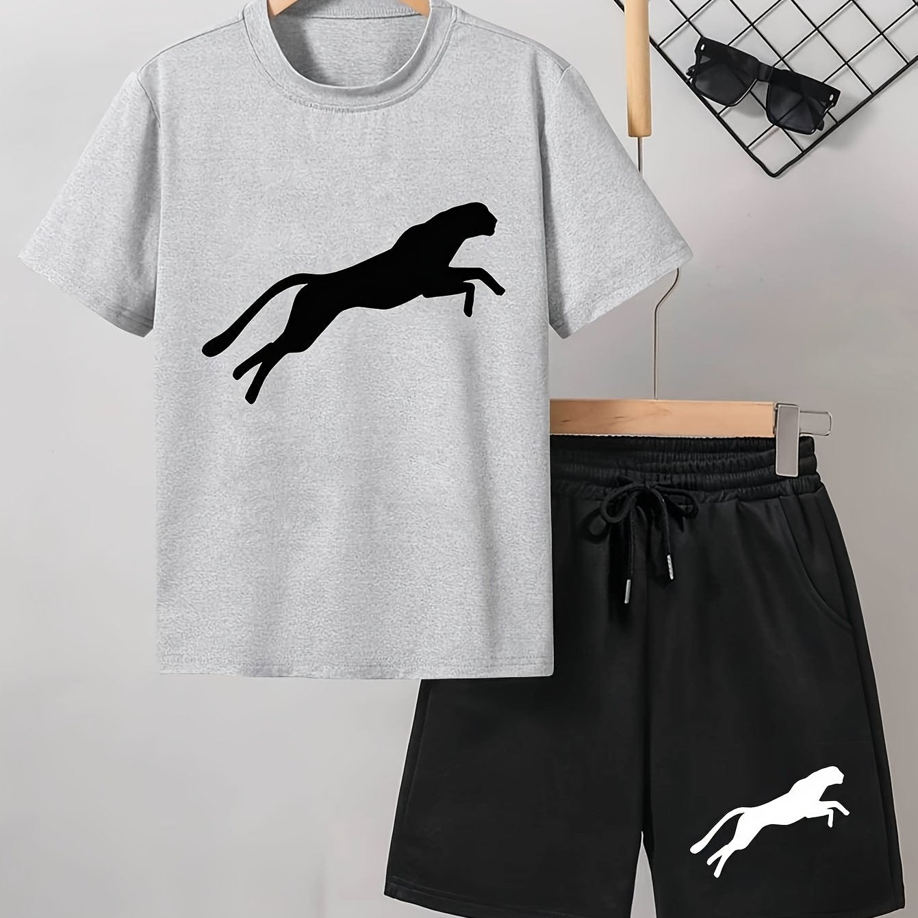 Мужской повседневный комплект из футболки с леопардовым принтом и шортов, светло-серый, черный, белый, полиэстер, лето