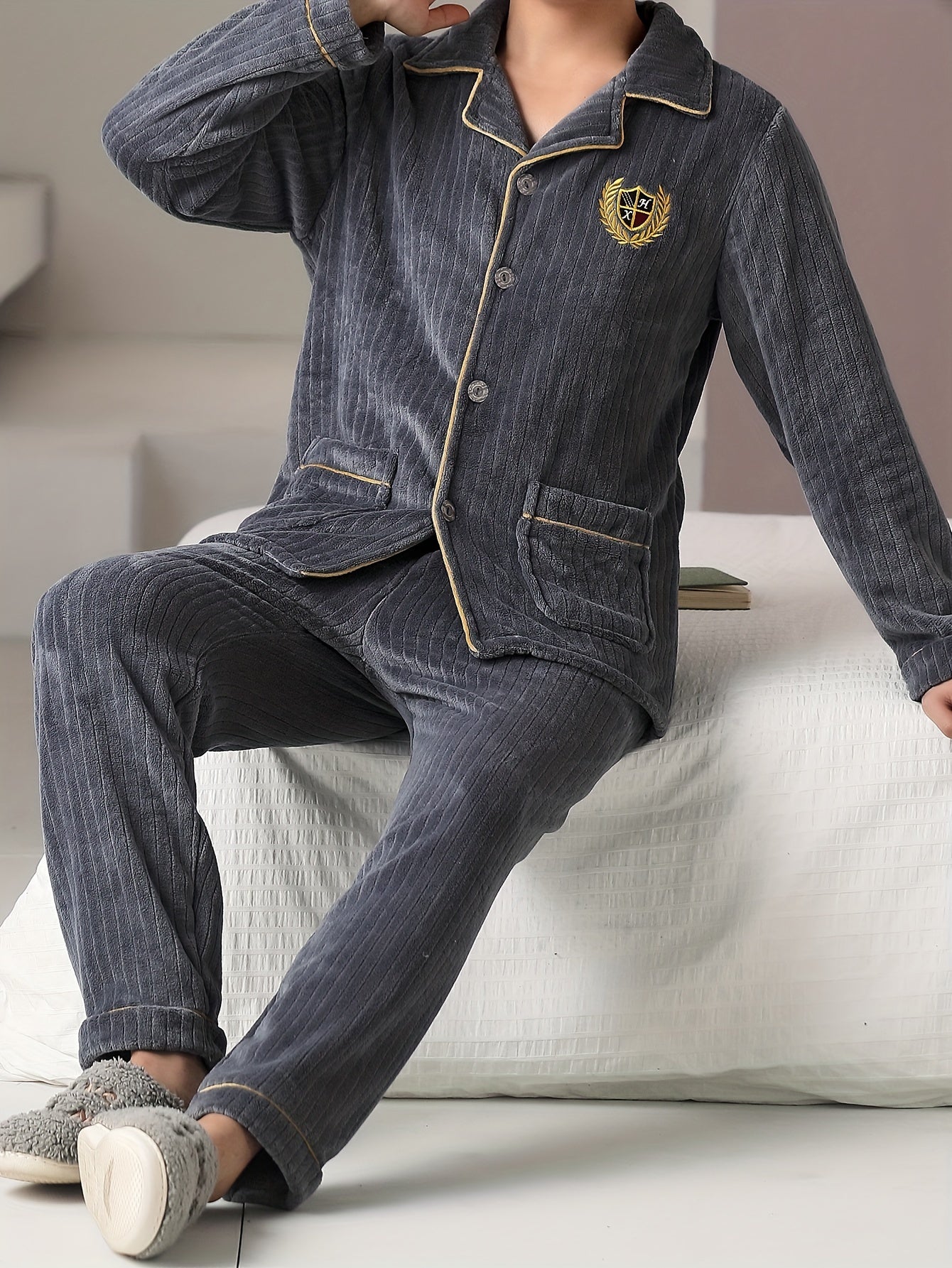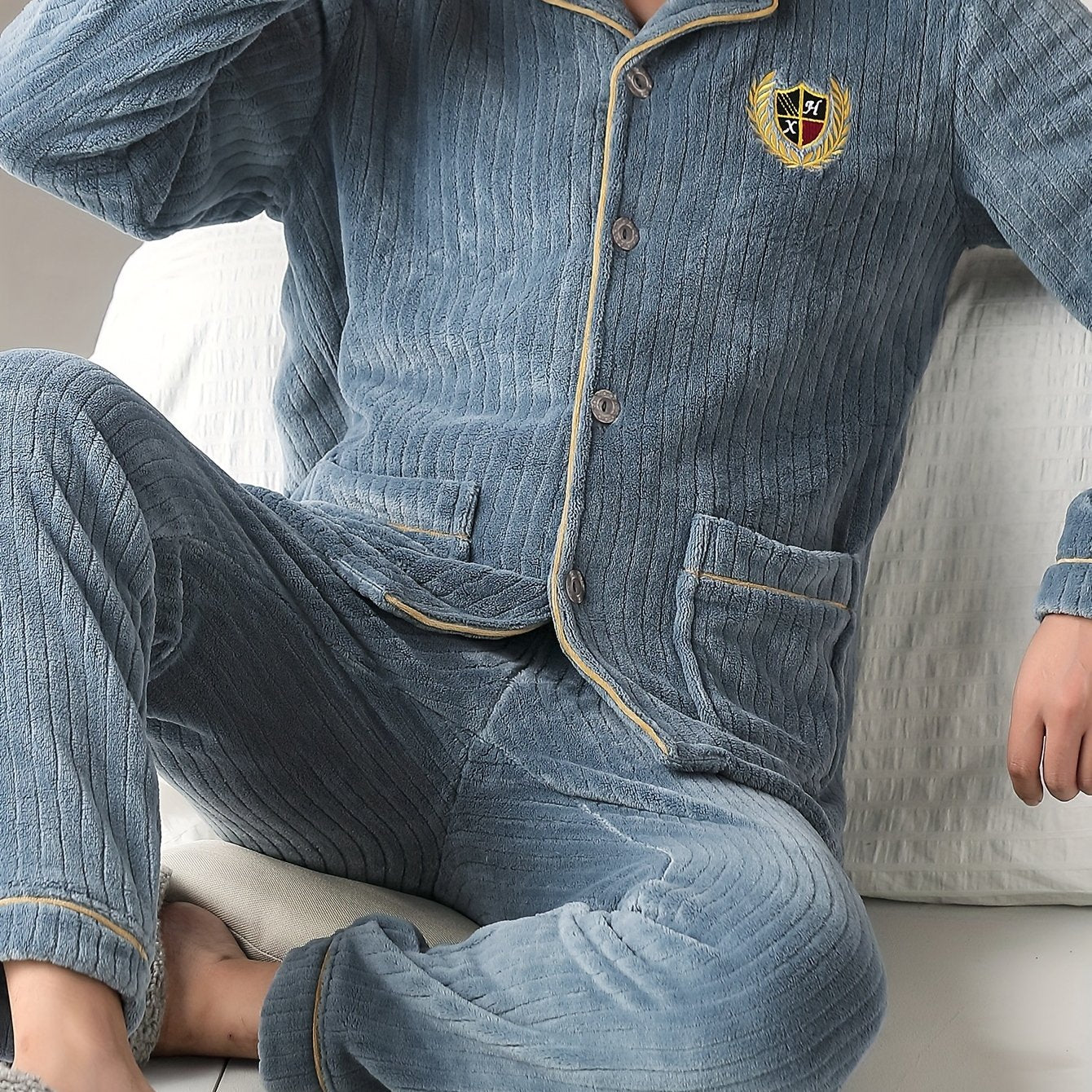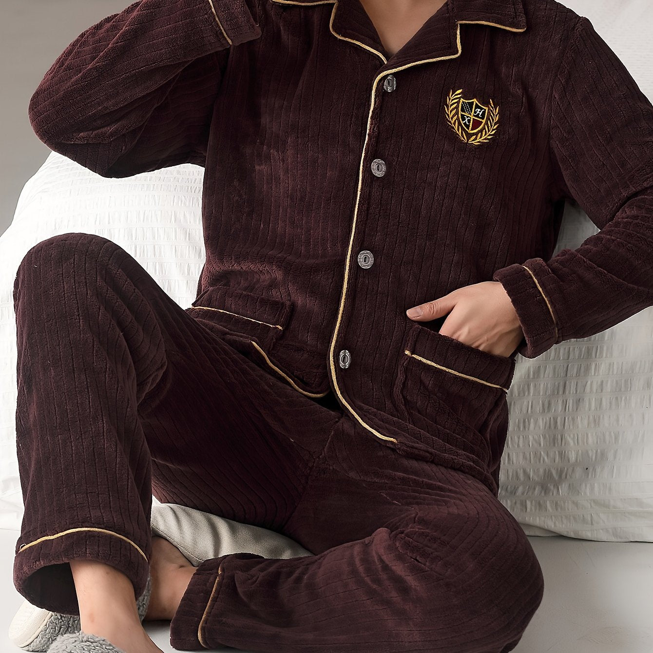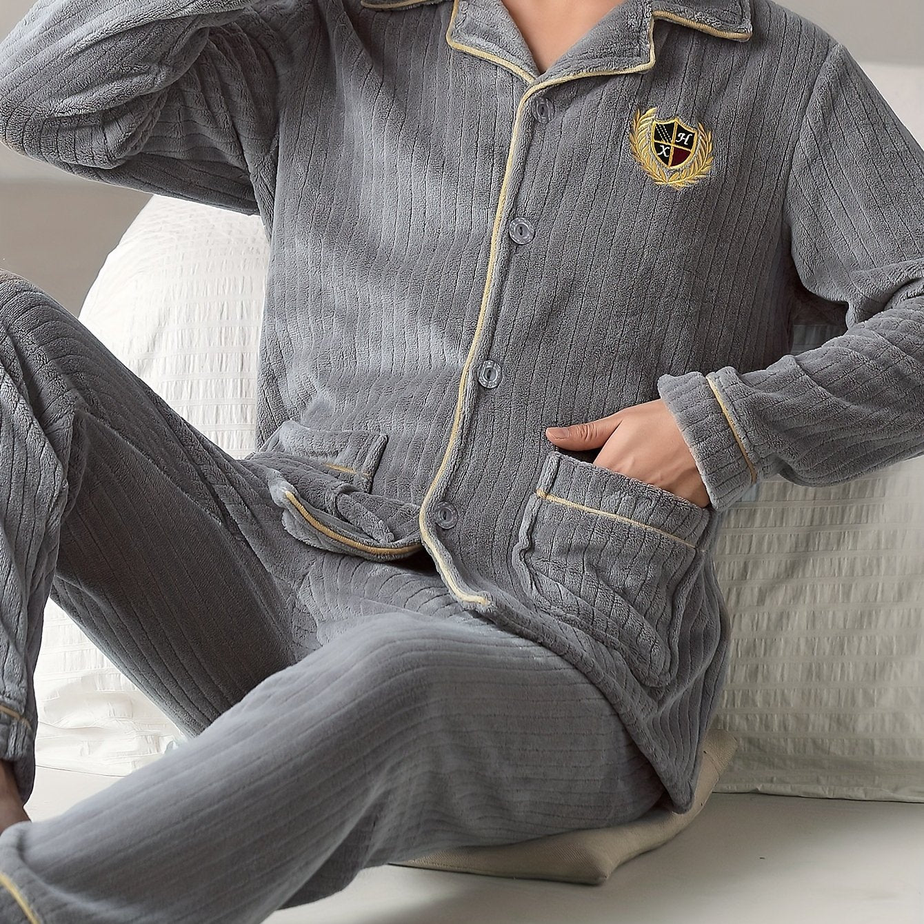 Мужской комплект пижам из фланели с лацканом, топ с длинными рукавами и свободные штаны однотонного цвета