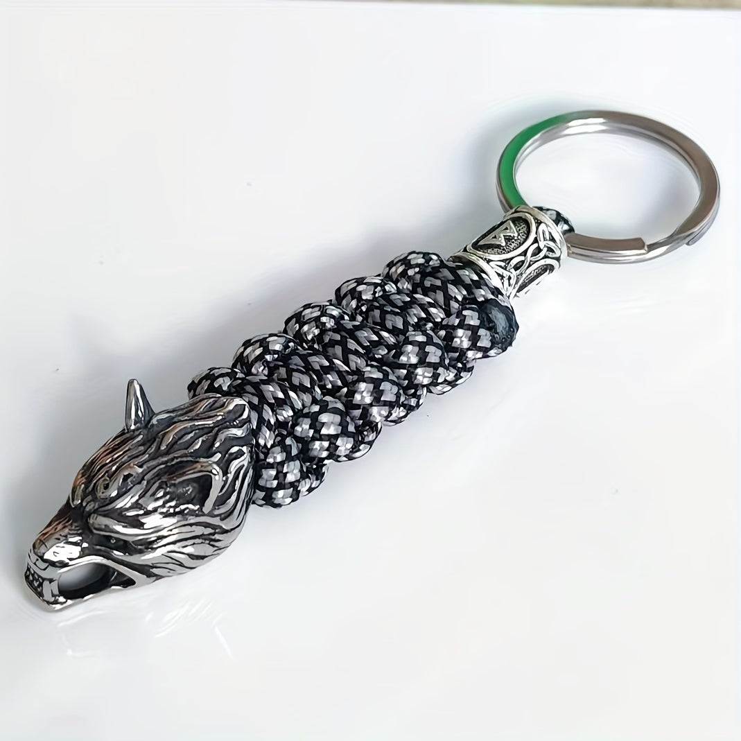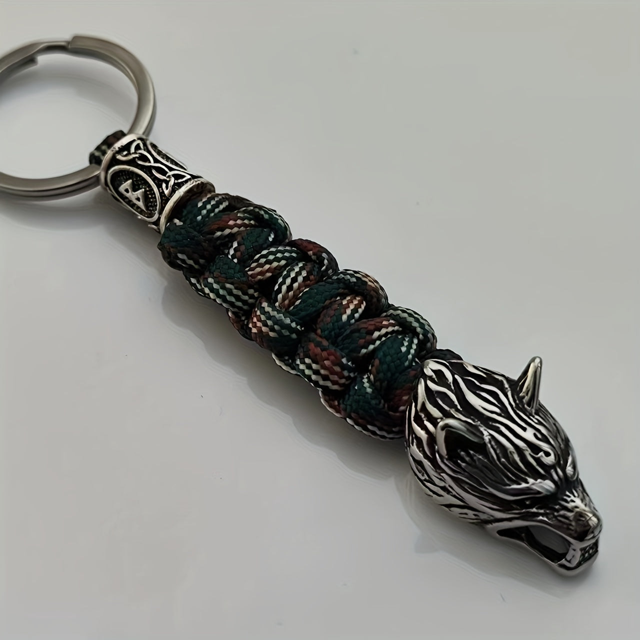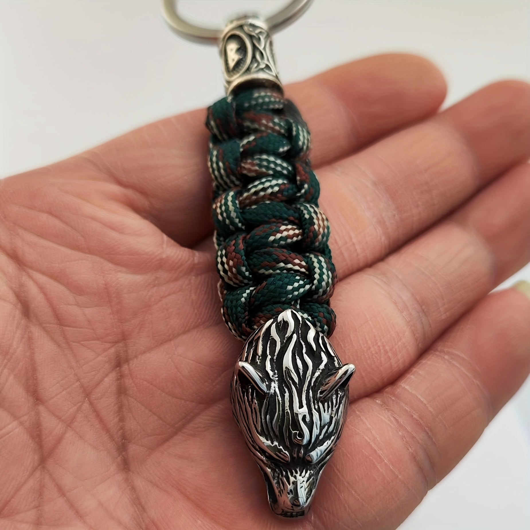 Мужской модный аксессуар: ключница с головой волка викинга из нержавеющей стали - ручное плетение из полиэстера, спортивный и стильный брелок