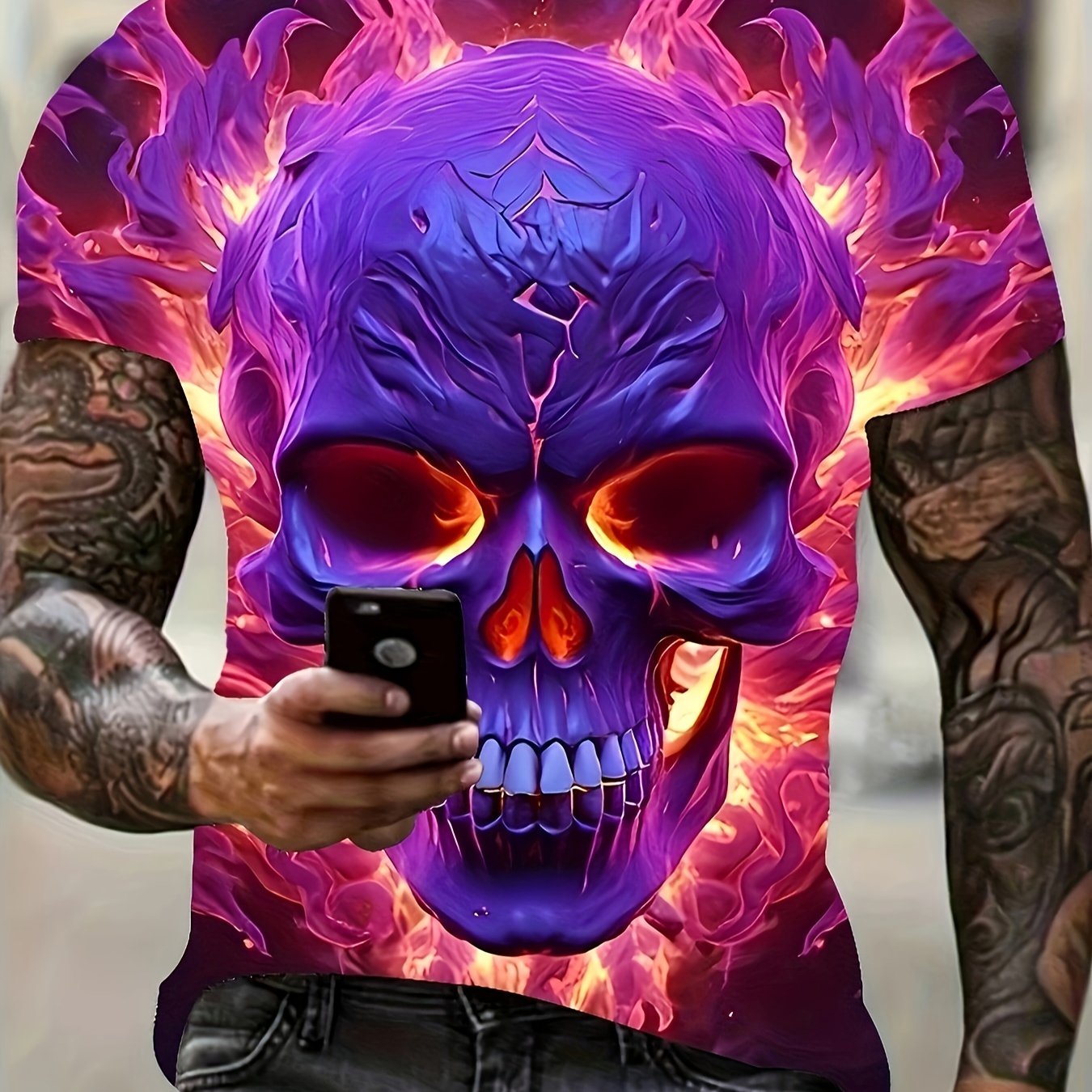 Мужская футболка большого размера с изображением светящегося черепа и пламени, ярко-фиолетовая и розовая, лето, полиэстер