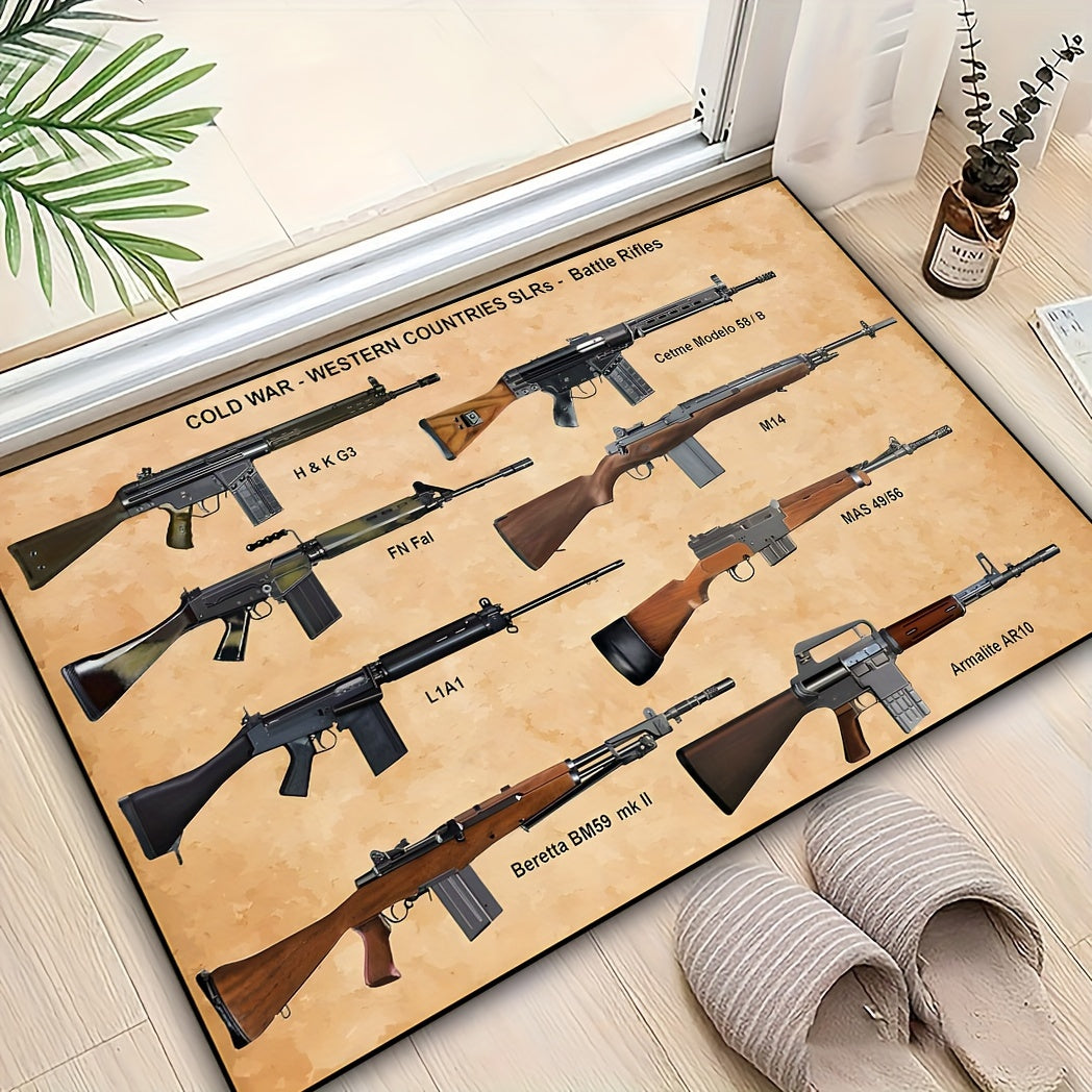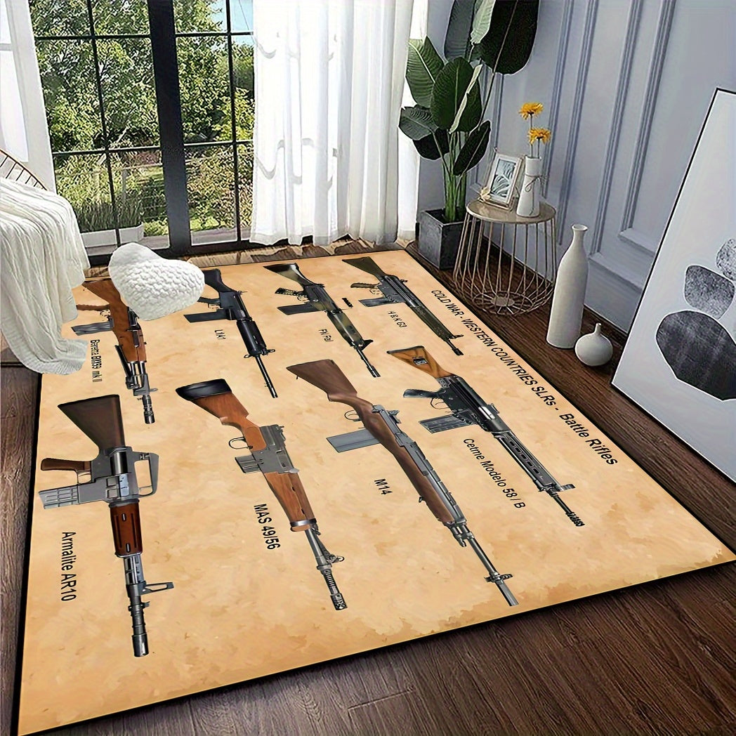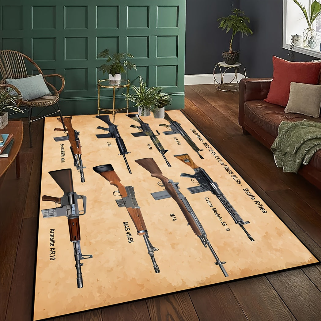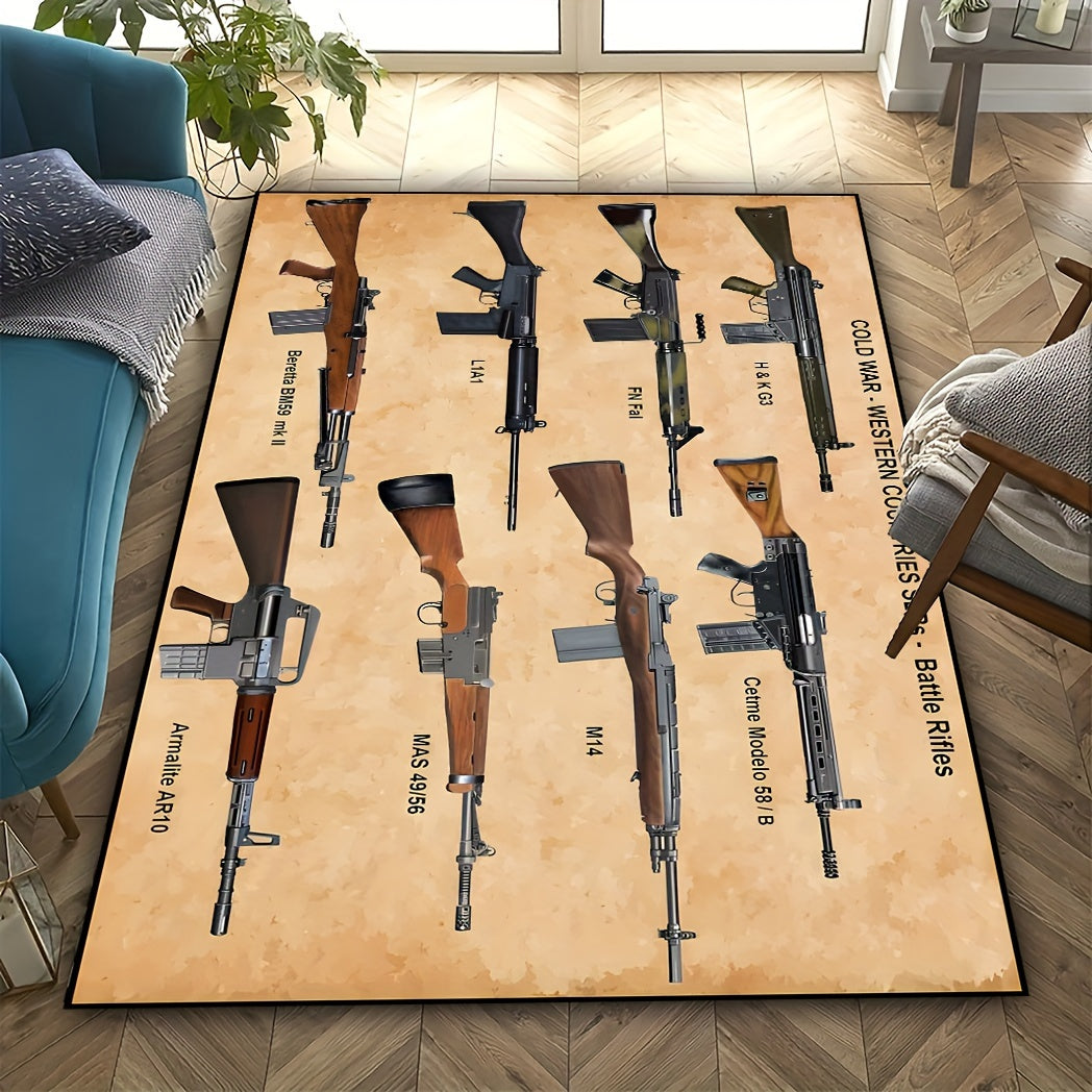 Ковер из полиэфирного волокна с военной тематикой, с различными узорами оружия, предназначен для использования в ванной, гостиной, спальне или ресторане. Устойчив к грязи, можно стирать в машине, нескользящий для дополнительного удобства.