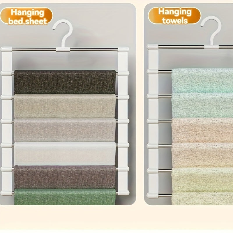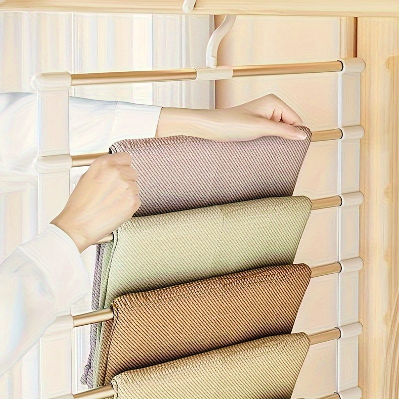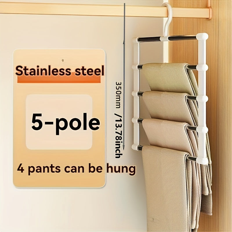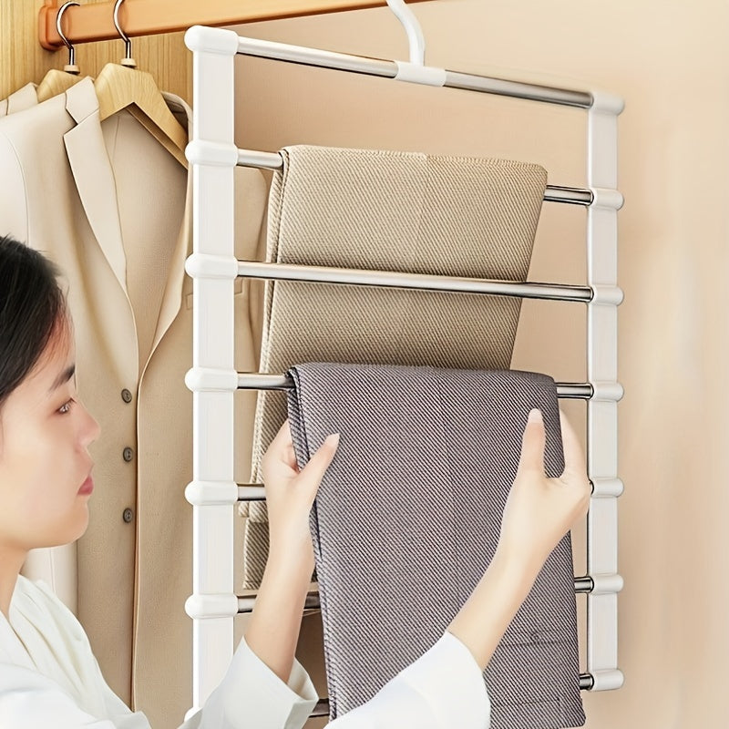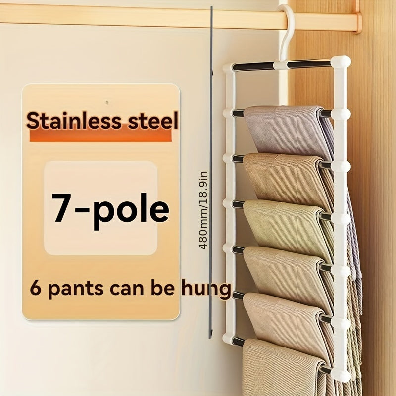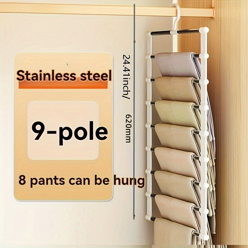 Многоуровневая вешалка для брюк из нержавеющей стали с складным дизайном и белыми пластиковыми заглушками для экономии места и организации одежды.