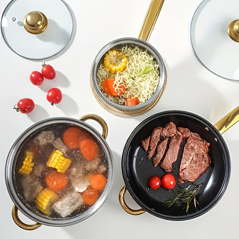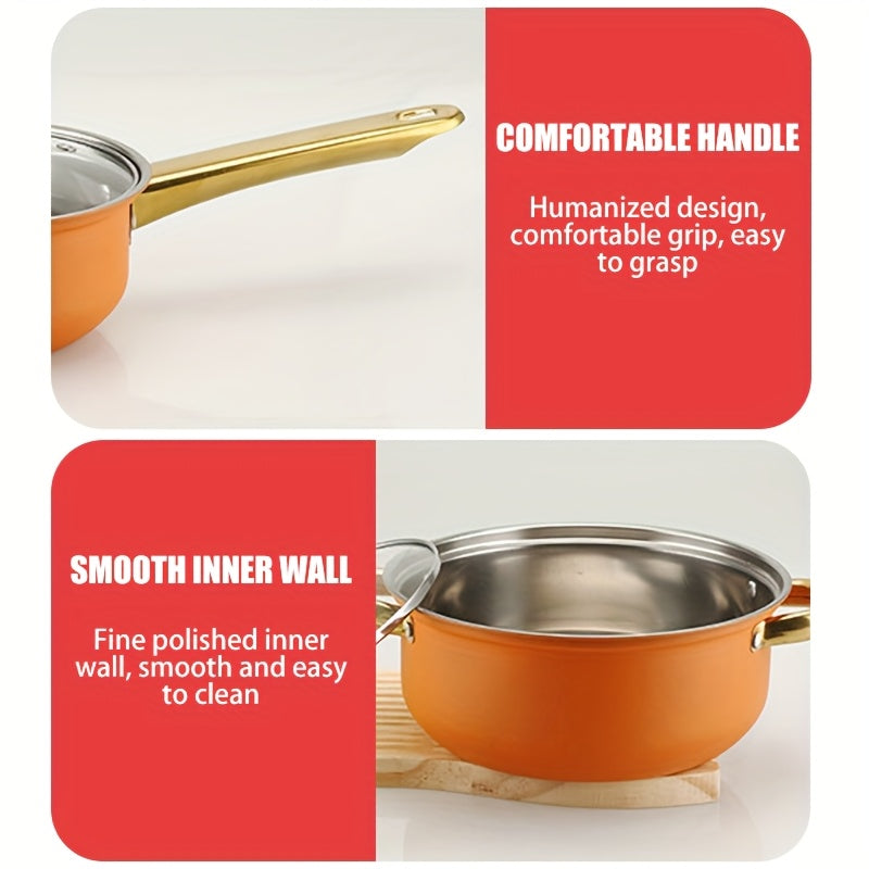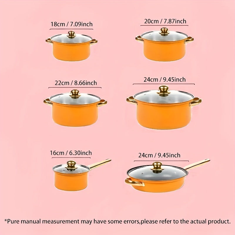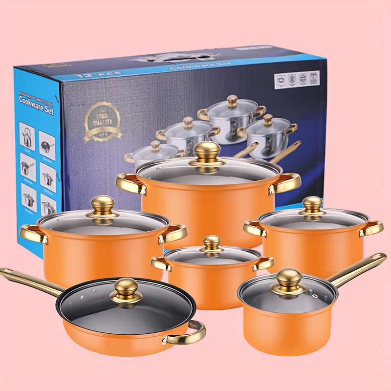 Оранжевый 12-частей набор кухонной посуды из нержавеющей стали для домашнего использования - включает кастрюлю для супа, сковороду, молочную кастрюлю и многое другое для универсальной готовки