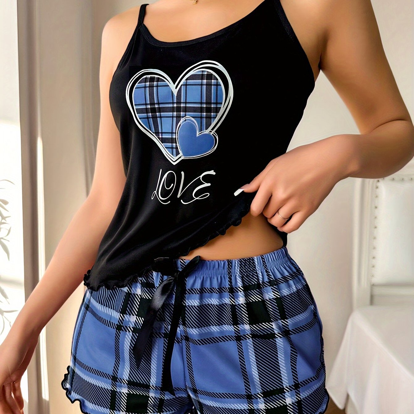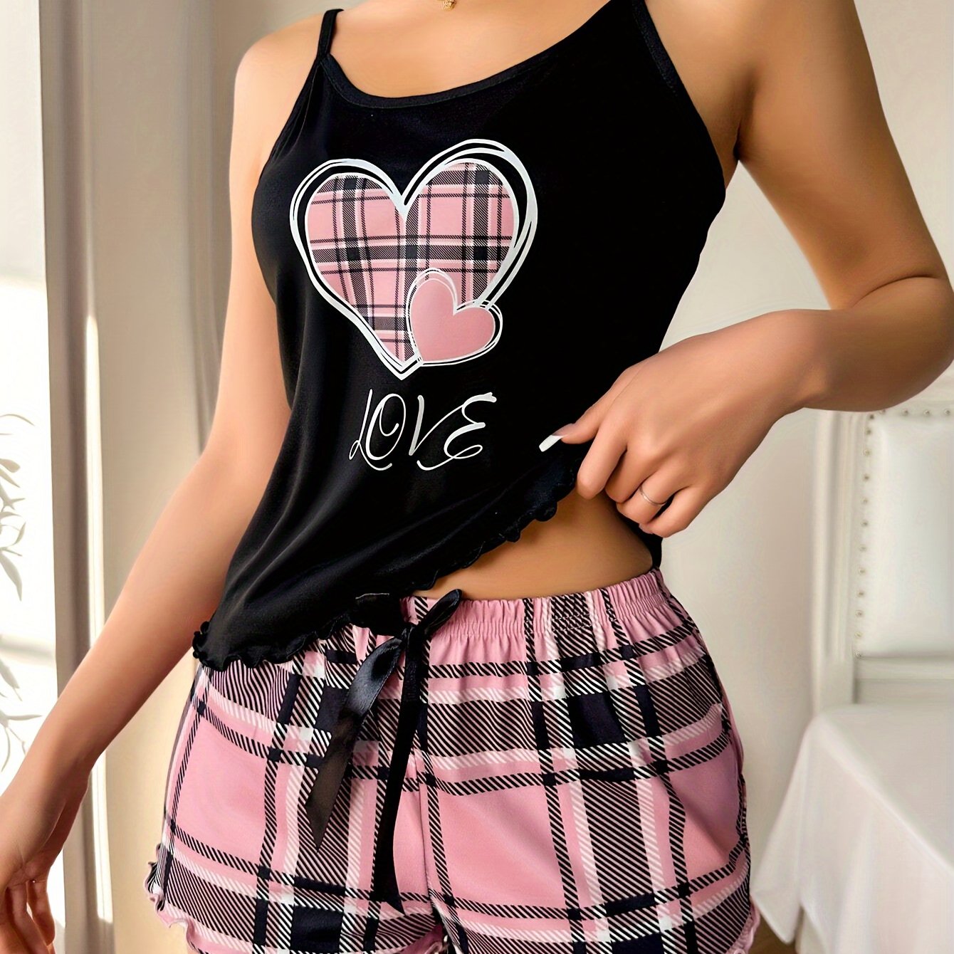 Пижамный комплект с узором в клетку для женщин, безрукавный топ на бретельках с шортами и поясом, пуловер из трикотажной ткани, универсальная ночная одежда.