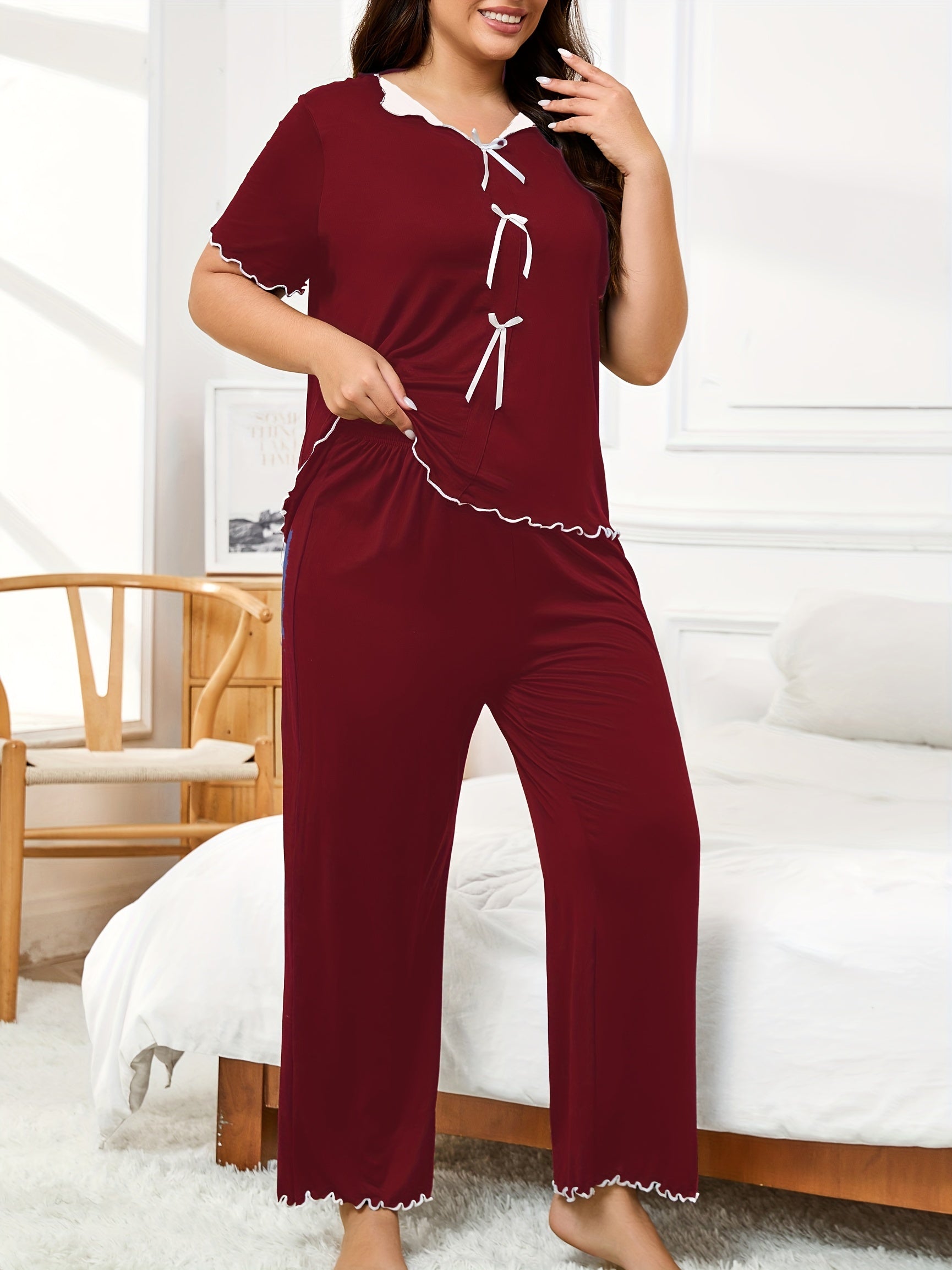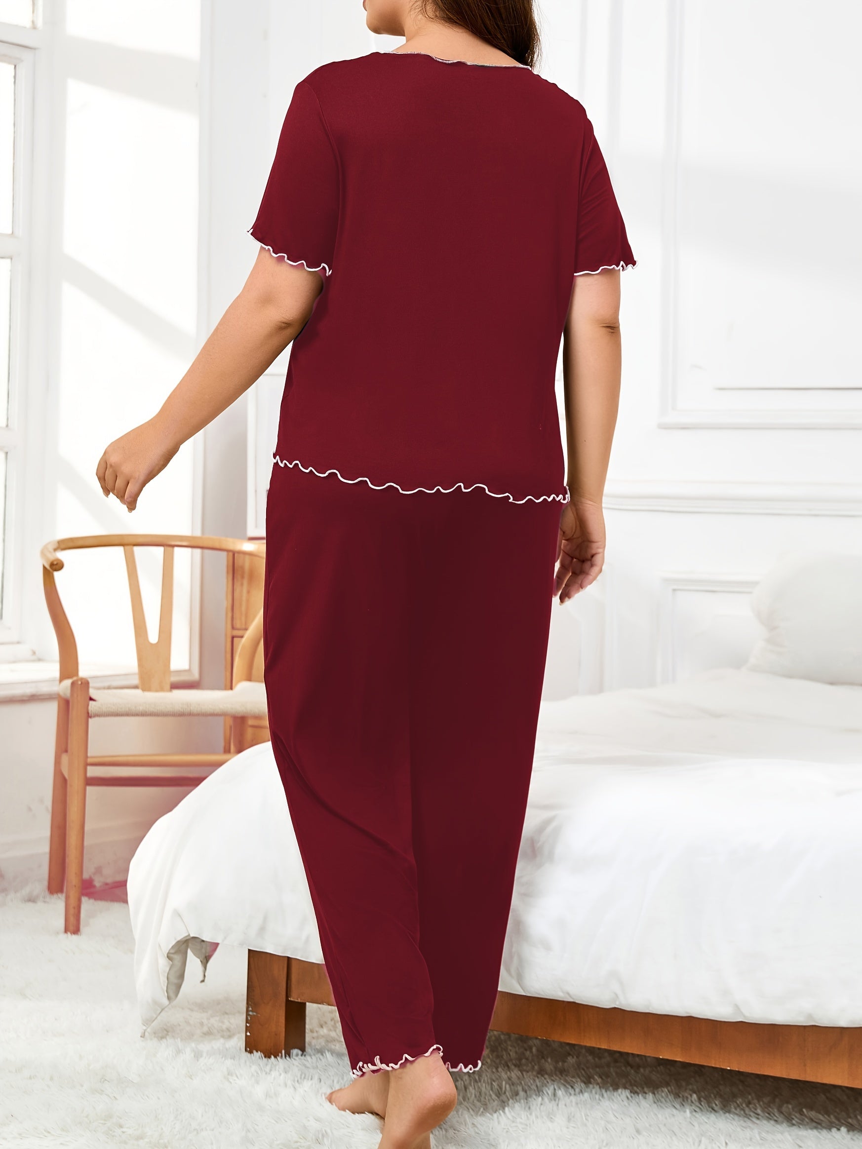 Плюс-сайз черный трикотажный пижамный комплект с кружевной отделкой, топ с коротким рукавом и длинные штаны, ночная одежда для всех сезонов