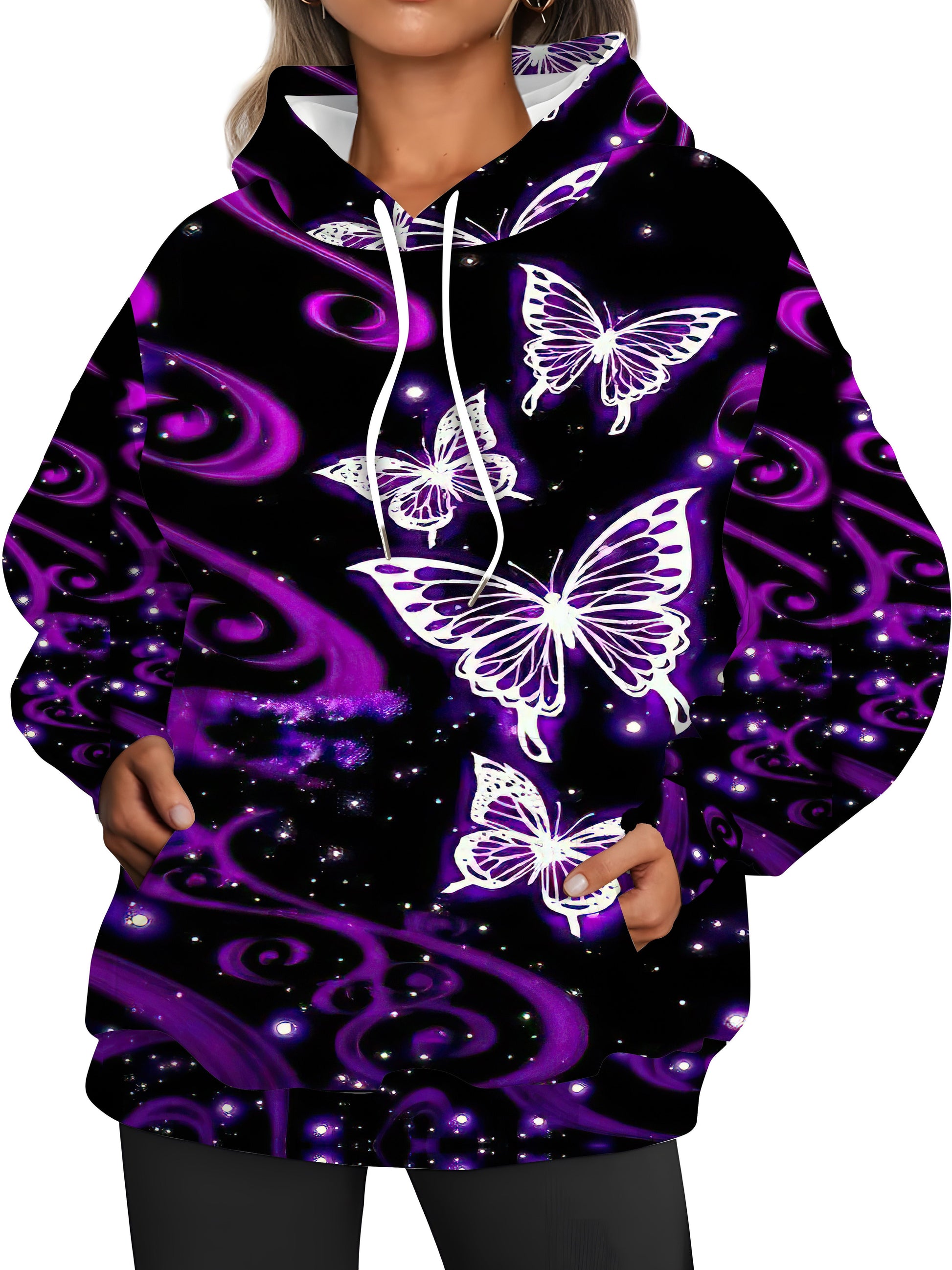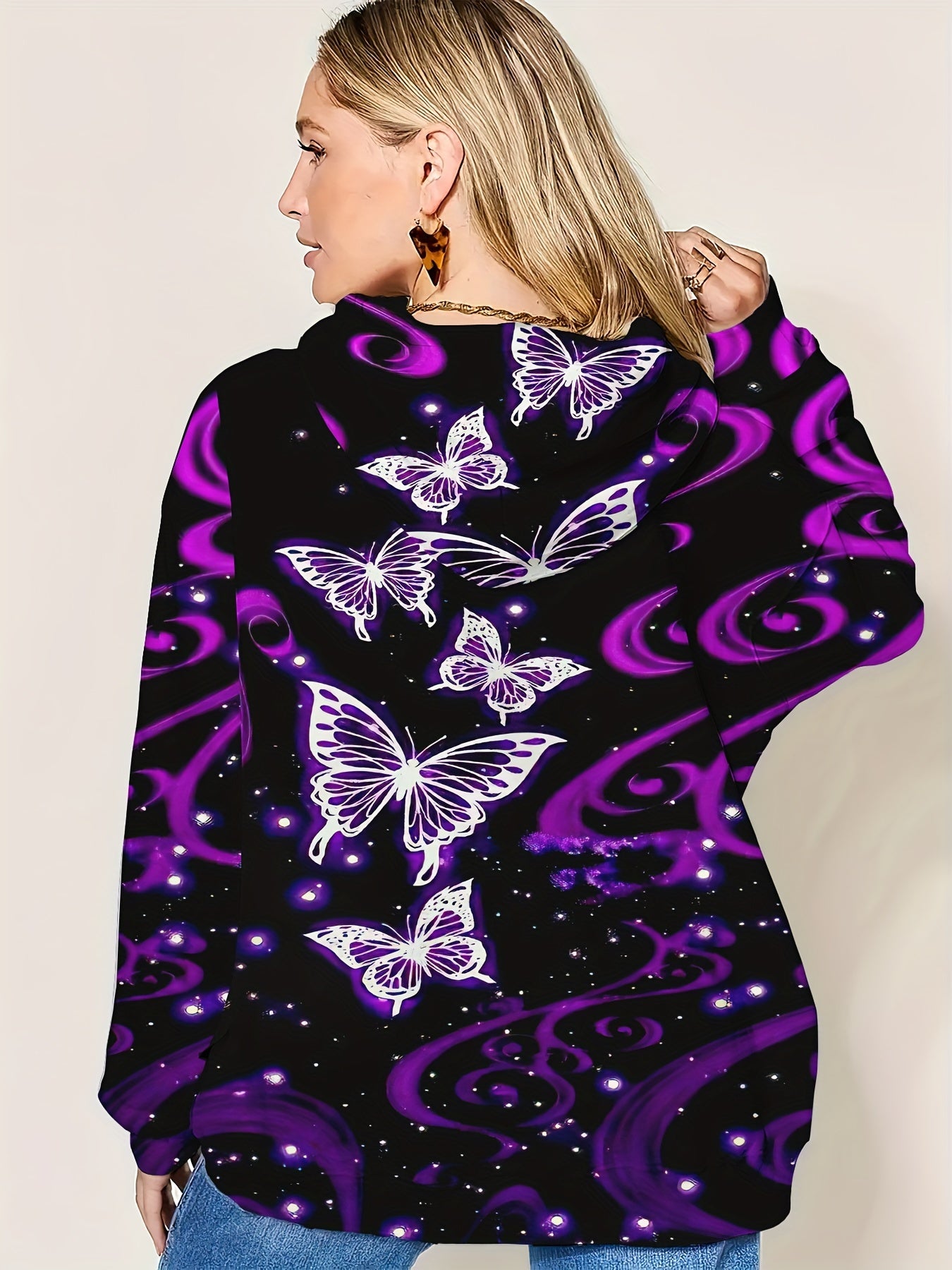 Толстовка с принтом бабочки для полных женщин, с длинными рукавами и капюшоном, на шнурке