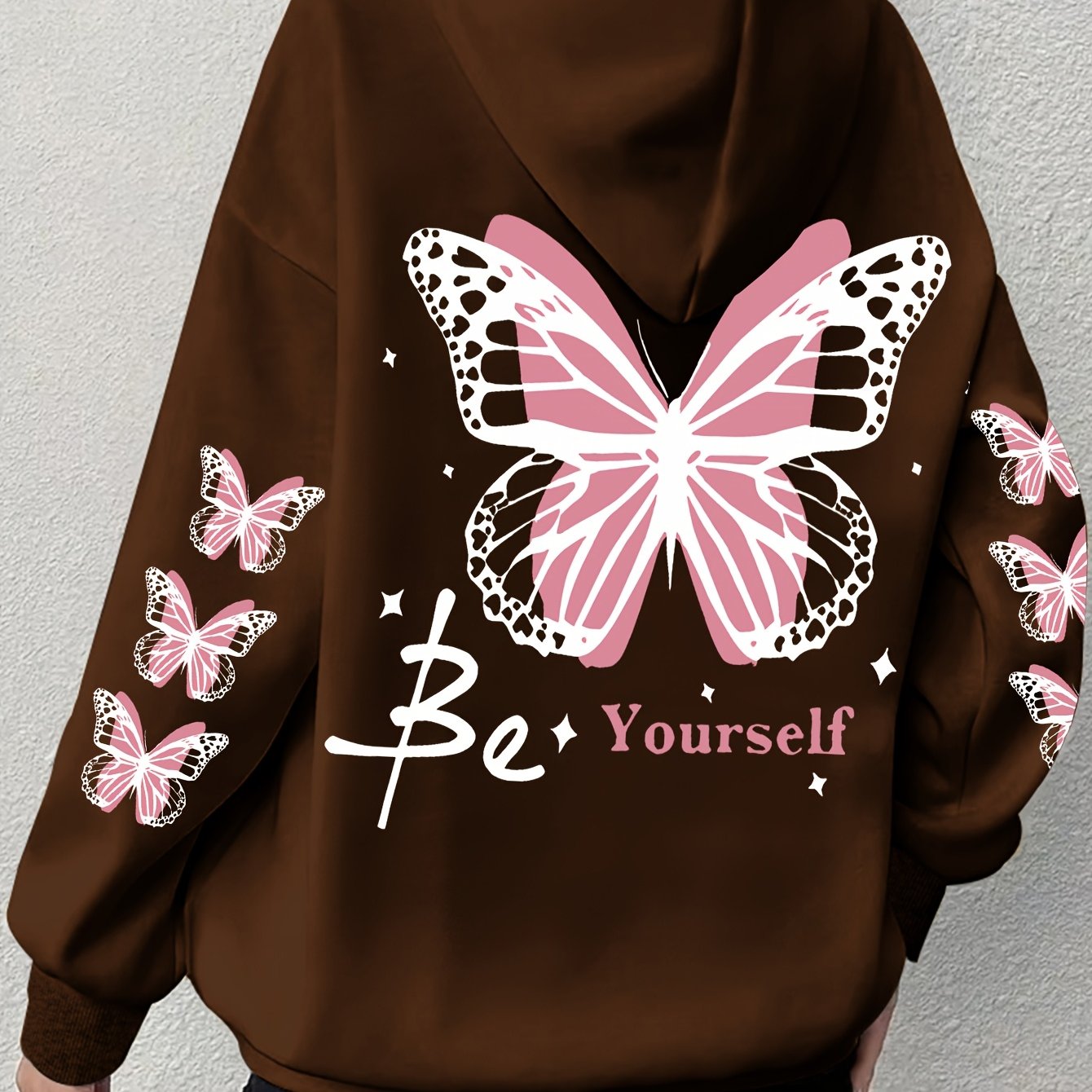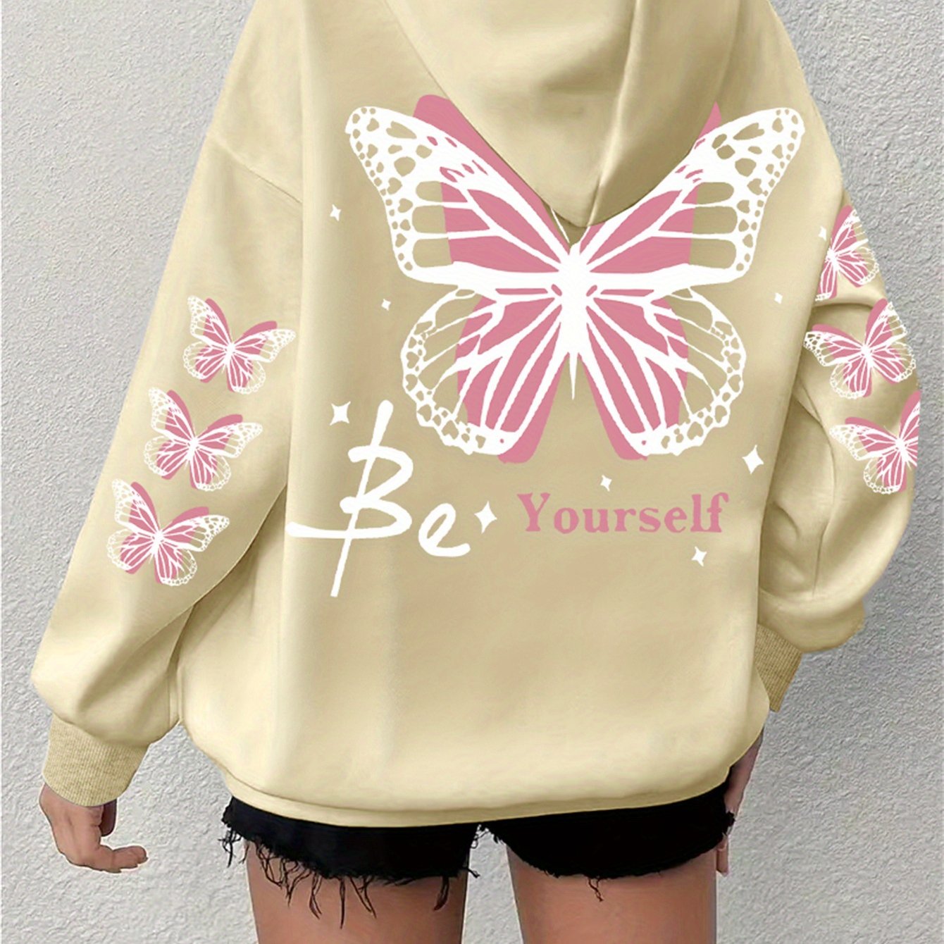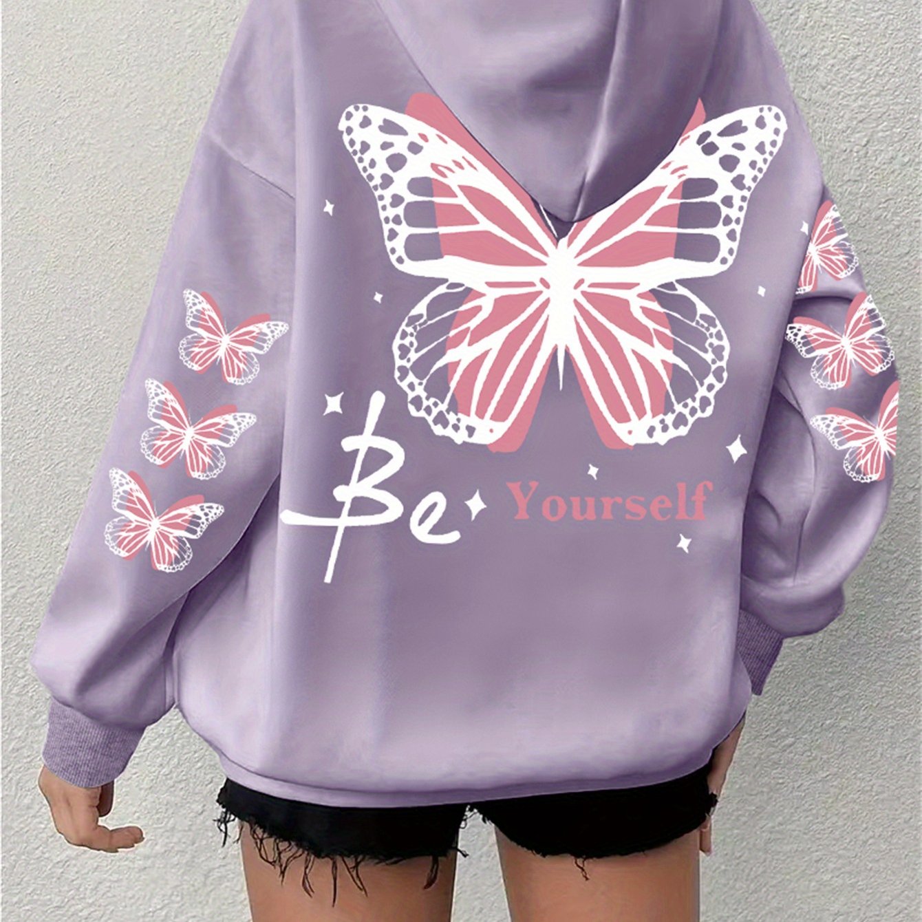 Толстовка с принтом бабочки для полных женщин, повседневная с длинными рукавами и капюшоном, на шнурке