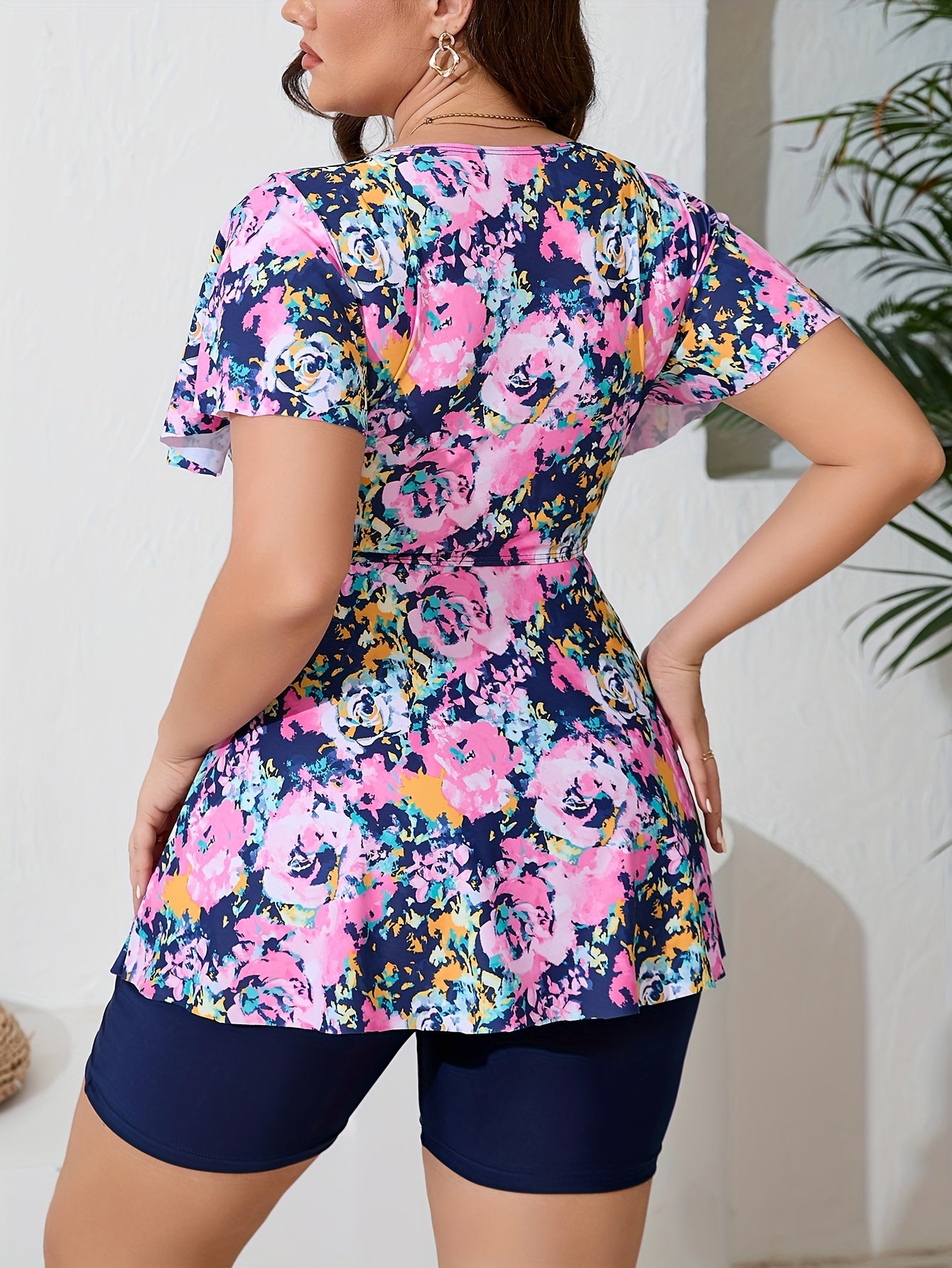 Комплект танкини с крупным цветочным принтом, топ с V-образным вырезом и шортиками-бой shorts
