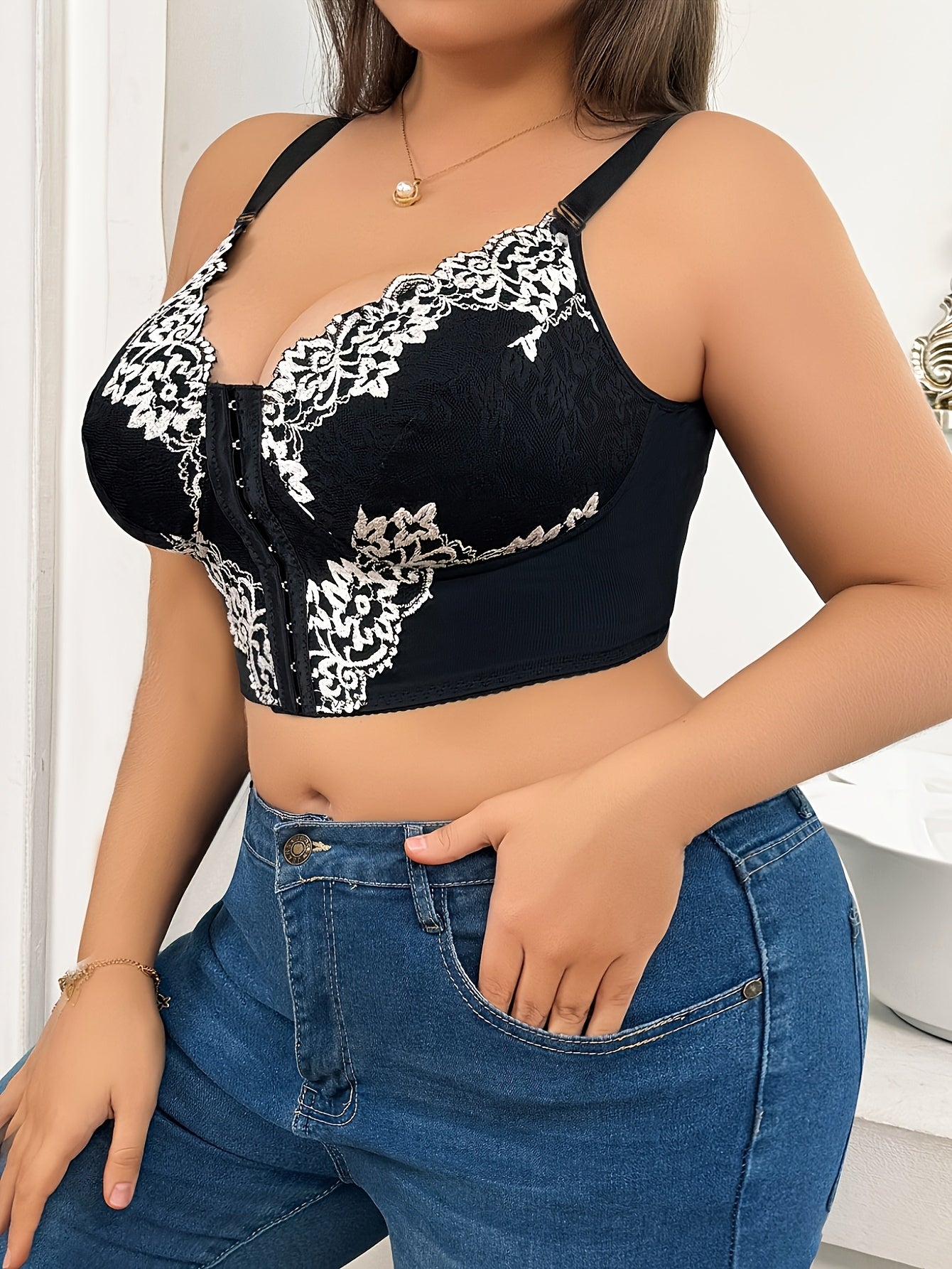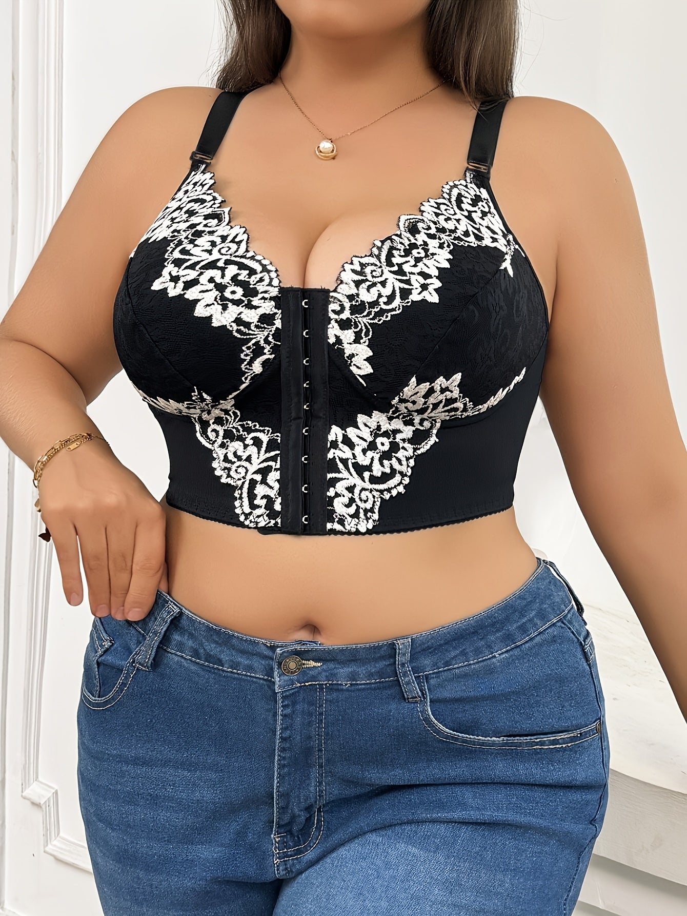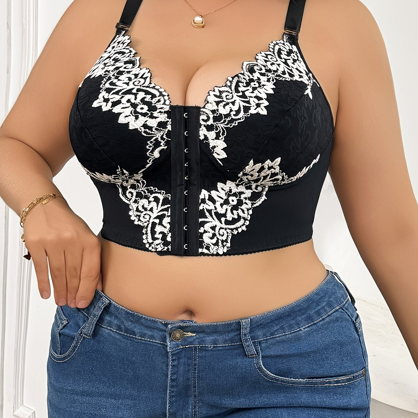 Бюстгальтер с кружевной передней застежкой для полных размеров, с цветочным принтом, контрастным кружевом, широкими плечевыми ремнями, черный и белый