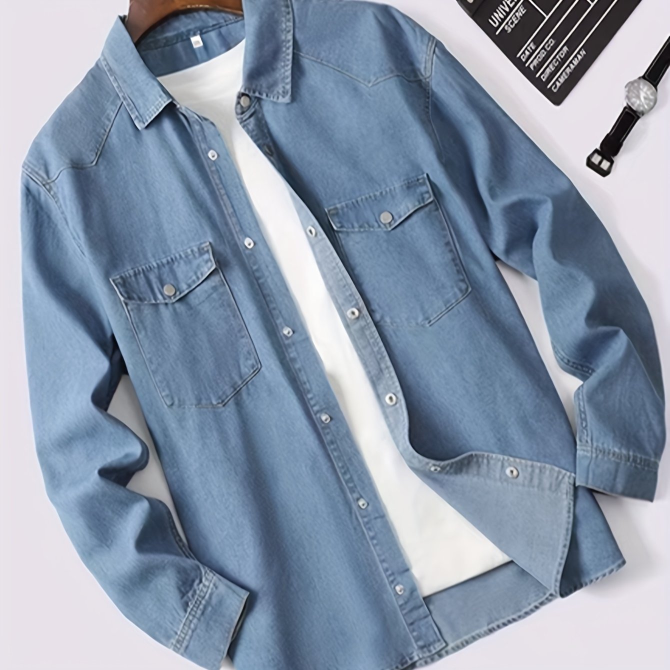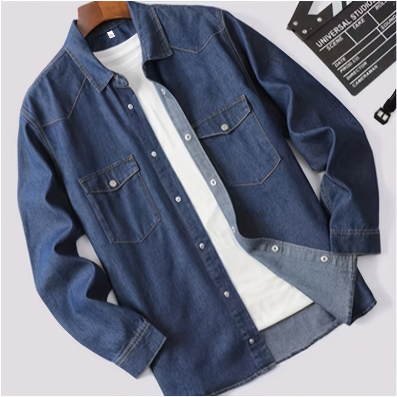 Мужская винтажная джинсовая рубашка больших размеров однотонного цвета, повседневная, для весны и осени