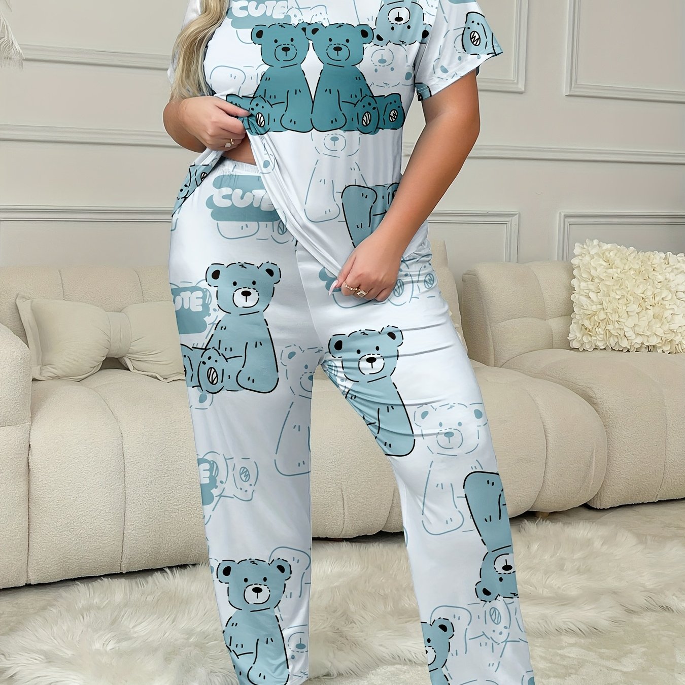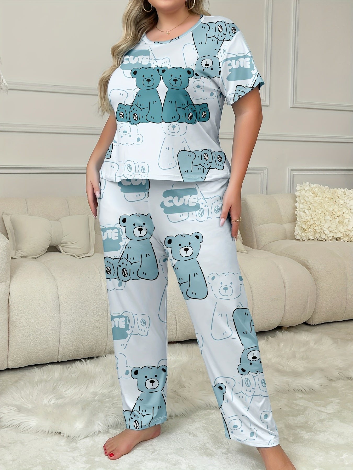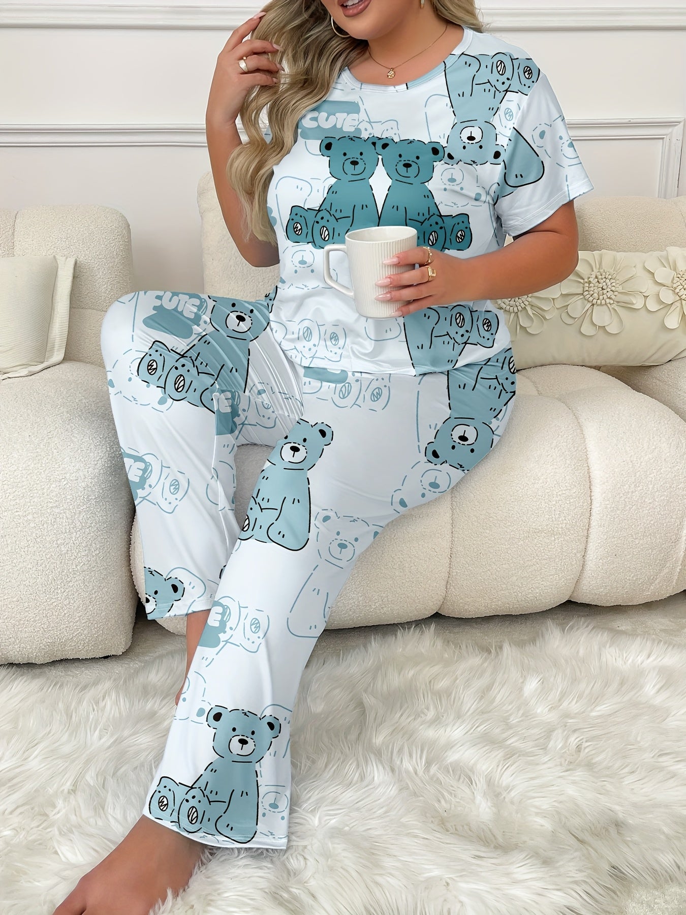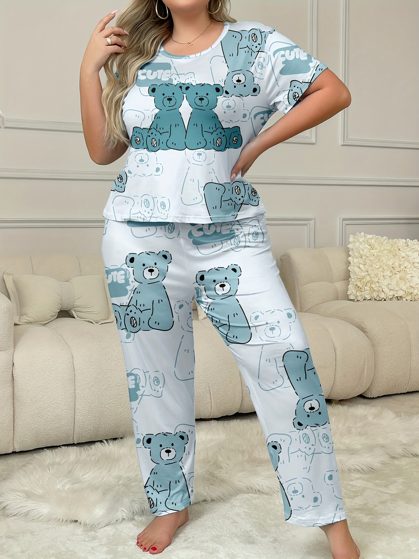 Пижама с принтом плюшевого медведя для полных женщин с коротким рукавом и длинными брюками