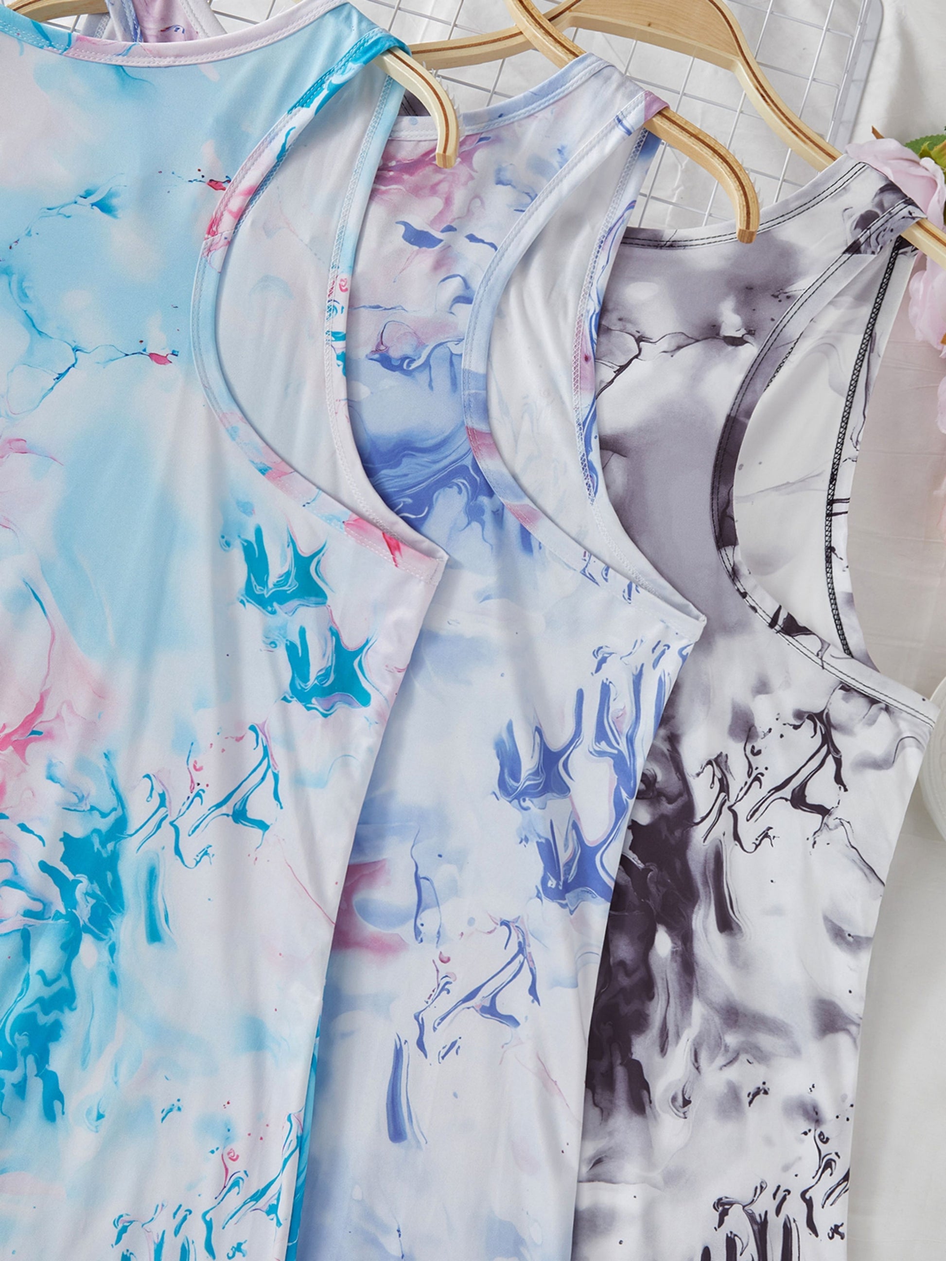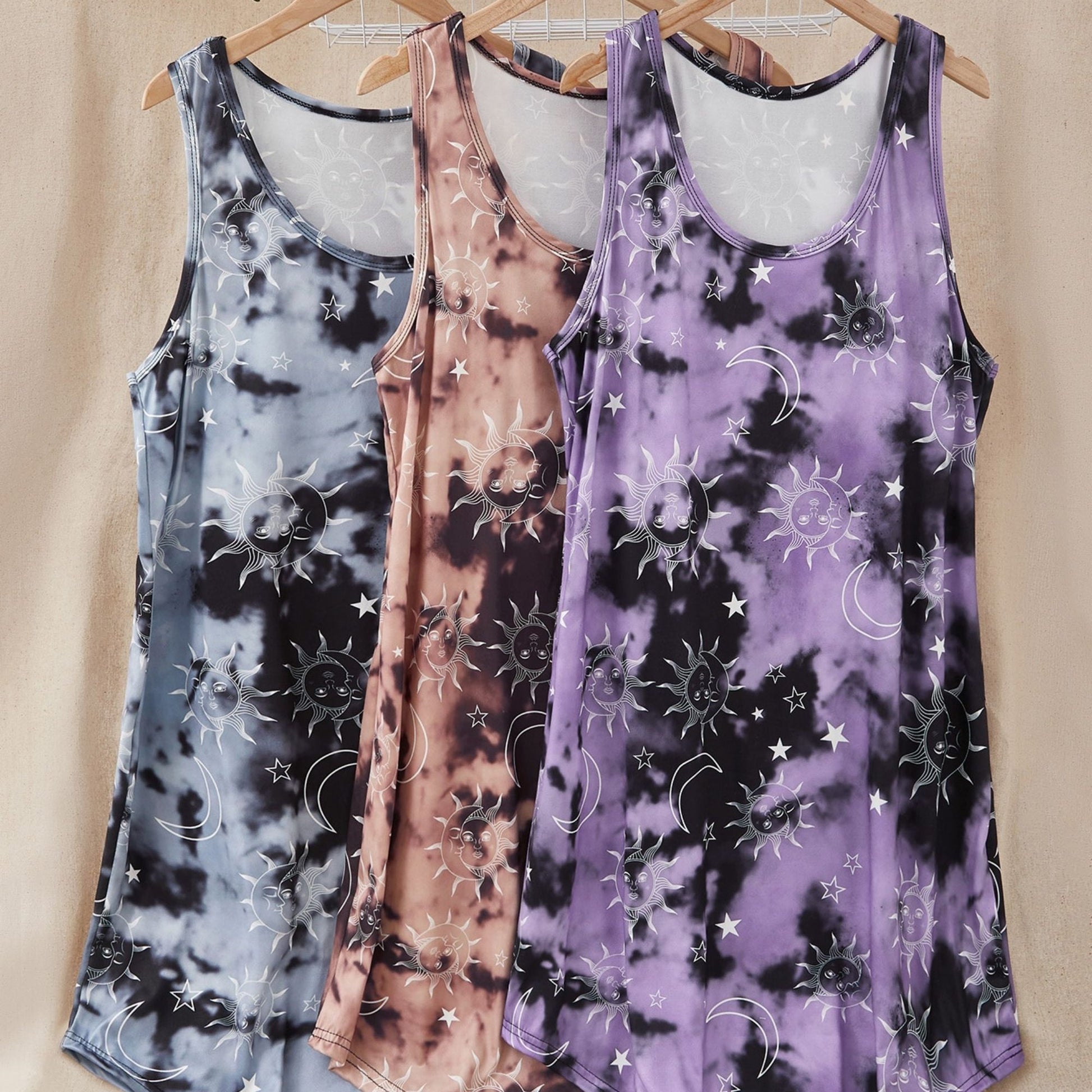 Plus Size Women's Bohemian Tie-Dye Tank Dress with Sun and Moon Floral Print