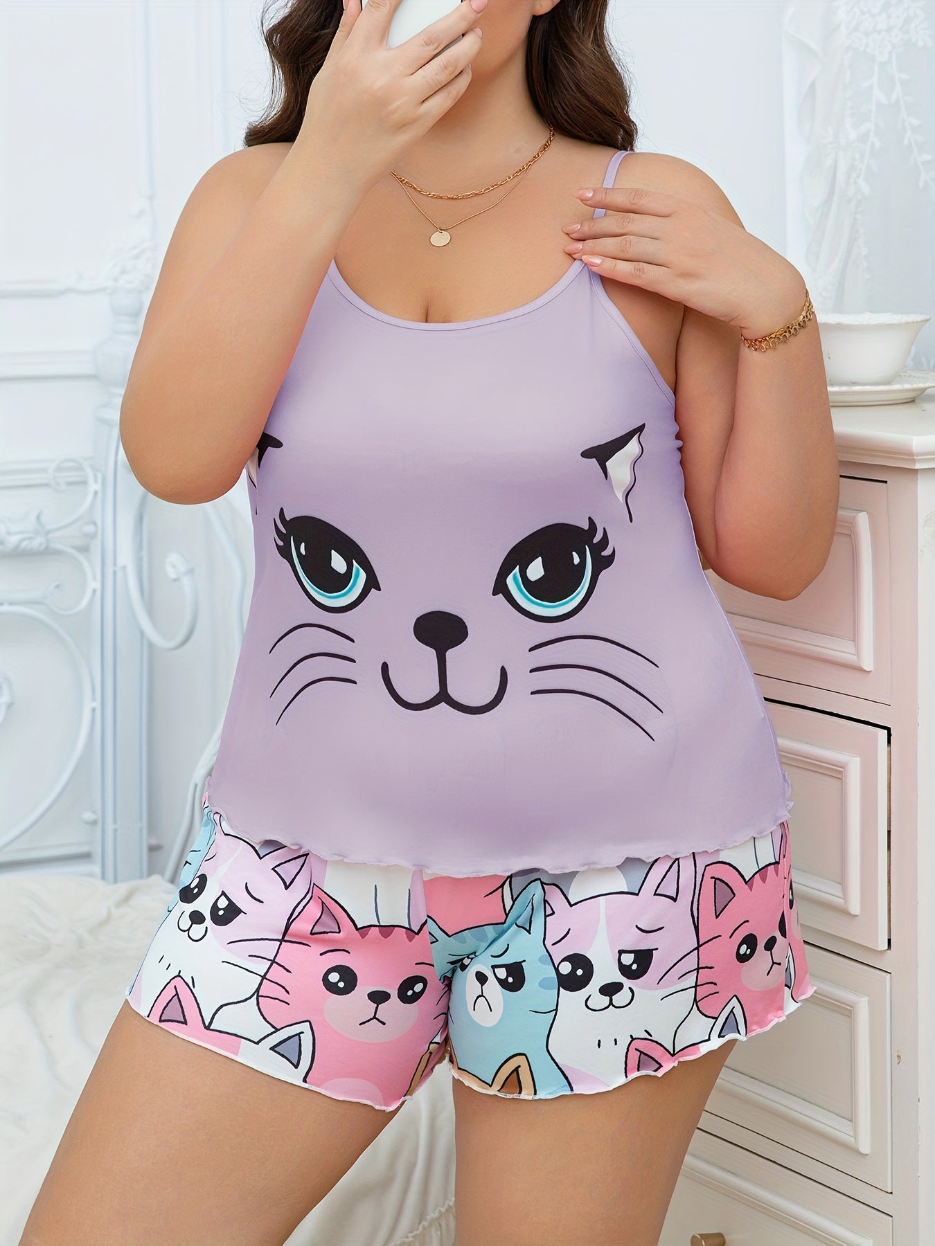 Plus Size Women's Cotton Cat Print Camisole Shorts Set