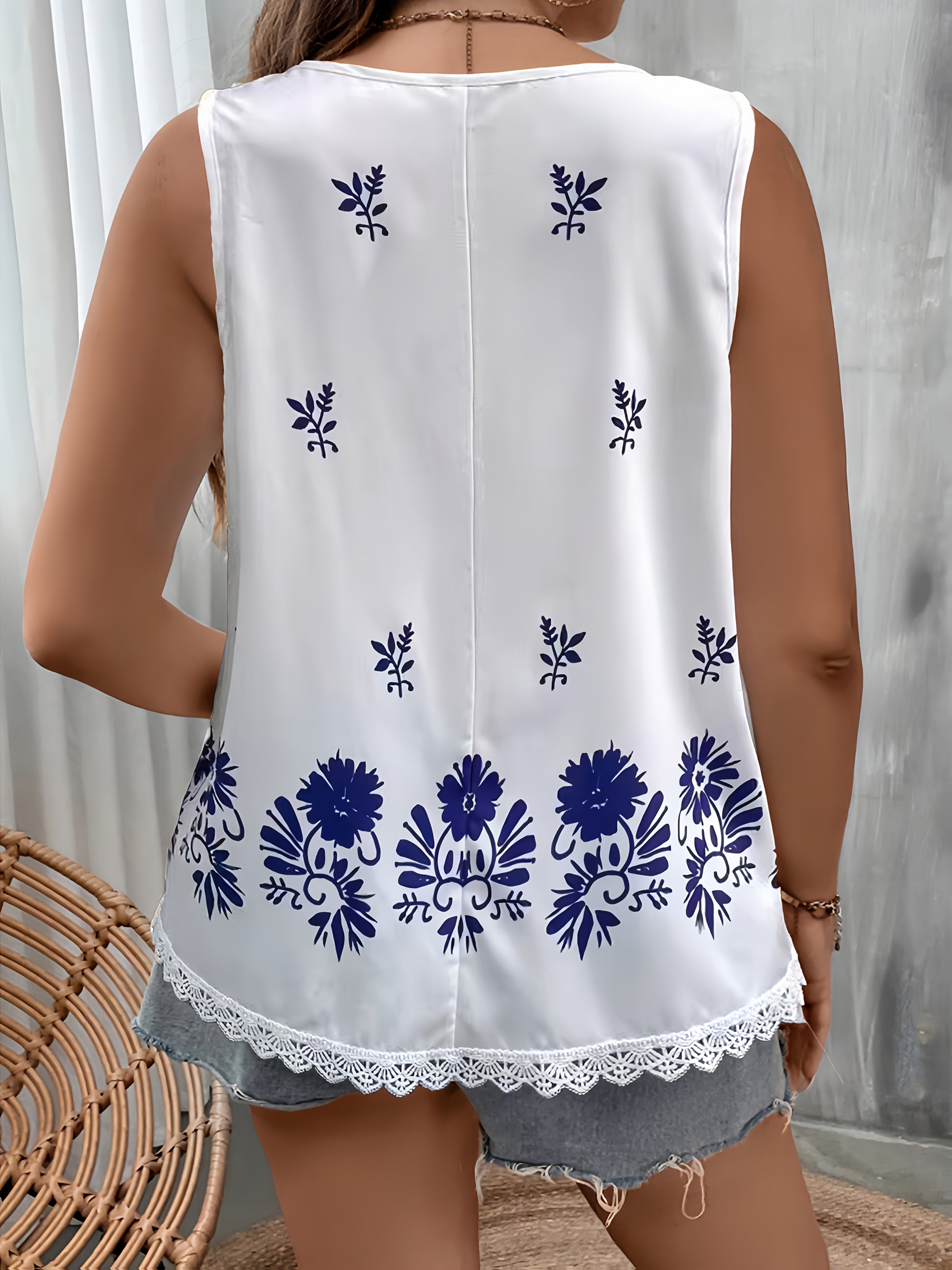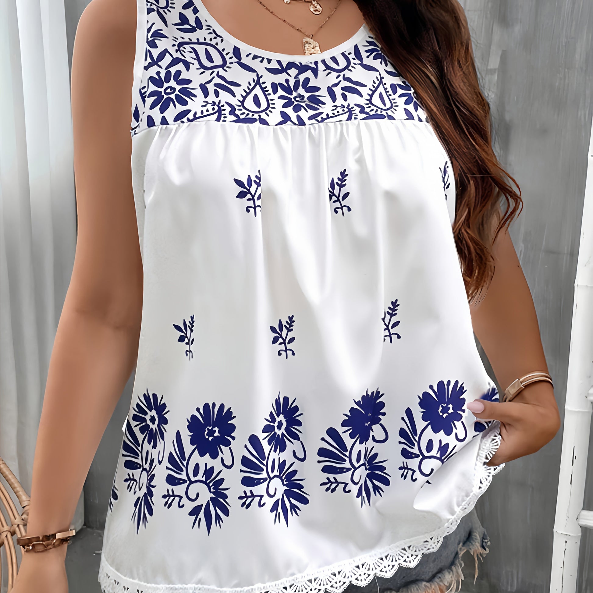 Топ без рукавов для женщин больших размеров с цветочным принтом и кружевной отделкой, летняя блузка