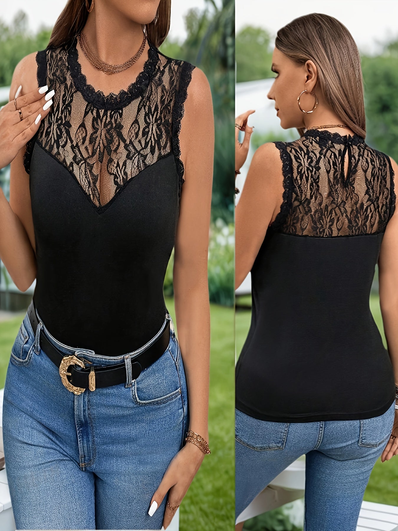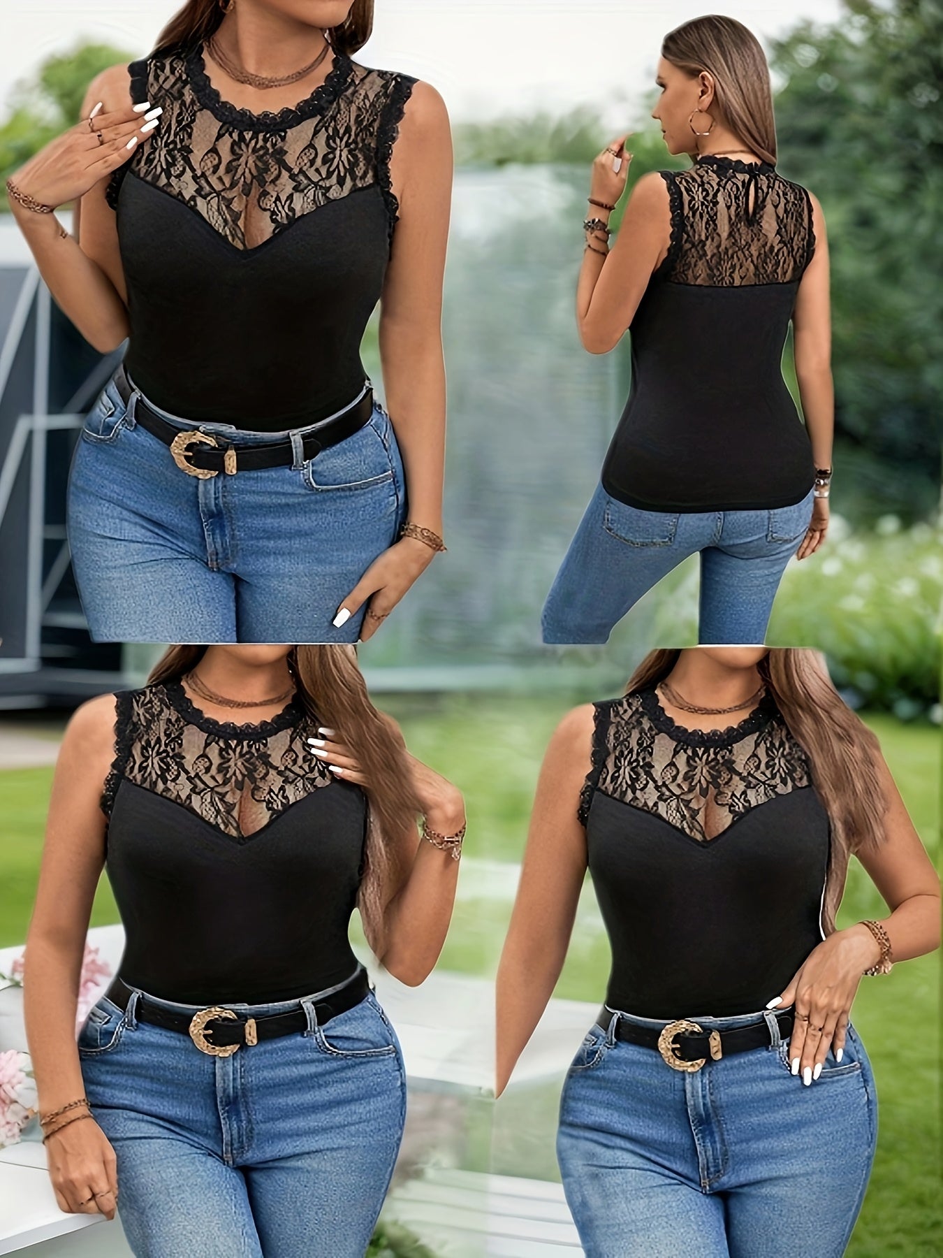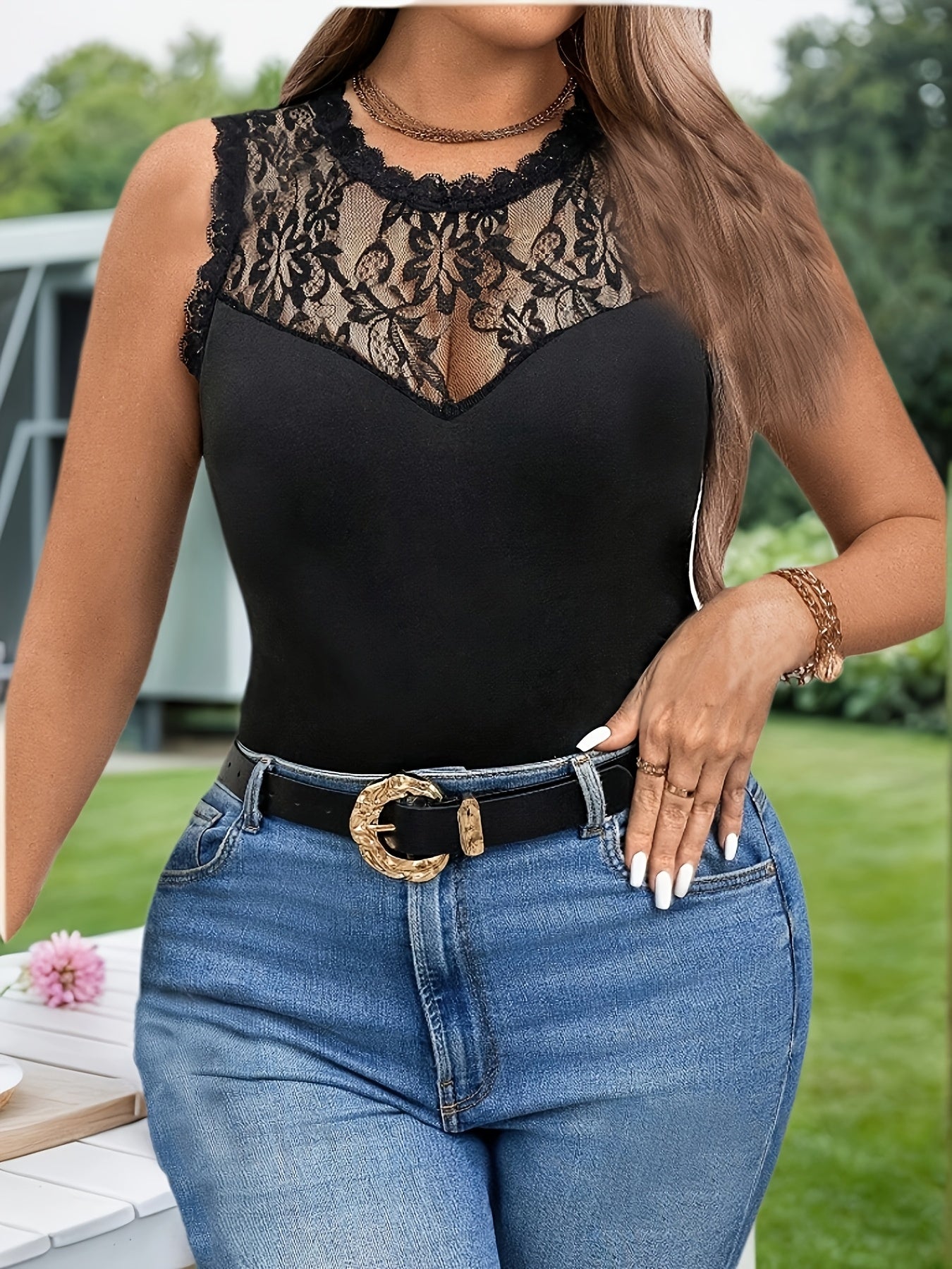 Женский топ без рукавов с кружевной отделкой для полных, черный с цветочным узором, вязаный