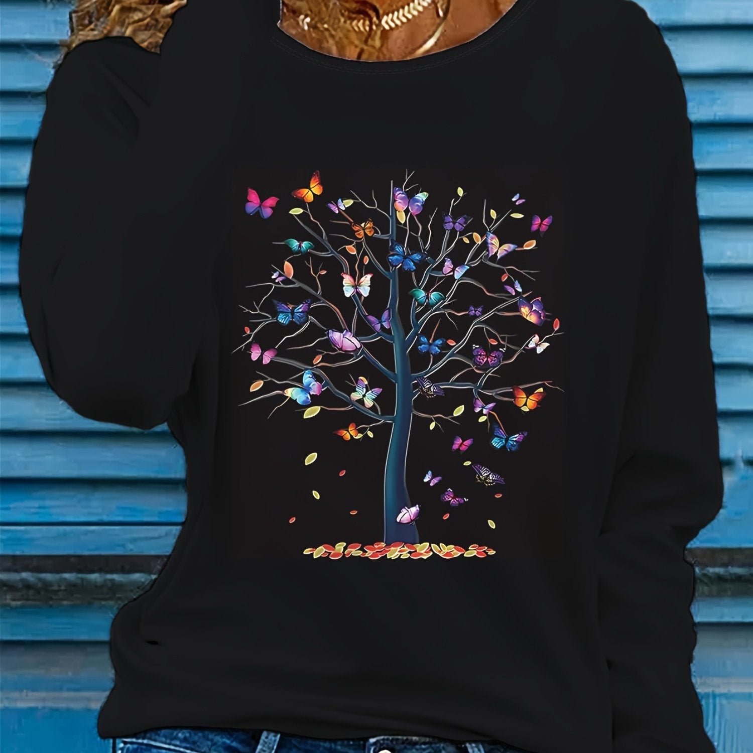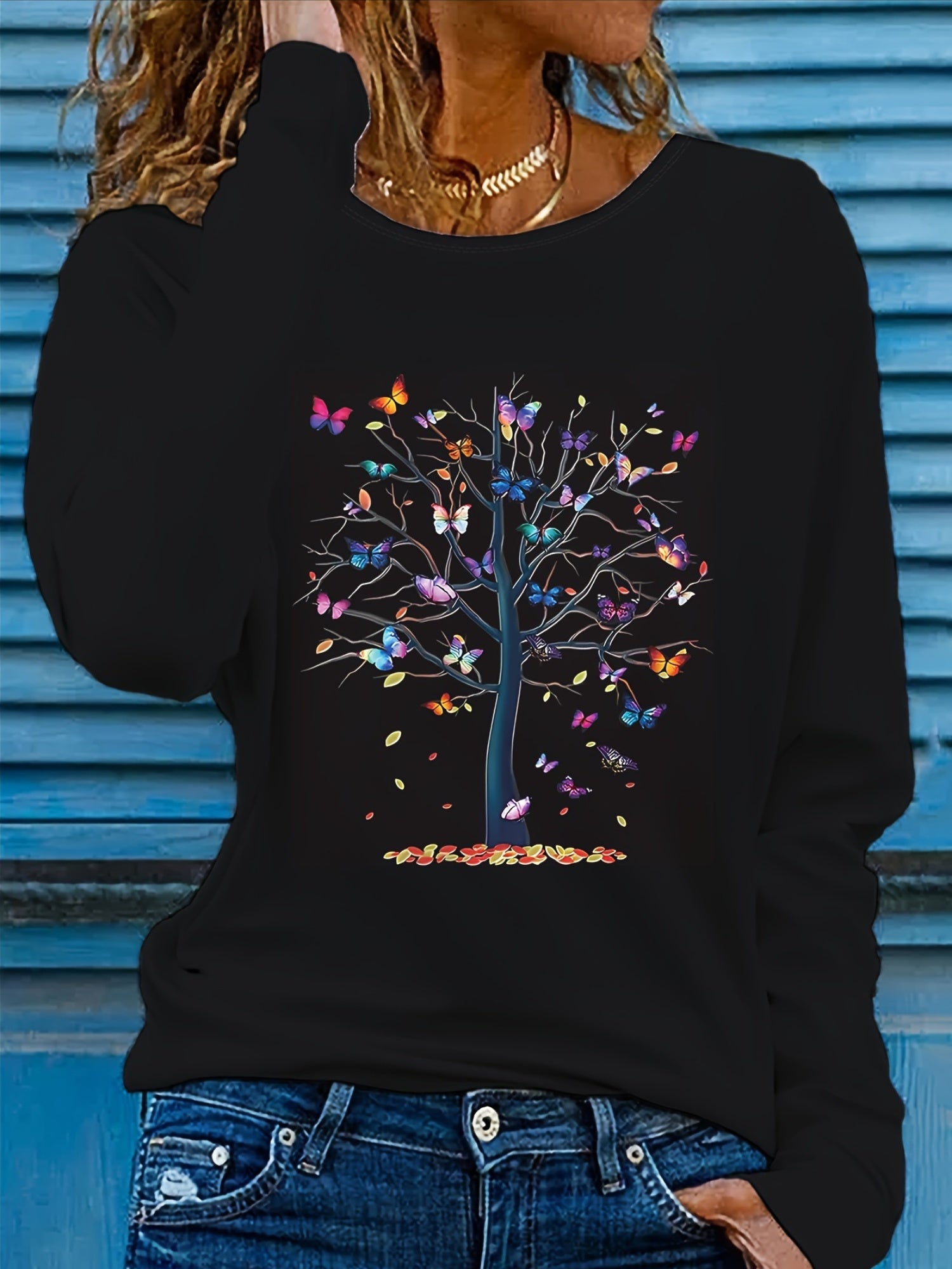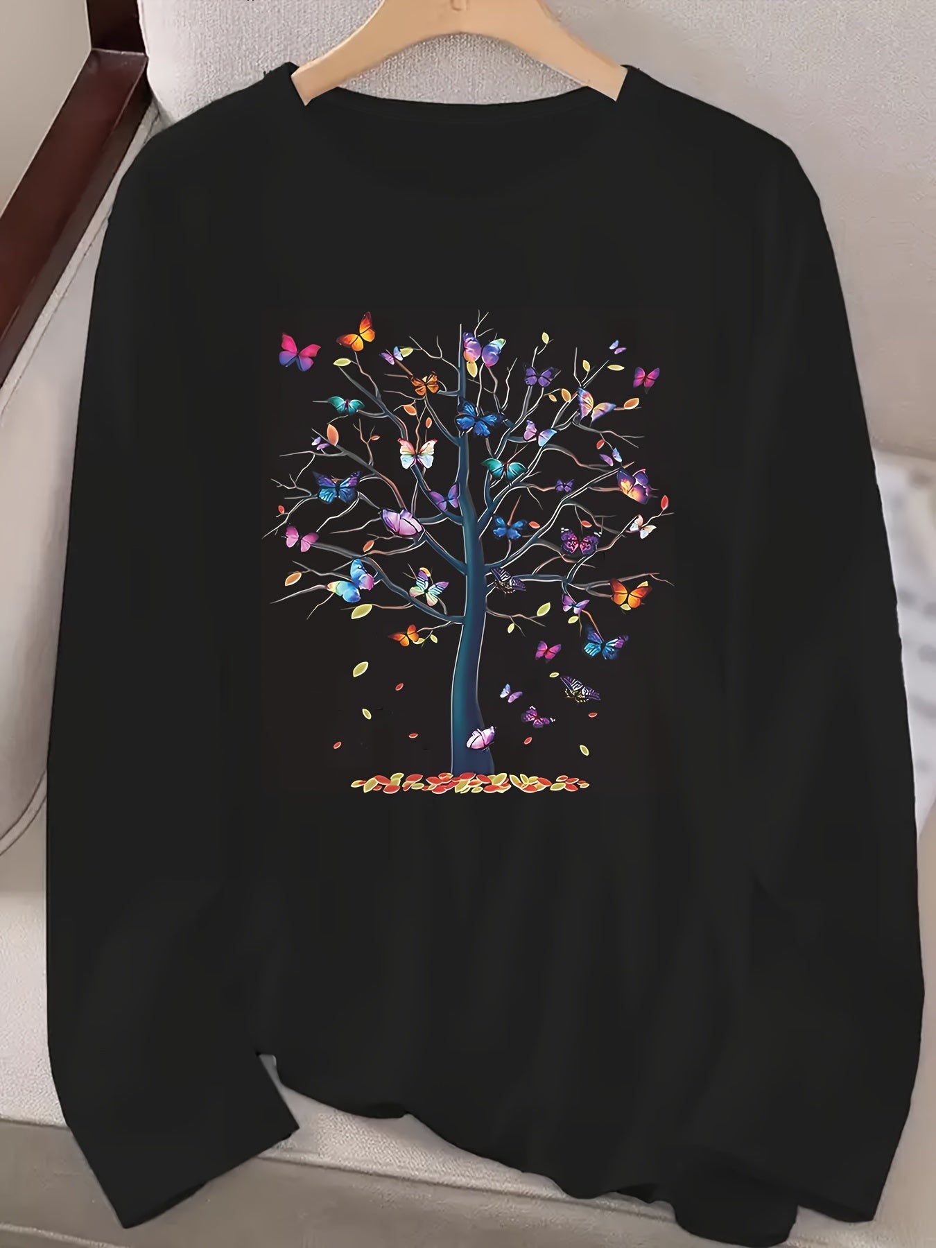 Туника для женщин больших размеров с длинным рукавом, вязаная, с принтом бабочка и деревья, повседневный стиль