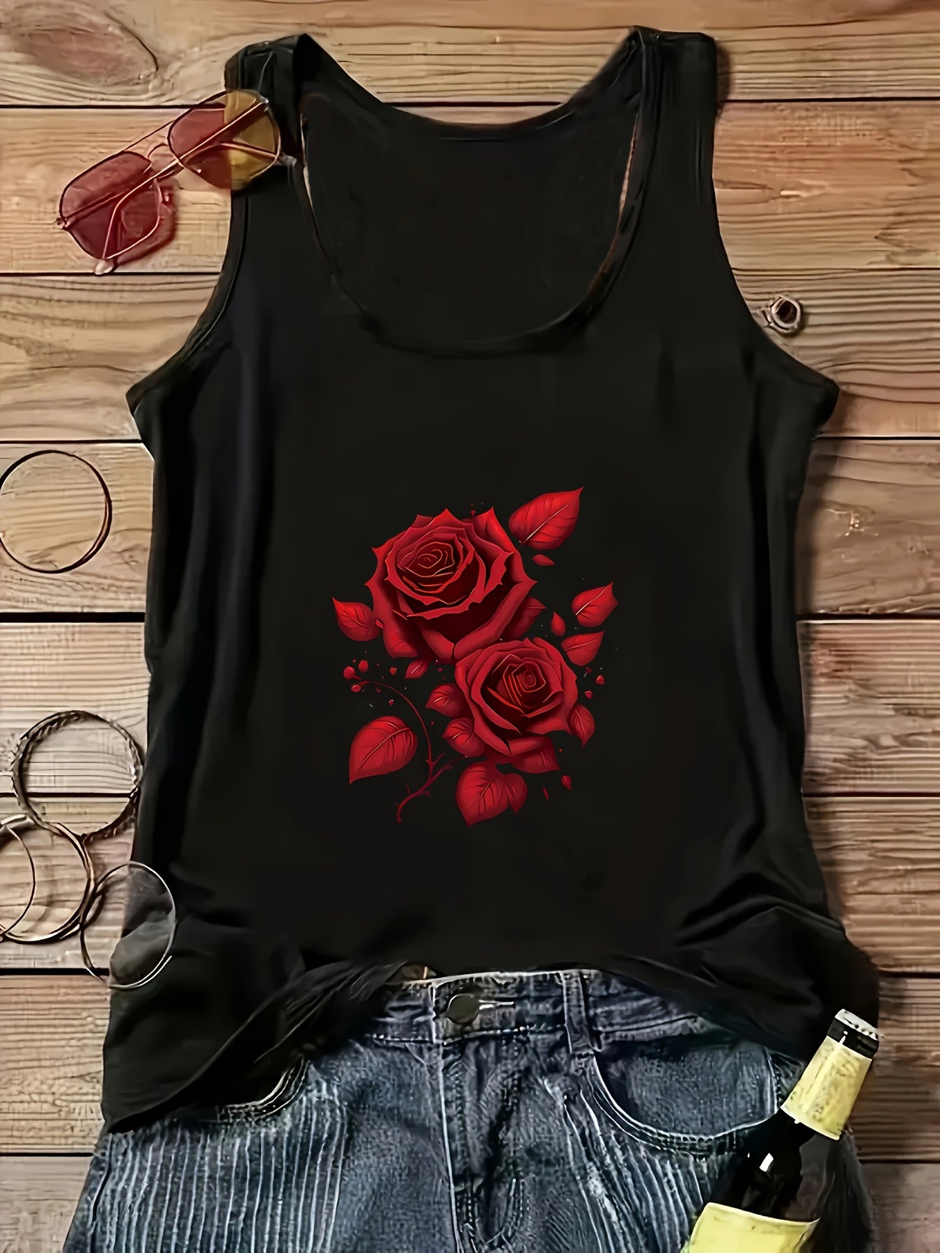 Топ без рукавов и с открытыми плечами для женщин больших размеров, черный с принтом красной розы, летняя пляжная майка