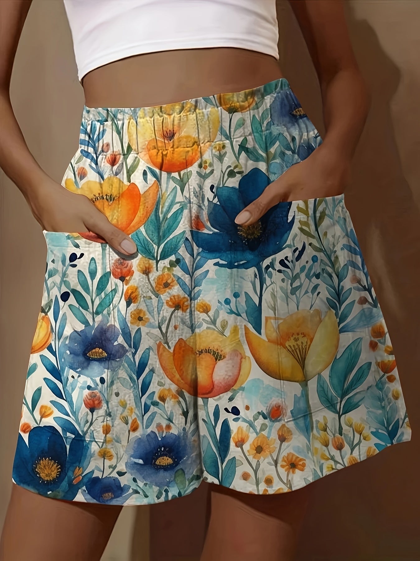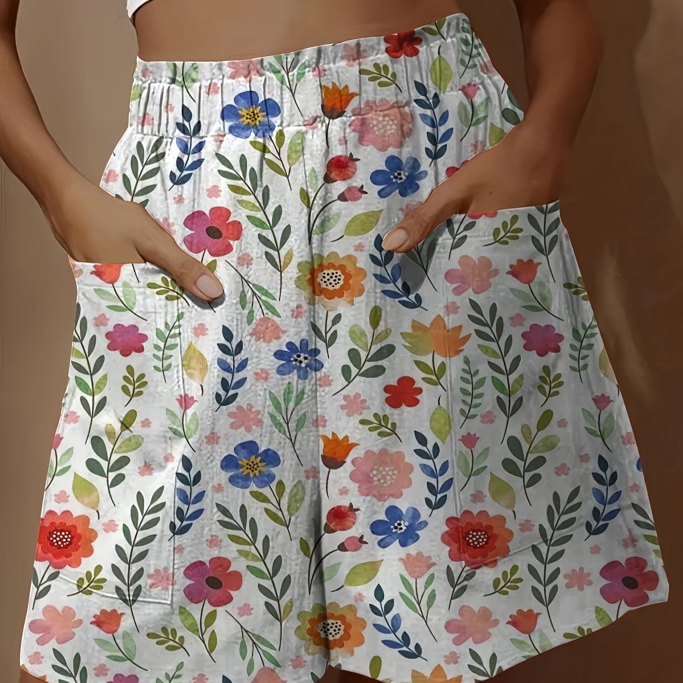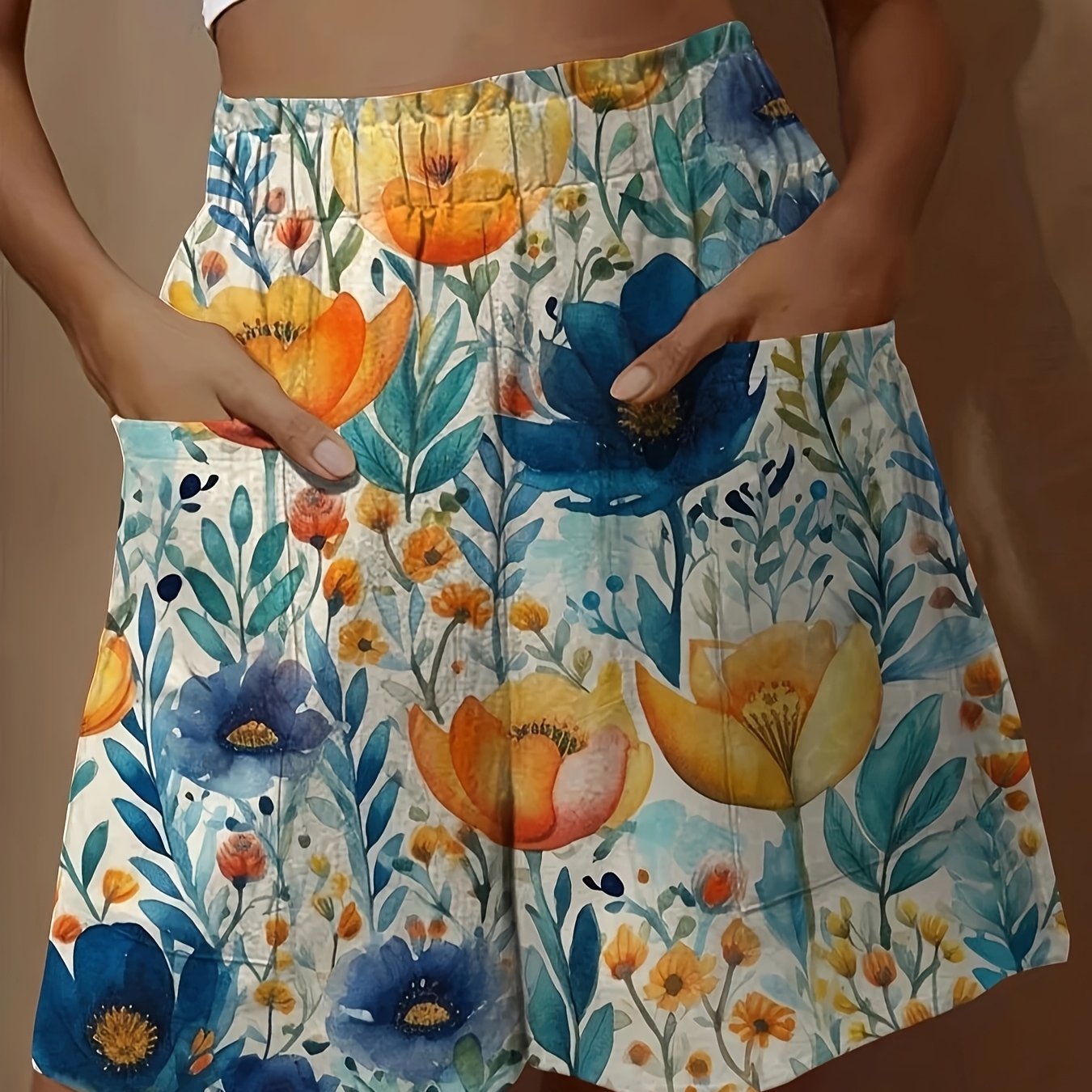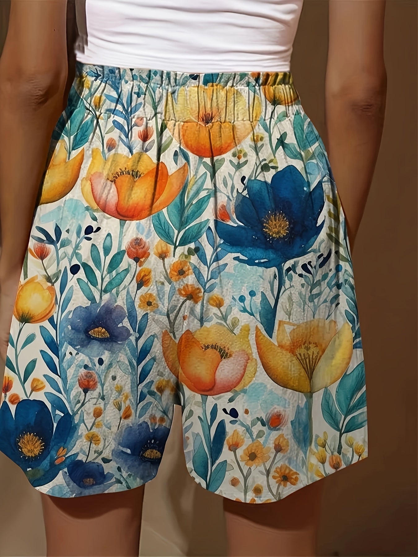 Шорты для женщин больших размеров с рюшами на талии, повседневные, с цветочным принтом и художественным дизайном