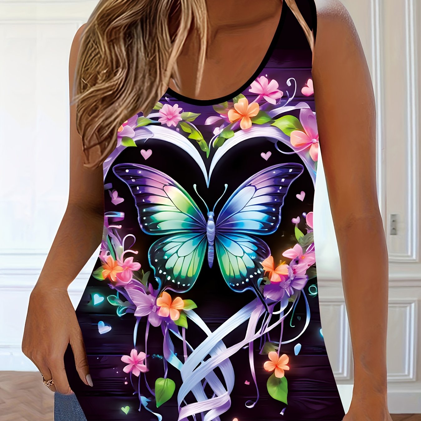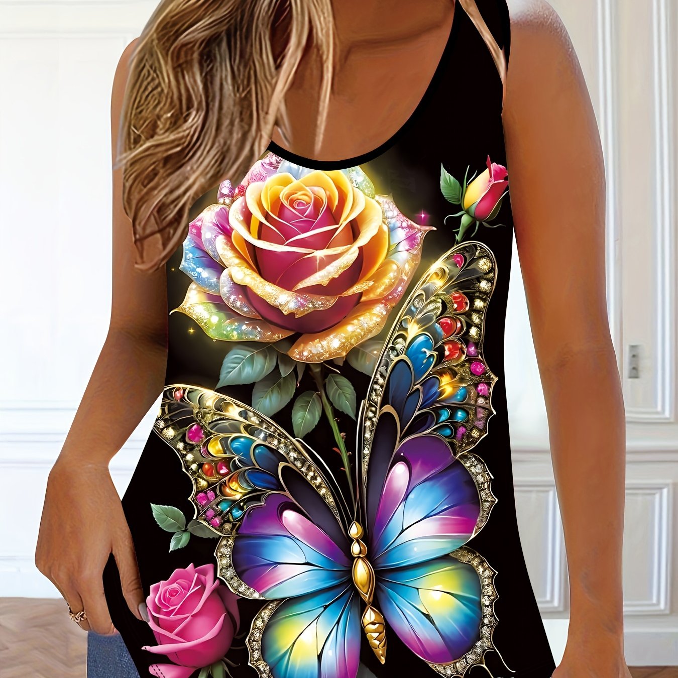 Топ без рукавов для полных женщин с принтом подсолнечника и бабочки, черный и желтый