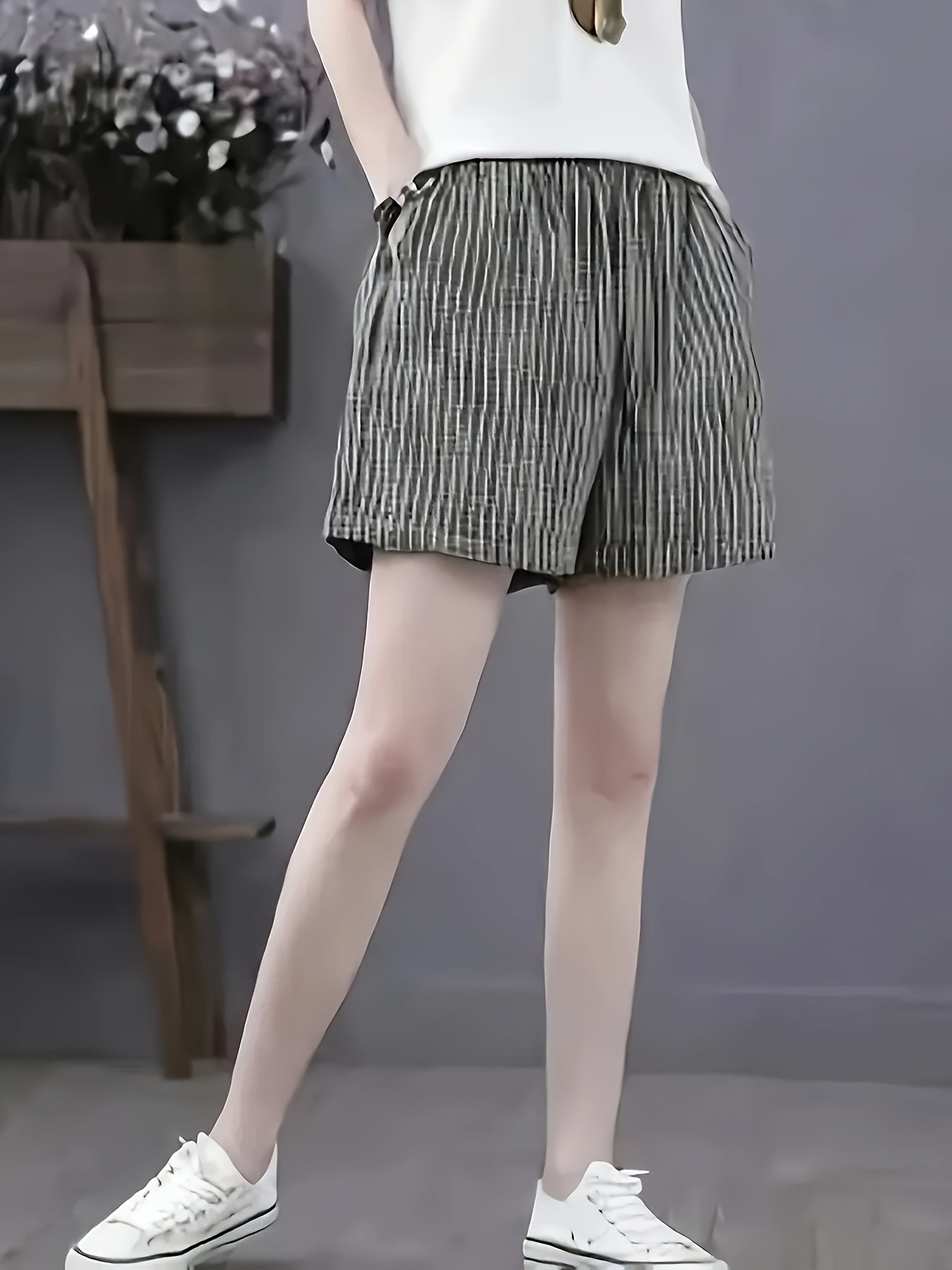 Шорты женские больших размеров в полоску средней длины черные и белые с карманами летние повседневные