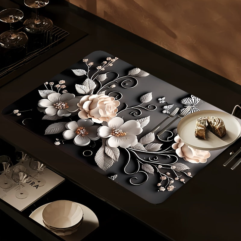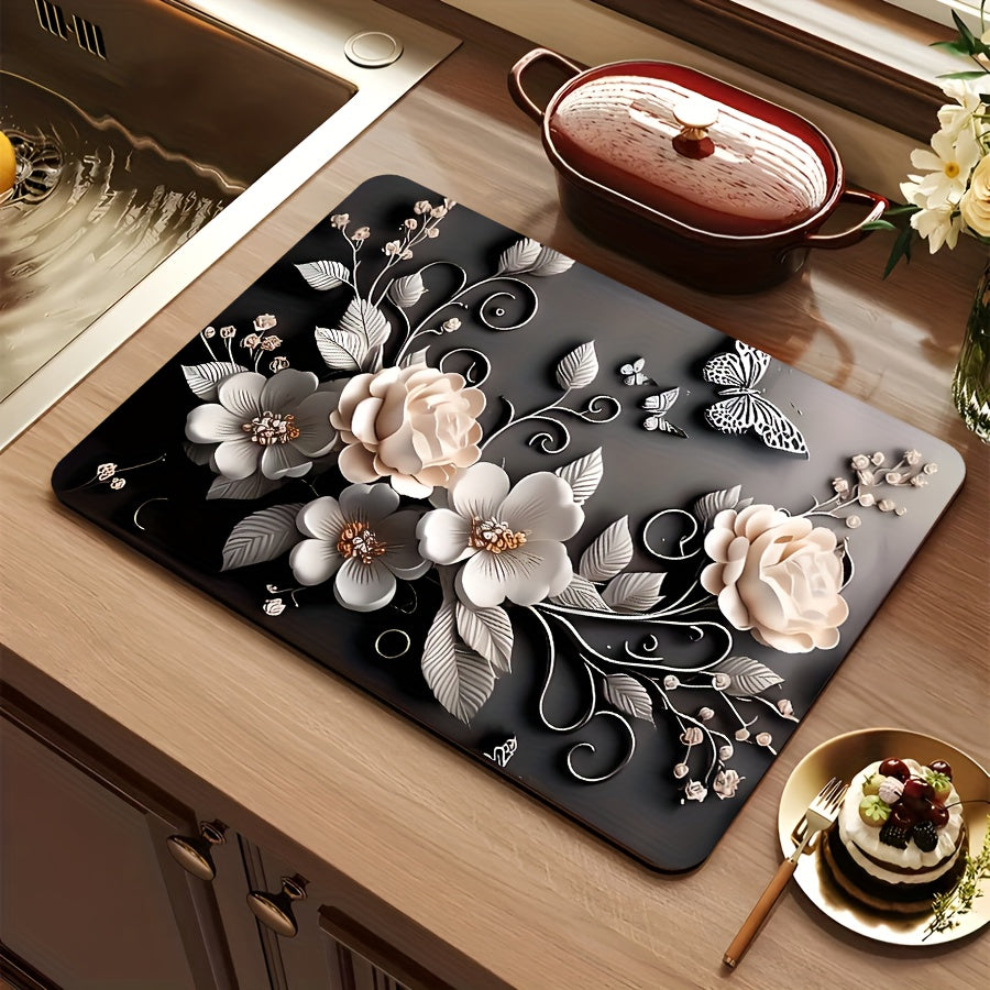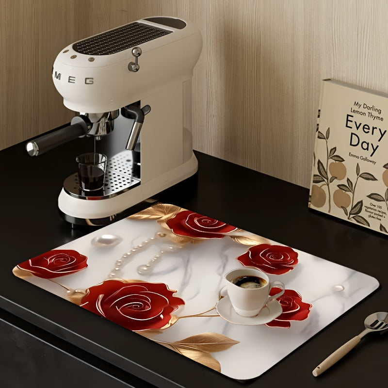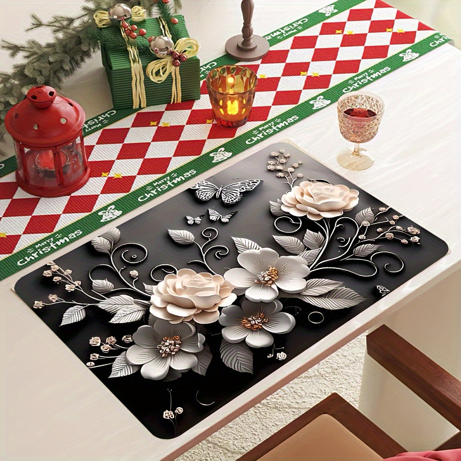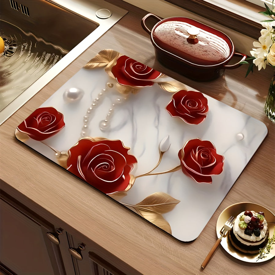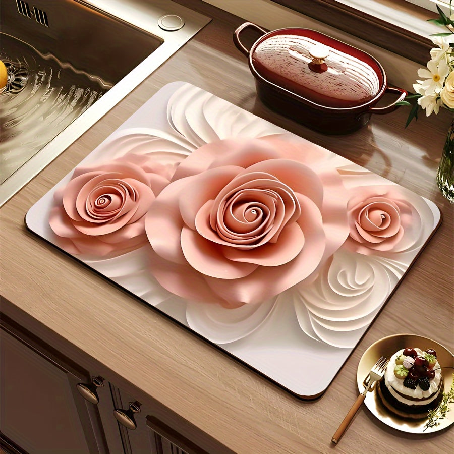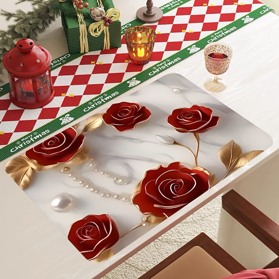 Полиэстеровый кухонный коврик с праздничным 3D дизайном розы - противоскользящий, быстро сохнущий поднос для посуды - идеально подходит для Рождества, Хэллоуина, Дня благодарения - защищает ваш домашний декор и стол, отлично подходит для домашних животных