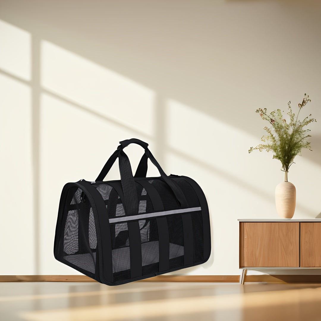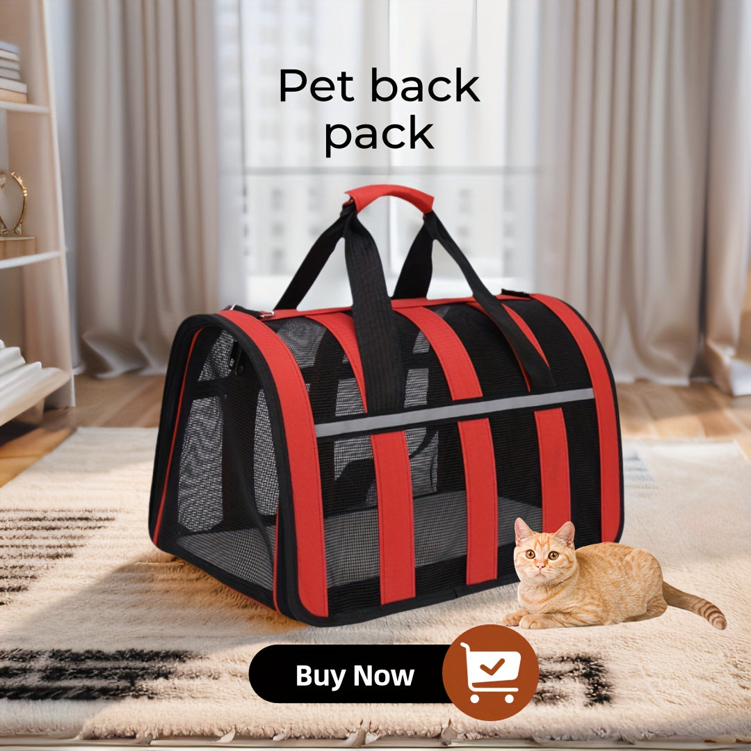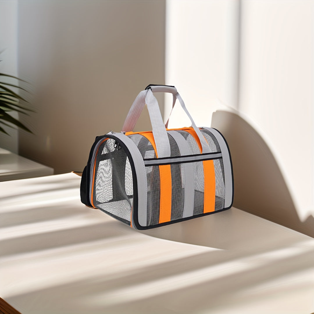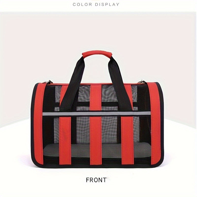 Портативная сумка для переноски домашних животных с сетчатыми окнами, прочный полиэстер, застежка на молнии, складной дизайн и плечевой ремень для путешествий с кошками и собаками.