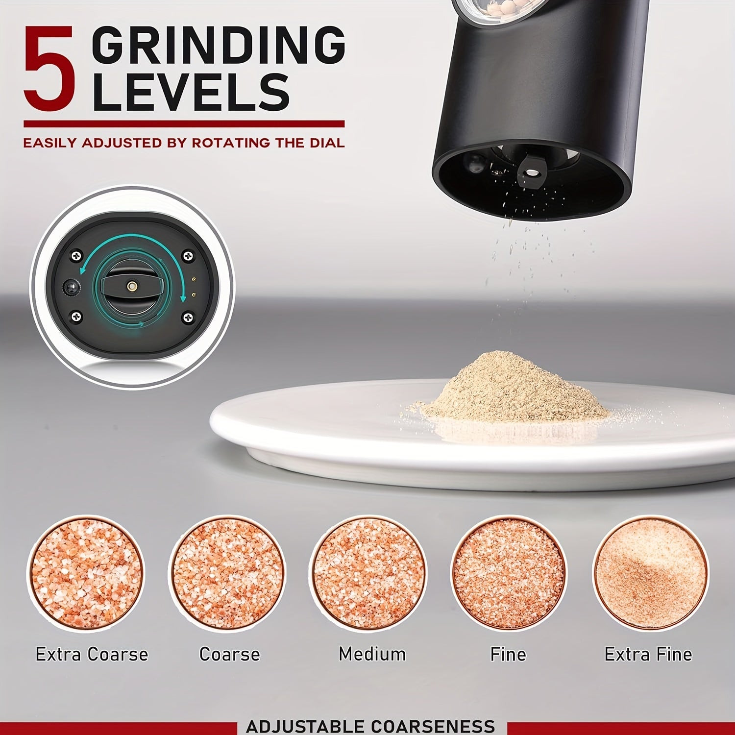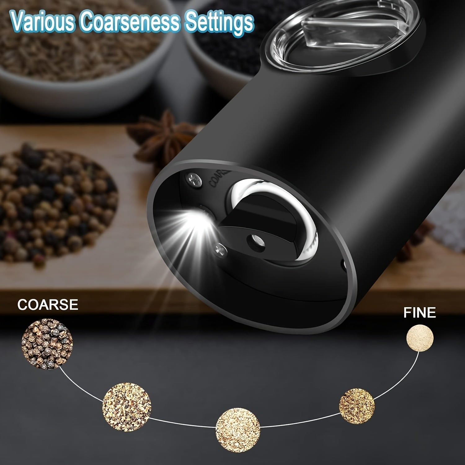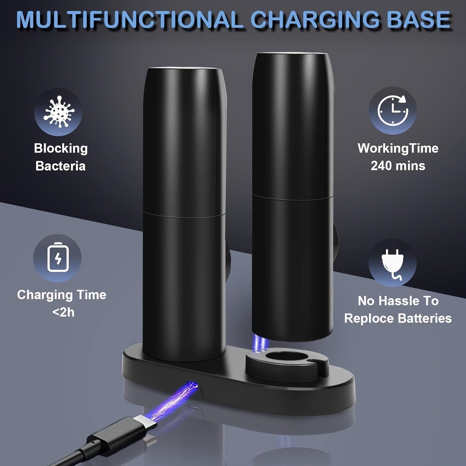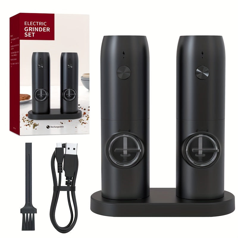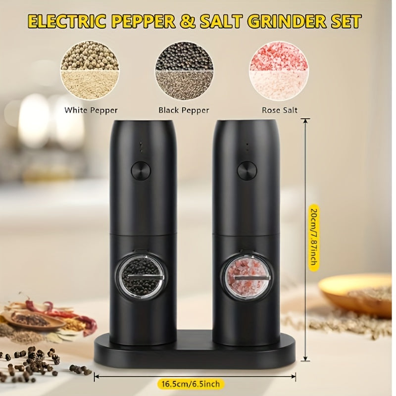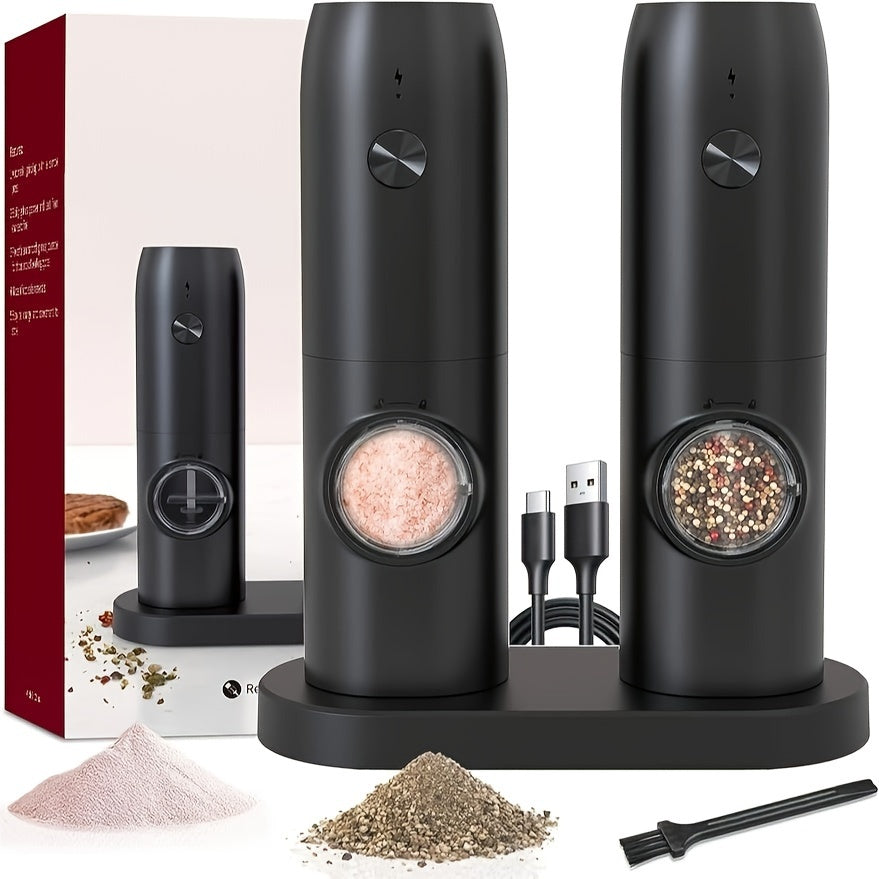 Портативный набор из двух единиц с зарядной базой, содержащий электрический инструмент с LED-освещением для измельчения морской соли, черного перца и приправленной соли с автоматической регулируемой функцией измельчения.