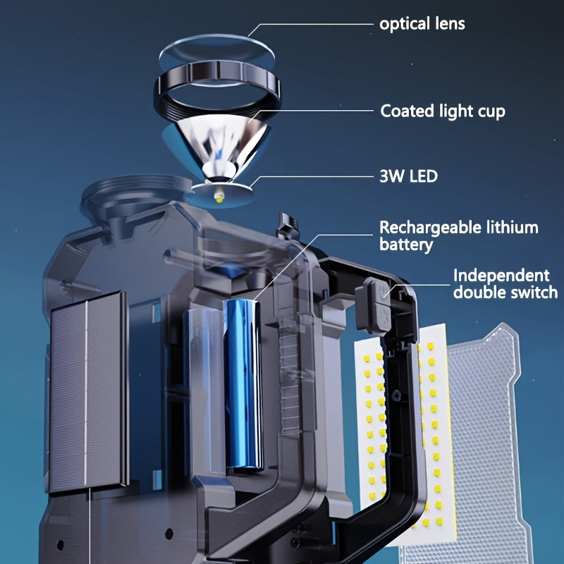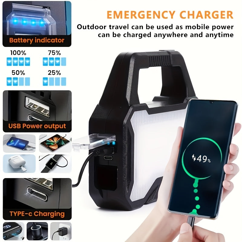 Перезаряжаемый солнечный фонарик с множеством функций, идеален для экстренных ситуаций, кемпинга и рыбалки. Может заряжать мобильные телефоны и внешние аккумуляторы.