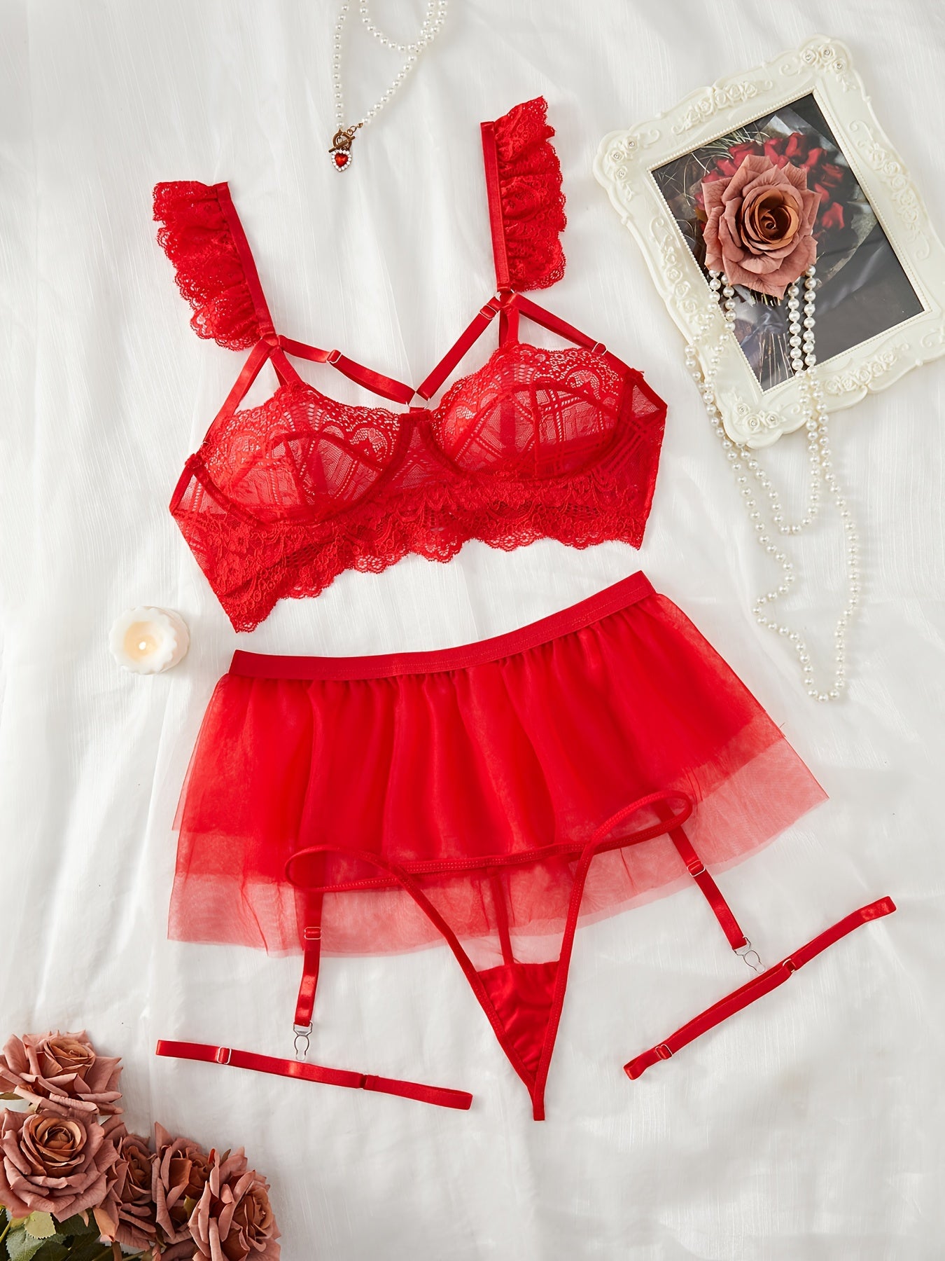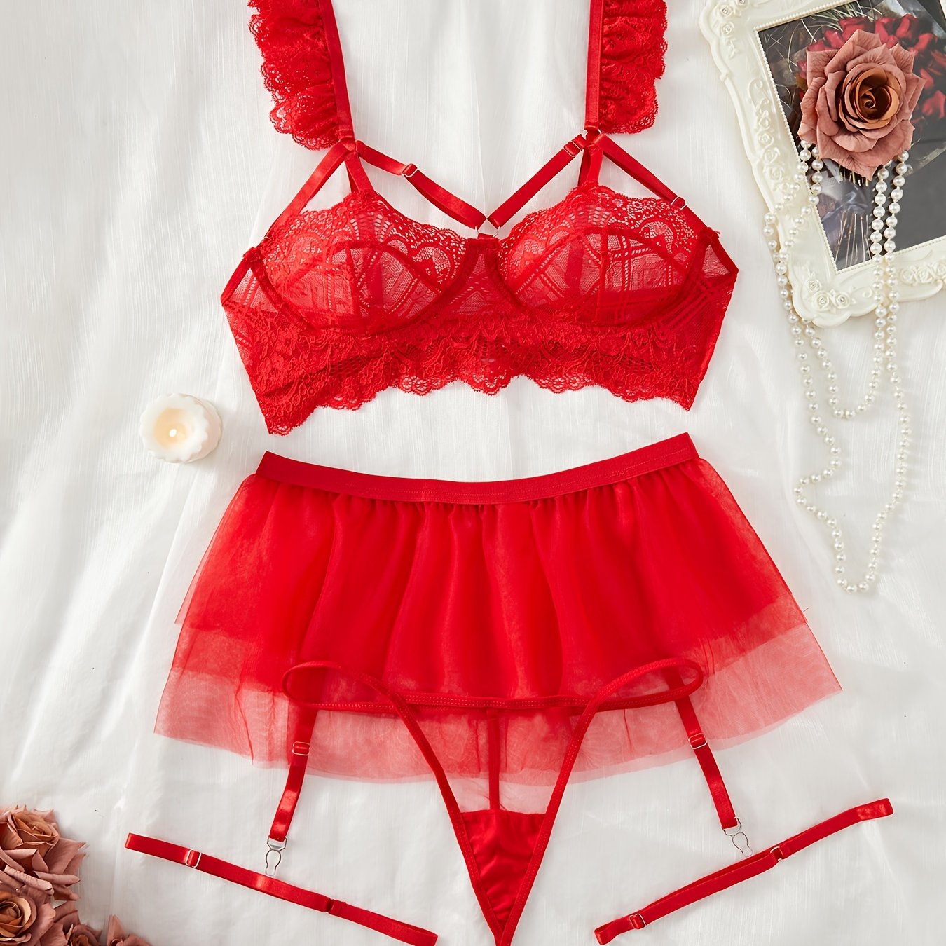 Красный кружевной комплект нижнего белья с регулируемыми бретелями, сетчатым нижним бельем, юбкой с подвязками и подвязками для ног, идеально подходит для спальни.