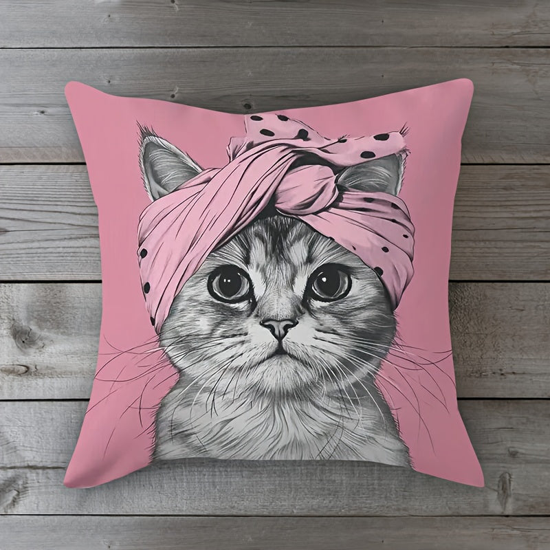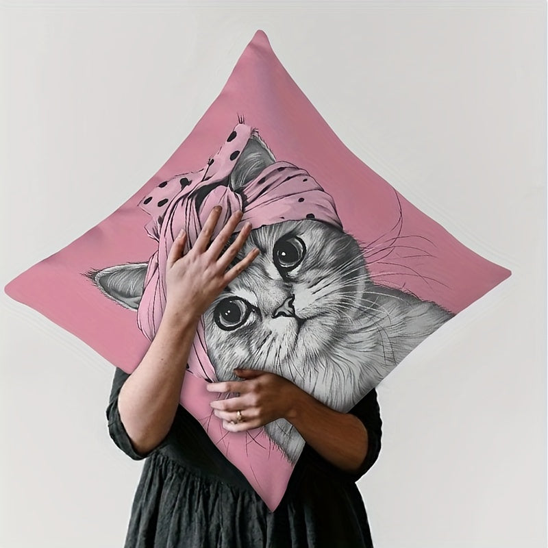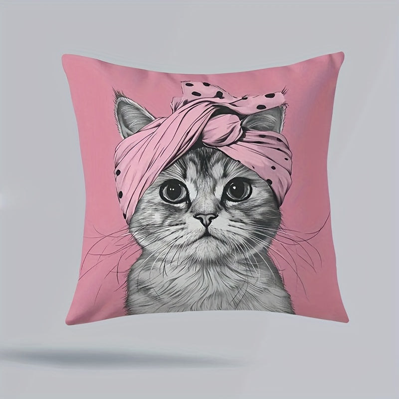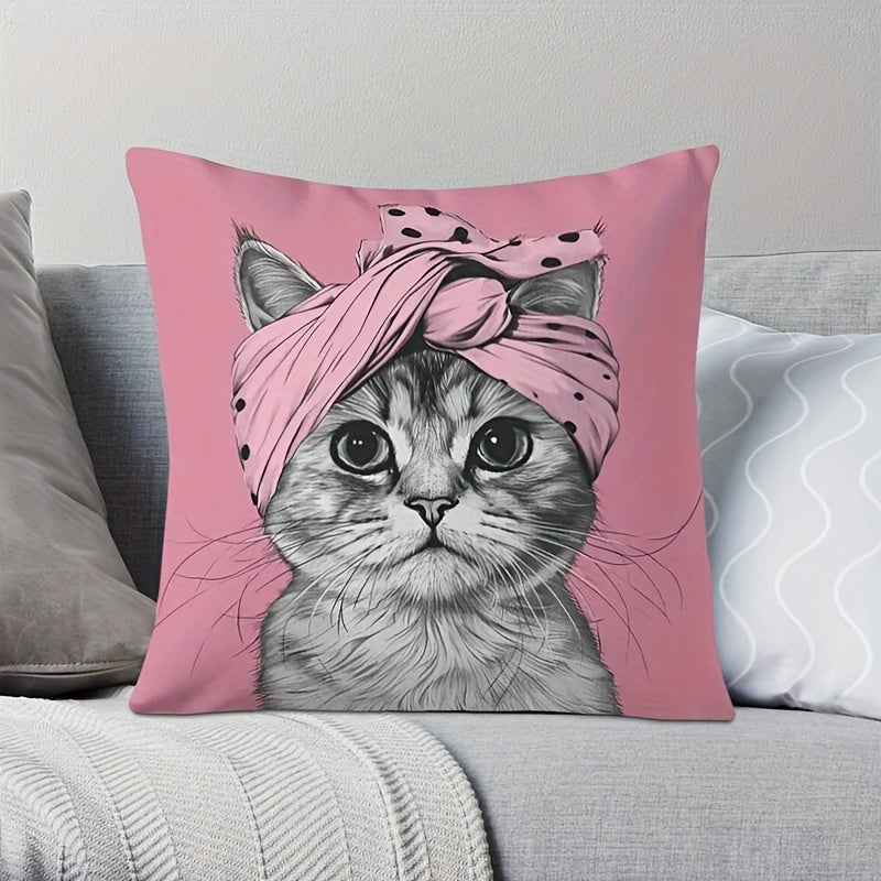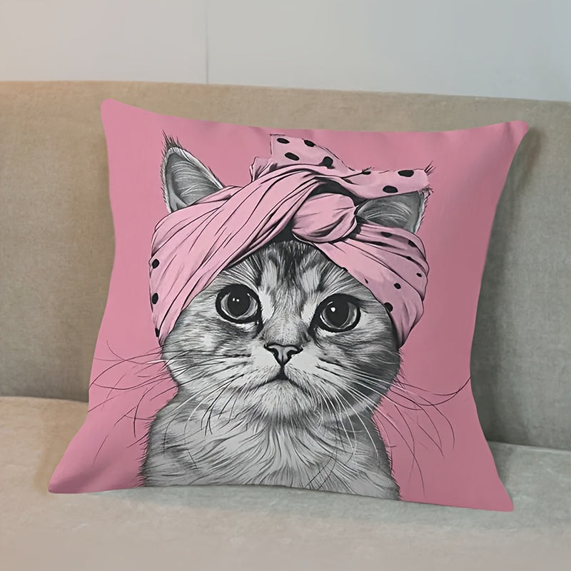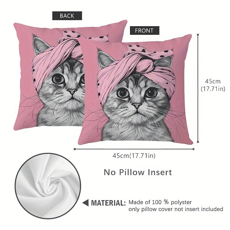Обратная подушка с кошачьей тематикой и дизайном розового тюрбана. Изготовлена из 100% полиэстера с застежкой на молнии. Машинная стирка. Размеры 45,72x45,72 см. Идеально подходит для спальни, гостиной и других комнат. 1 шт., вставка не включена.
