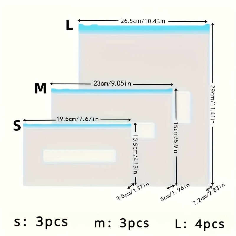 Набор из 10 многоразовых пакетов для хранения продуктов в 3 размерах - прозрачные и прочные, изготовлены из пластика пищевого качества, идеально подходят для организации зерна, орехов, чая и многого другого в холодильнике.