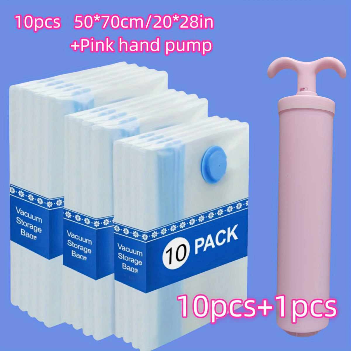 Набор из 10 вакуумных упаковочных мешков 50*70 см/20*28 дюймов с розовым ручным насосом, универсальные пластиковые мешки с застежкой-молнией, идеальные для экономии места во время путешествий, кемпинга, переезда и организации вашего дома и кухни.