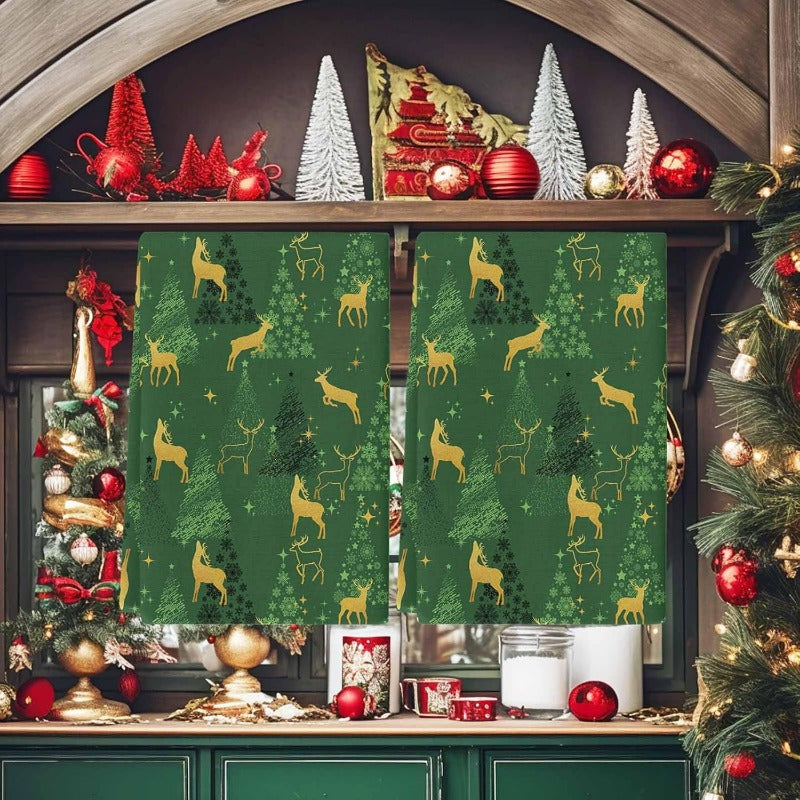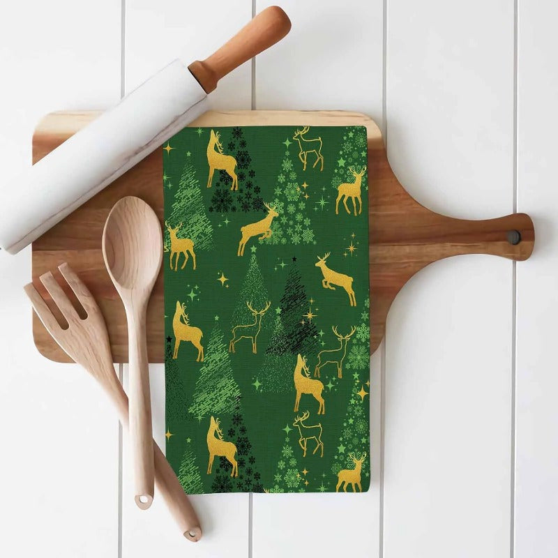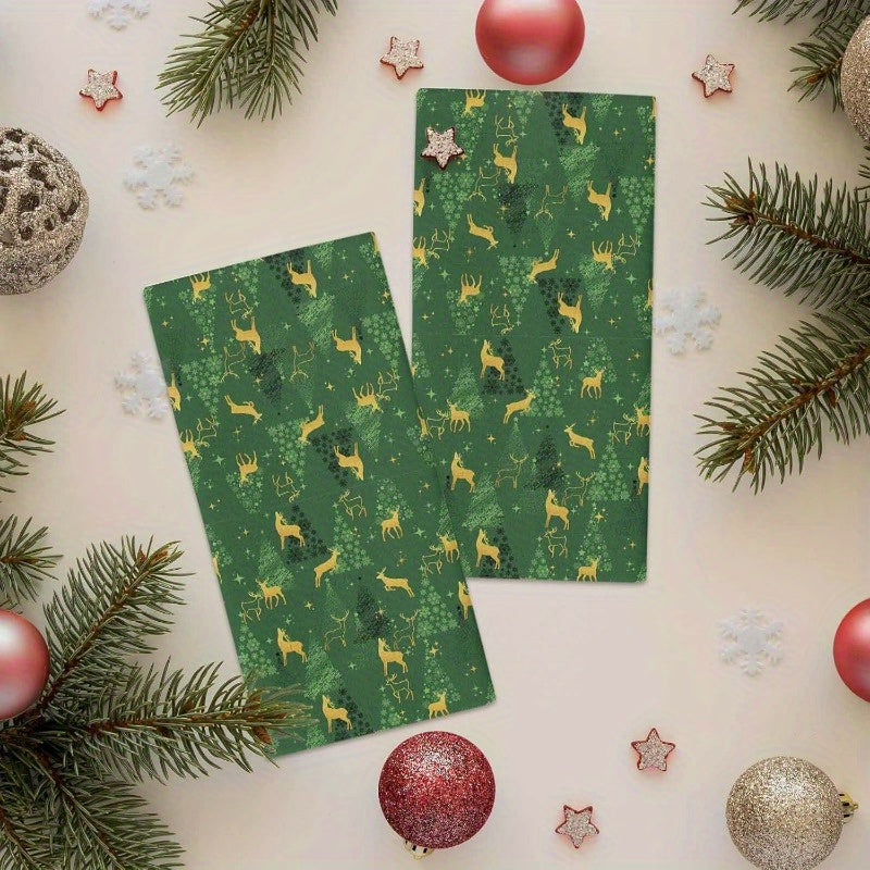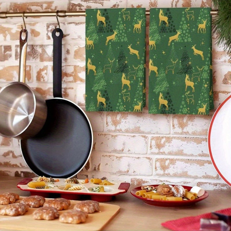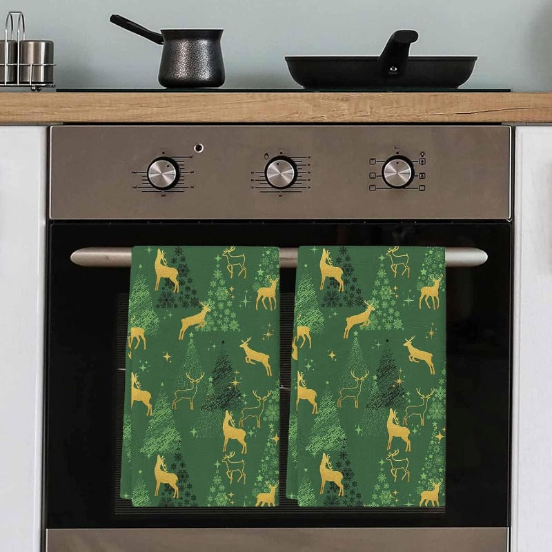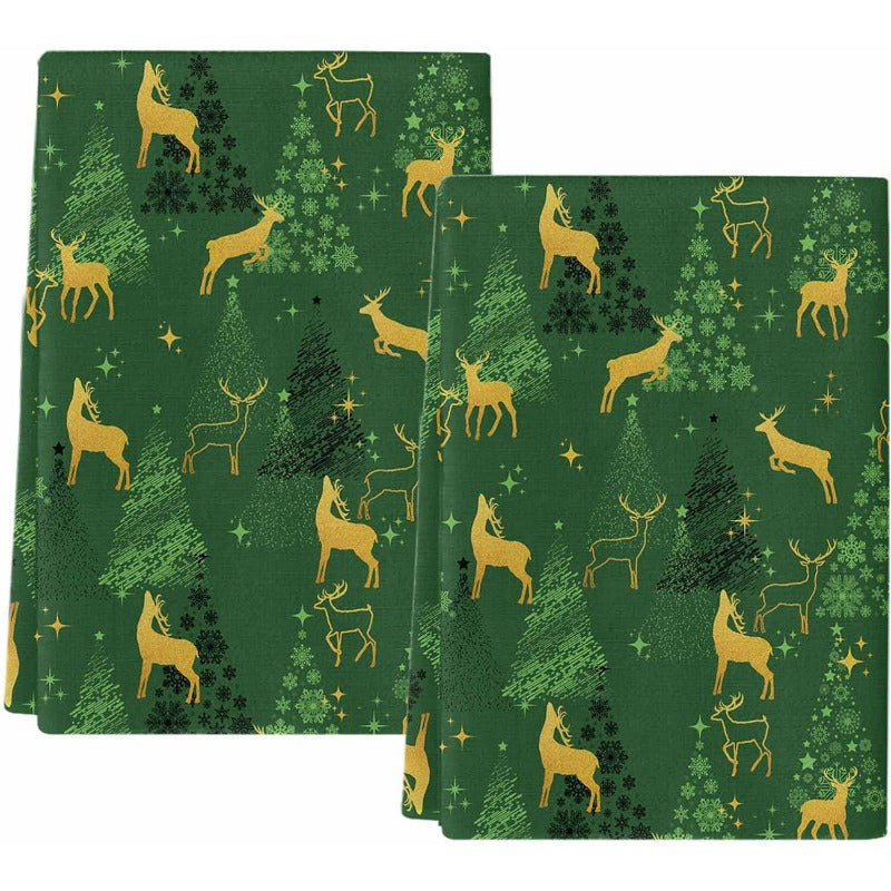 Набор из 2 кухонных полотенец с силуэтами зеленых оленей, звездами и елками, 45,72x66,04 см