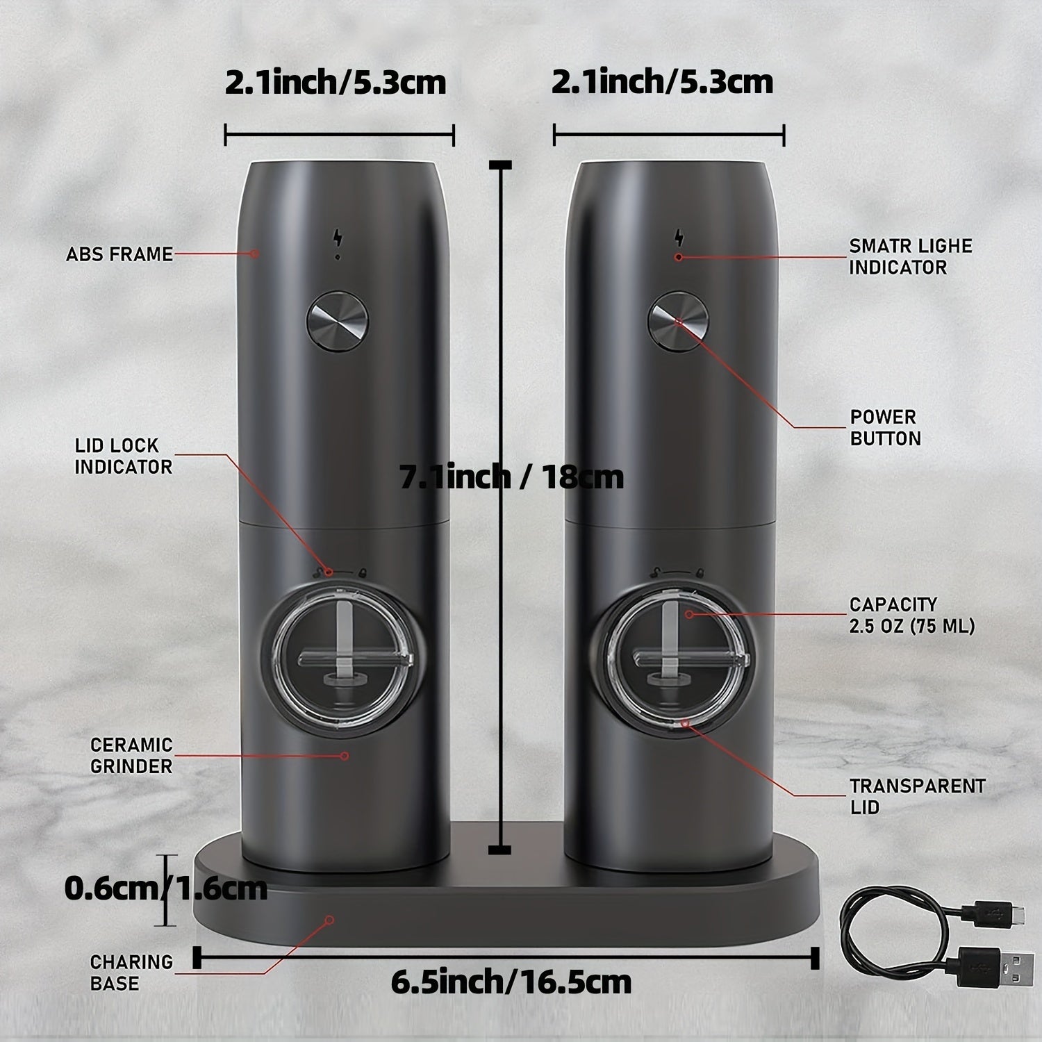 Набор из 2 электрических мельниц для соли и перца, перезаряжаемых через USB с LED-подсветкой, одноручное управление, регулируемая крупность, refillable база, кухонные гаджеты и принадлежности, идеально подходит для подарков на Рождество или Хэллоуин