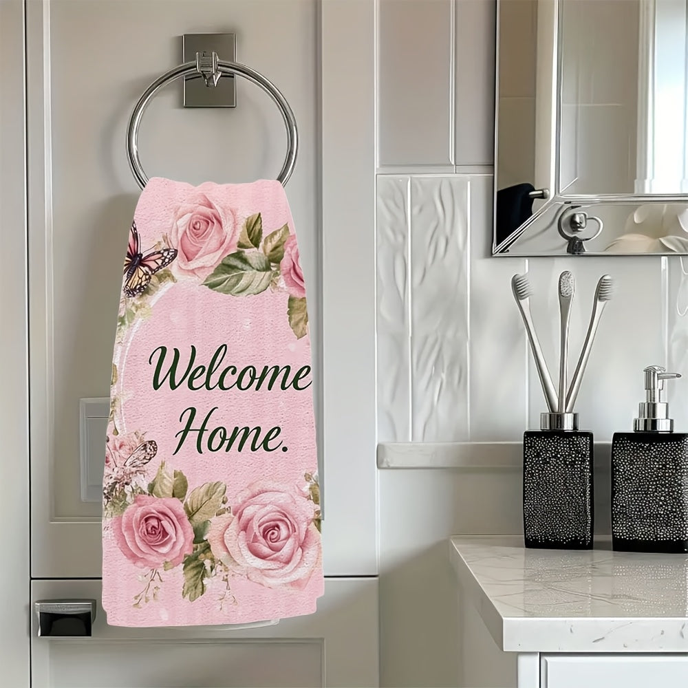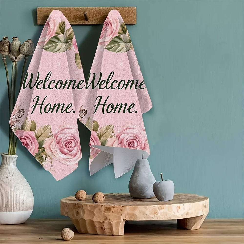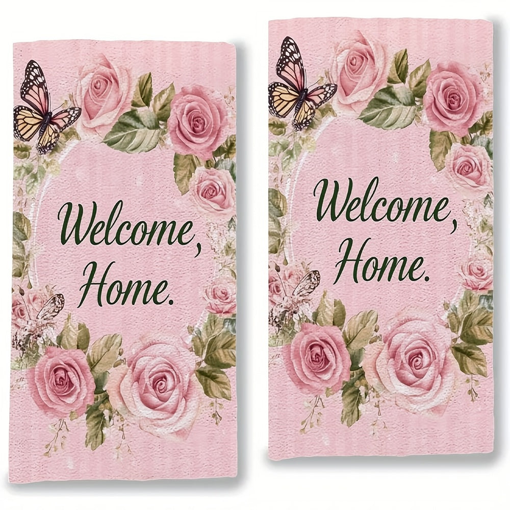 Набор из 2 ультрамягких кухонных полотенец - "Добро пожаловать ДОМОЙ" розовый дизайн с розами и бабочками, исключительно впитывающие и легкие в уходе кухонные полотенца, идеально подходят для праздничного декора, размер: 40,64x60,96 см, кухонные полотенца