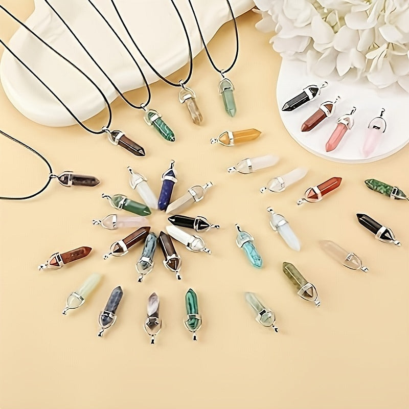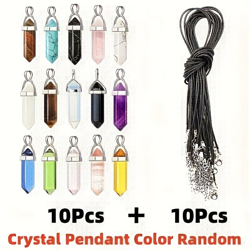 Набор из 20 искусственных кристаллов в виде шестиугольных кварцевых кулонов с украшениями из синтетственных драгоценных камней и кожаными шнурками для ожерелий