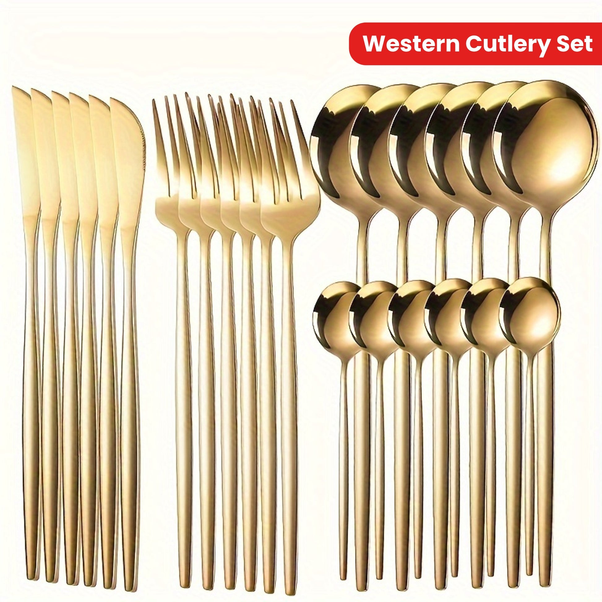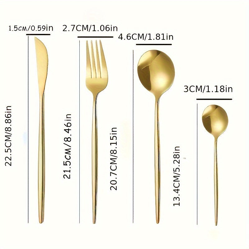 Набор из 24 предметов столовых приборов из нержавеющей стали для дома, ресторана, отеля, вечеринки или свадьбы. Включает в себя нож для стейка, вилку, ложку, чайную ложку, столовую вилку, столовую ложку, фруктовую вилку и десертную ложку.