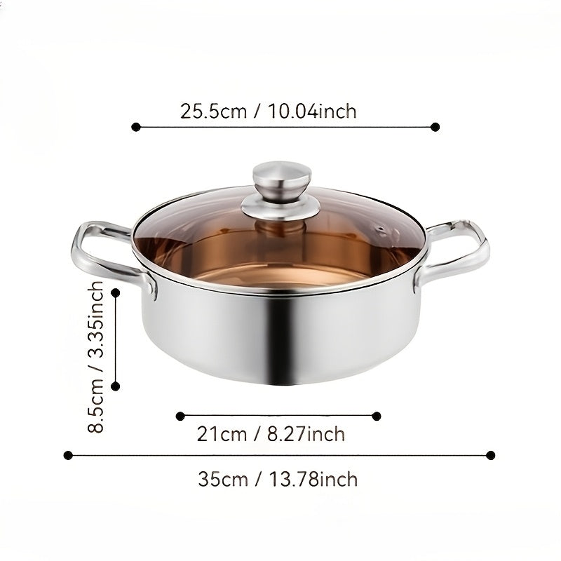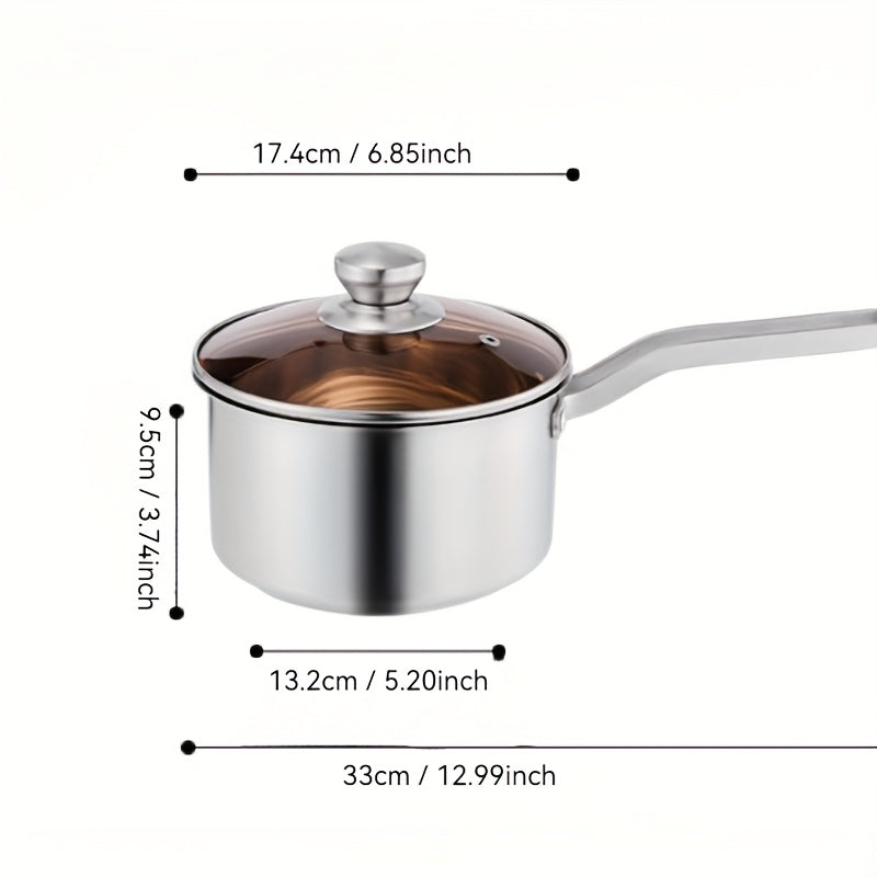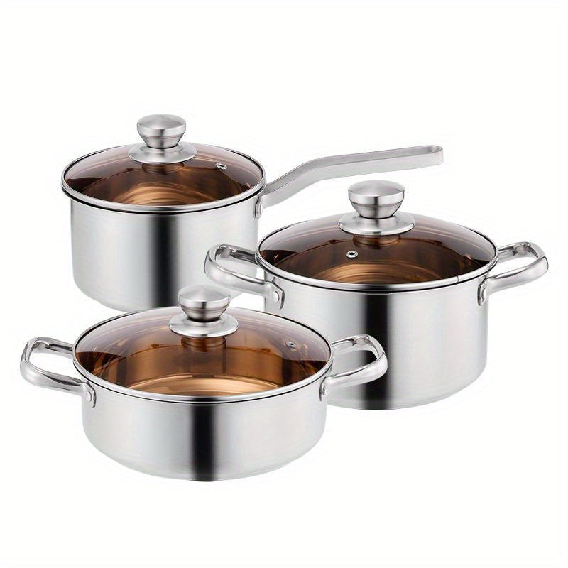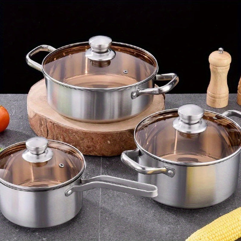 Набор из 3-х предметов посуды из нержавеющей стали - включает молочник, кастрюлю для горячих блюд и супницу с термостойким дном, идеально подходит для использования на газовых и индукционных плитах.