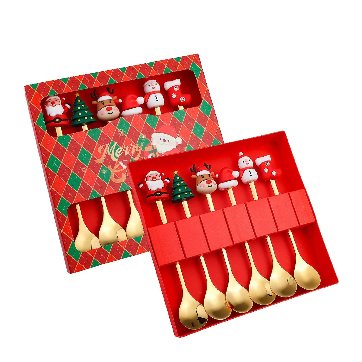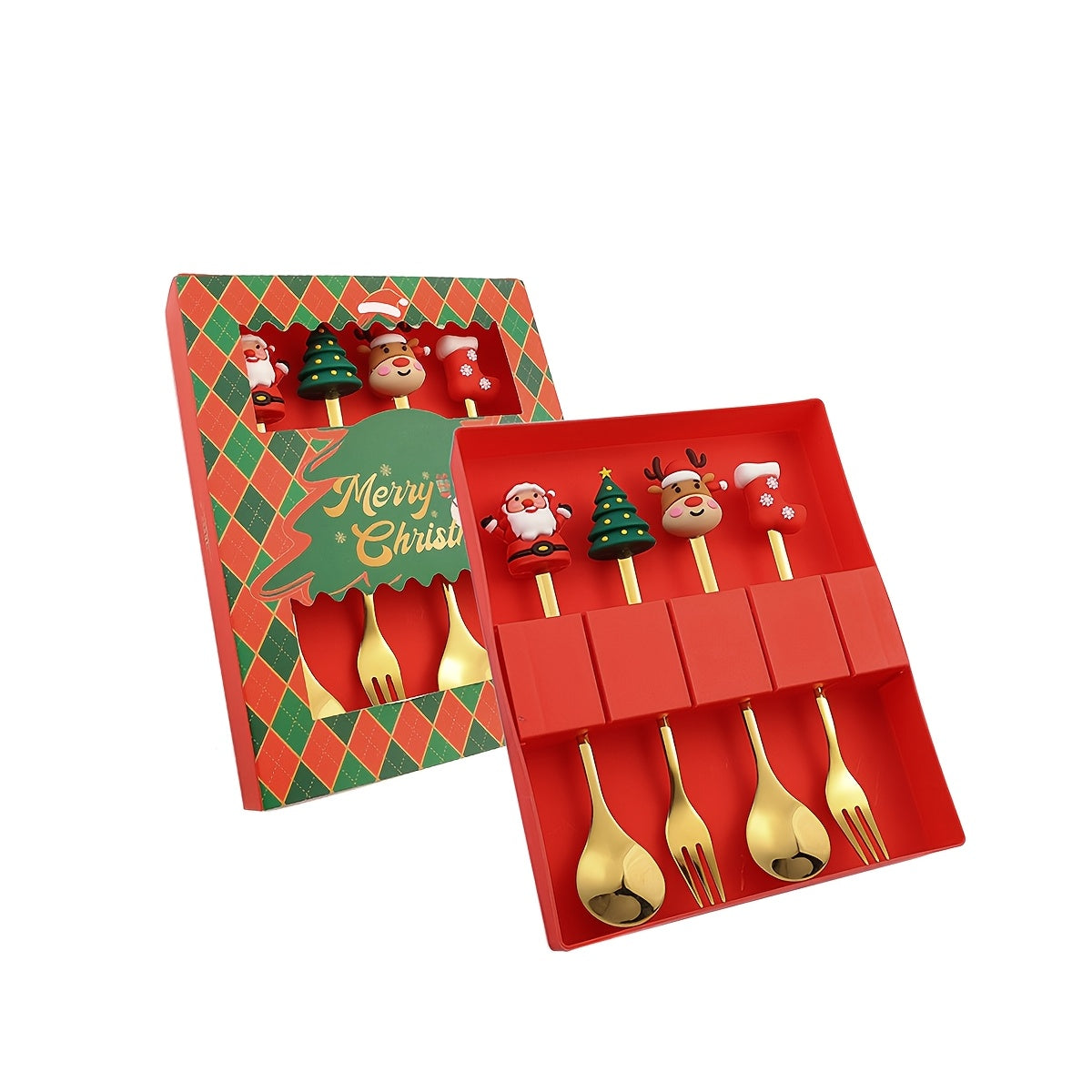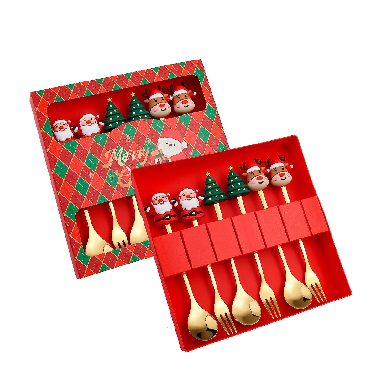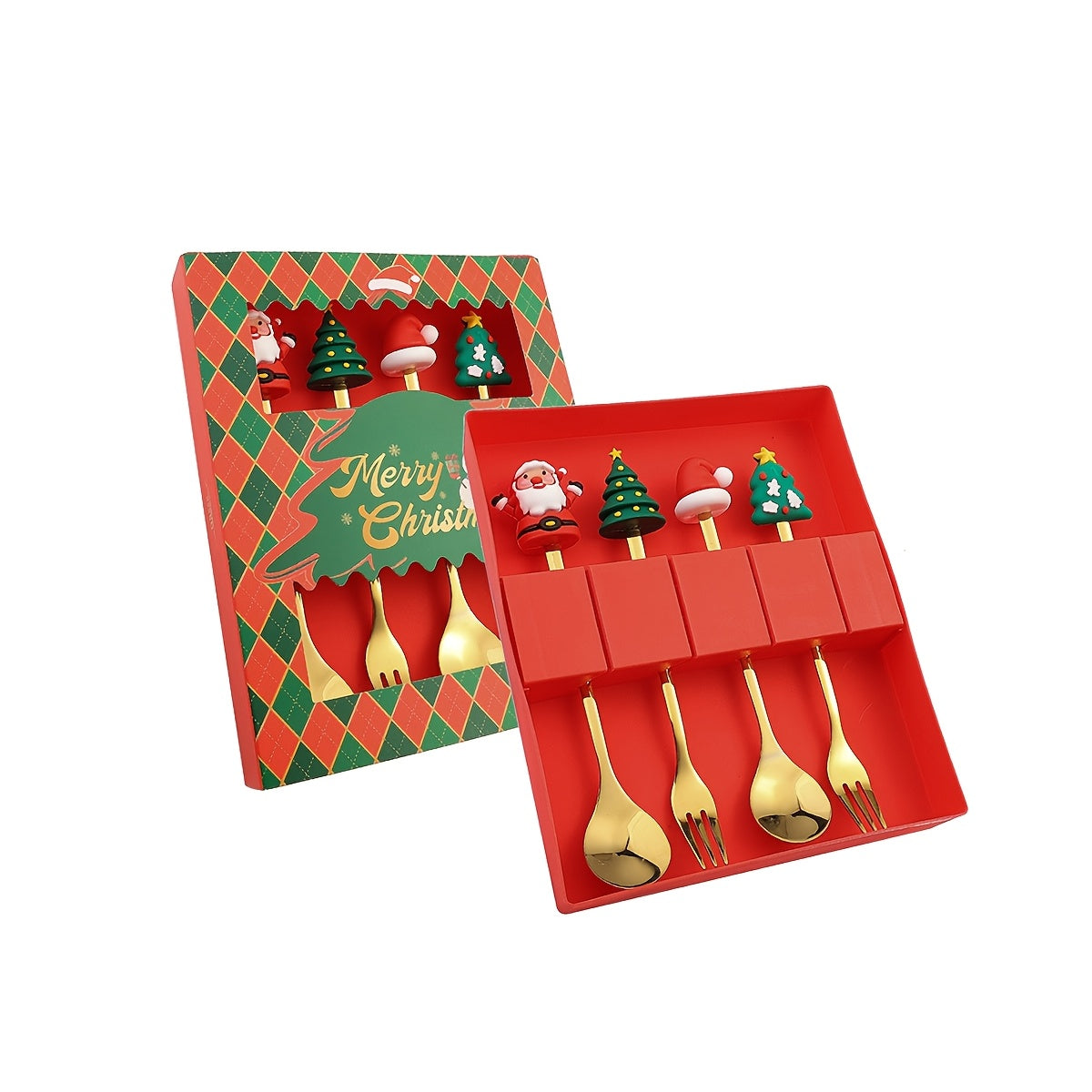 Набор из 4/6 рождественских стальных кофейных ложек и вилок в красной или зеленой подарочной коробке для размешивания напитков и десертов.