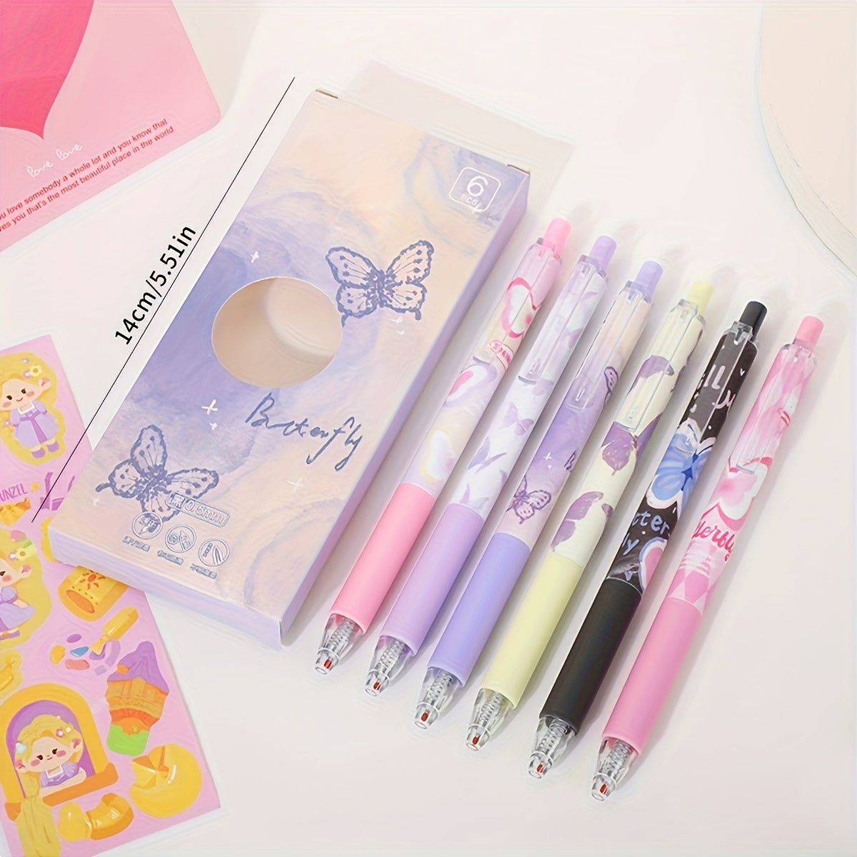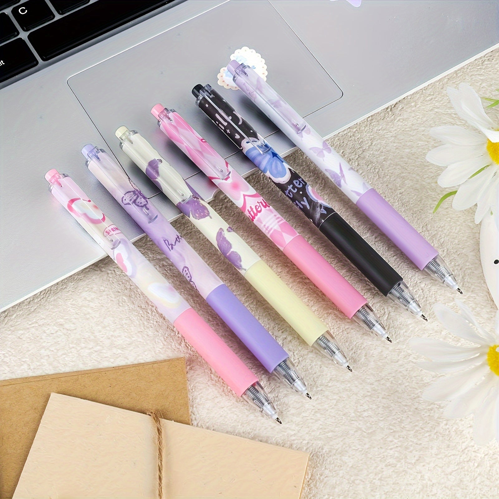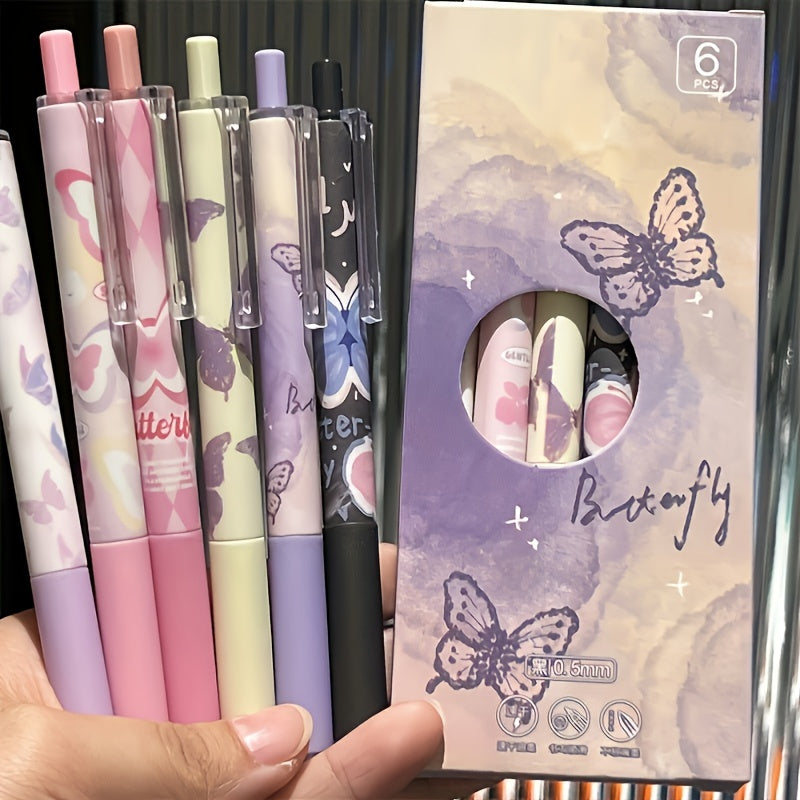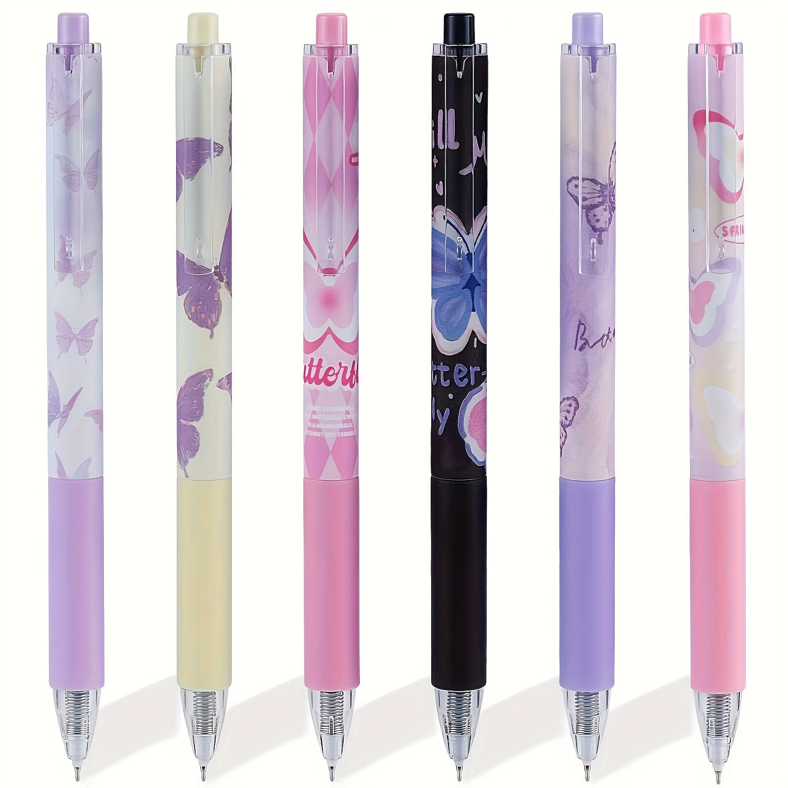 Набор из 6 нейтральных эстетических ручек с черными чернилами, 0,5 мм тонкий наконечник для гладкой письма, мечтательный дизайн с бабочками, идеален для использования в школе или офисе.