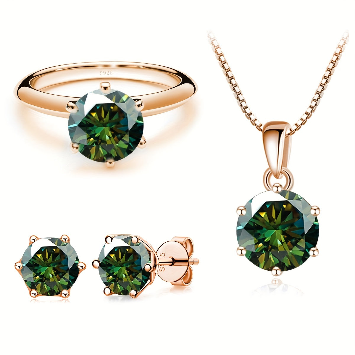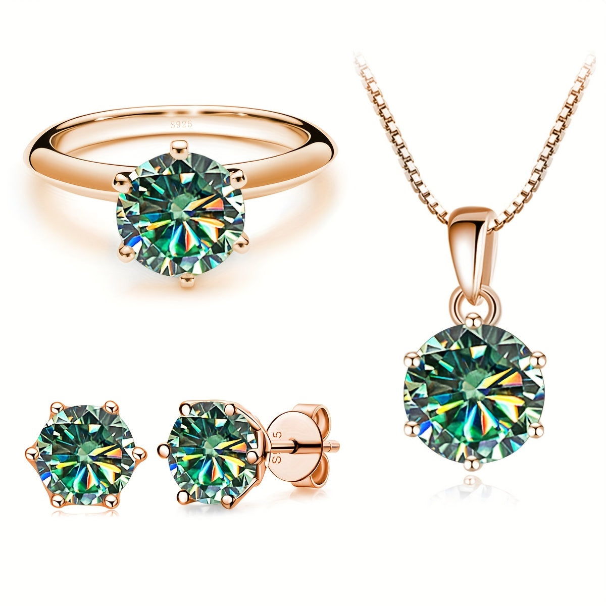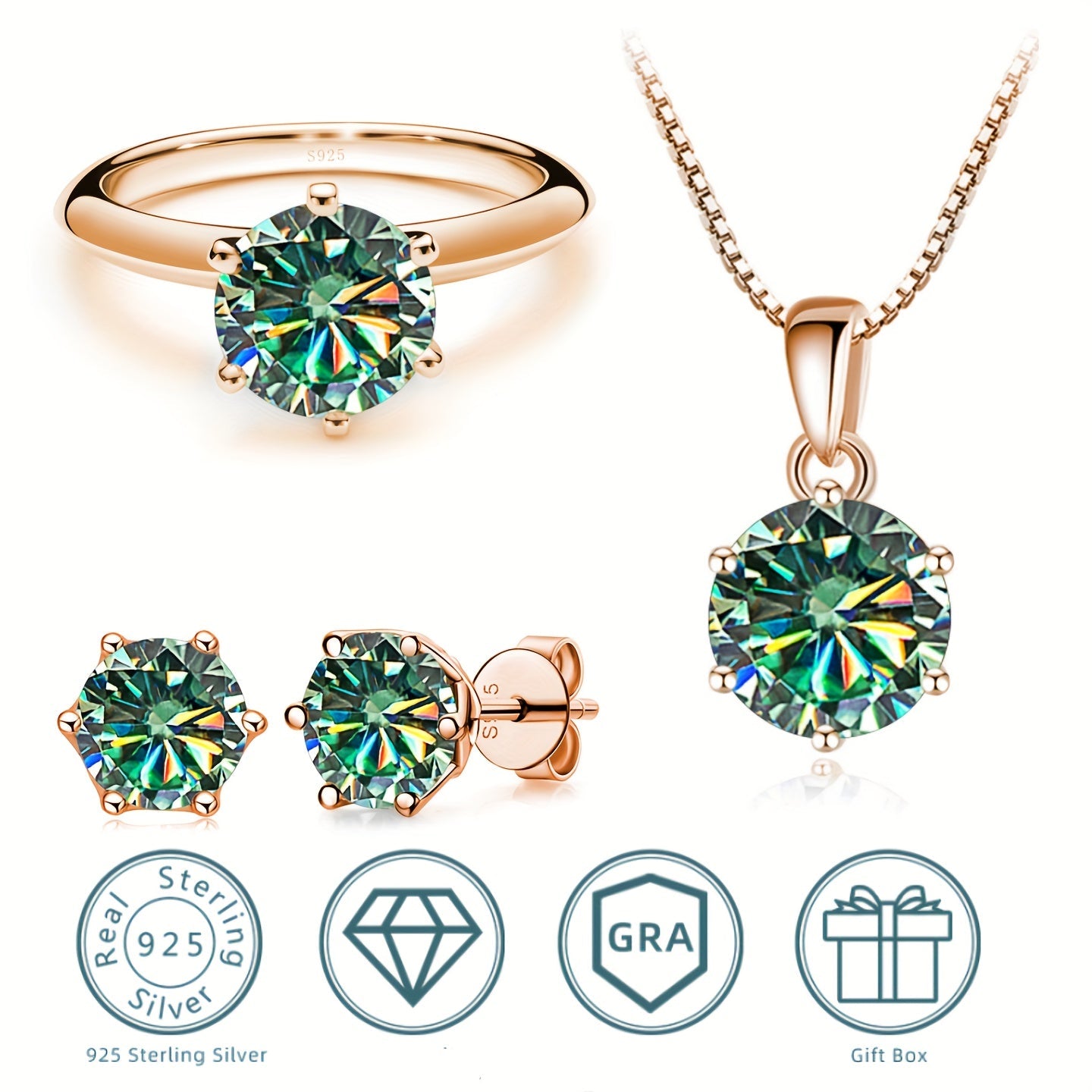 Комплект ювелирных изделий из серебра 925 пробы с 4-частной ожерельем из моиссанита, 1-частным кольцом из моиссанита и 2-частными серьгами из моиссанита, доступный в различных цветах. Поставляется в подарочной коробке.