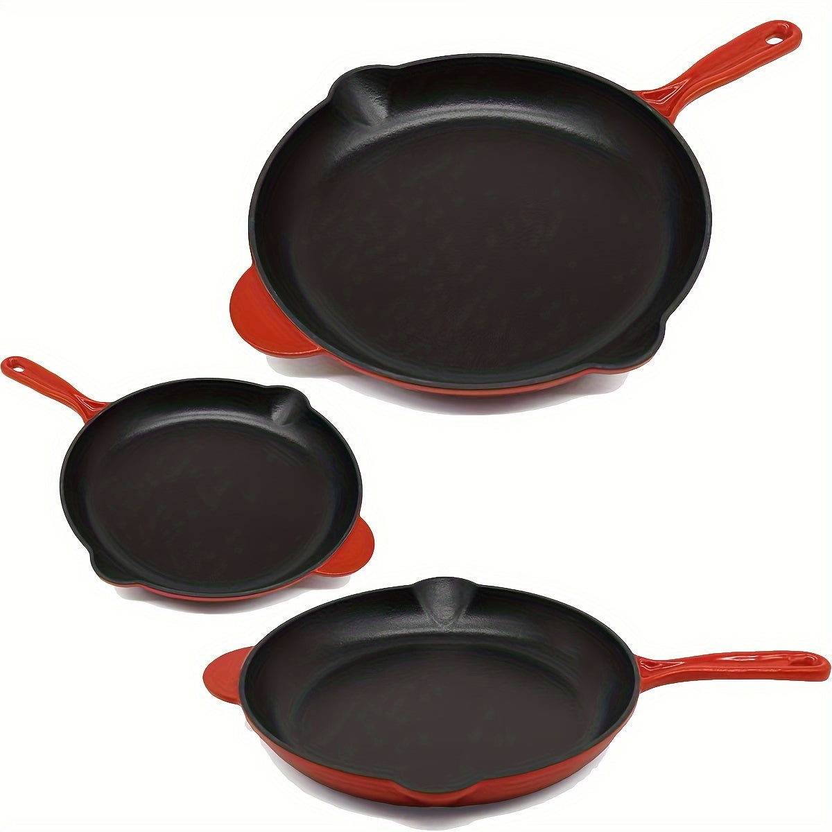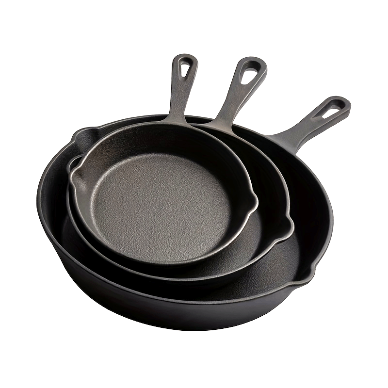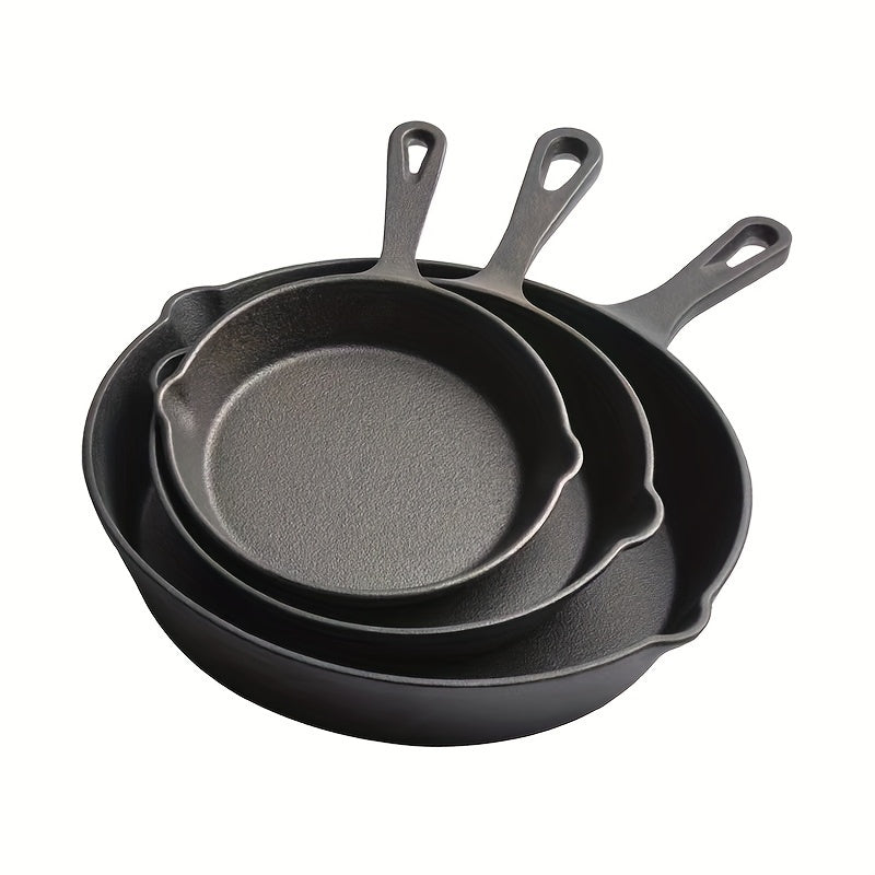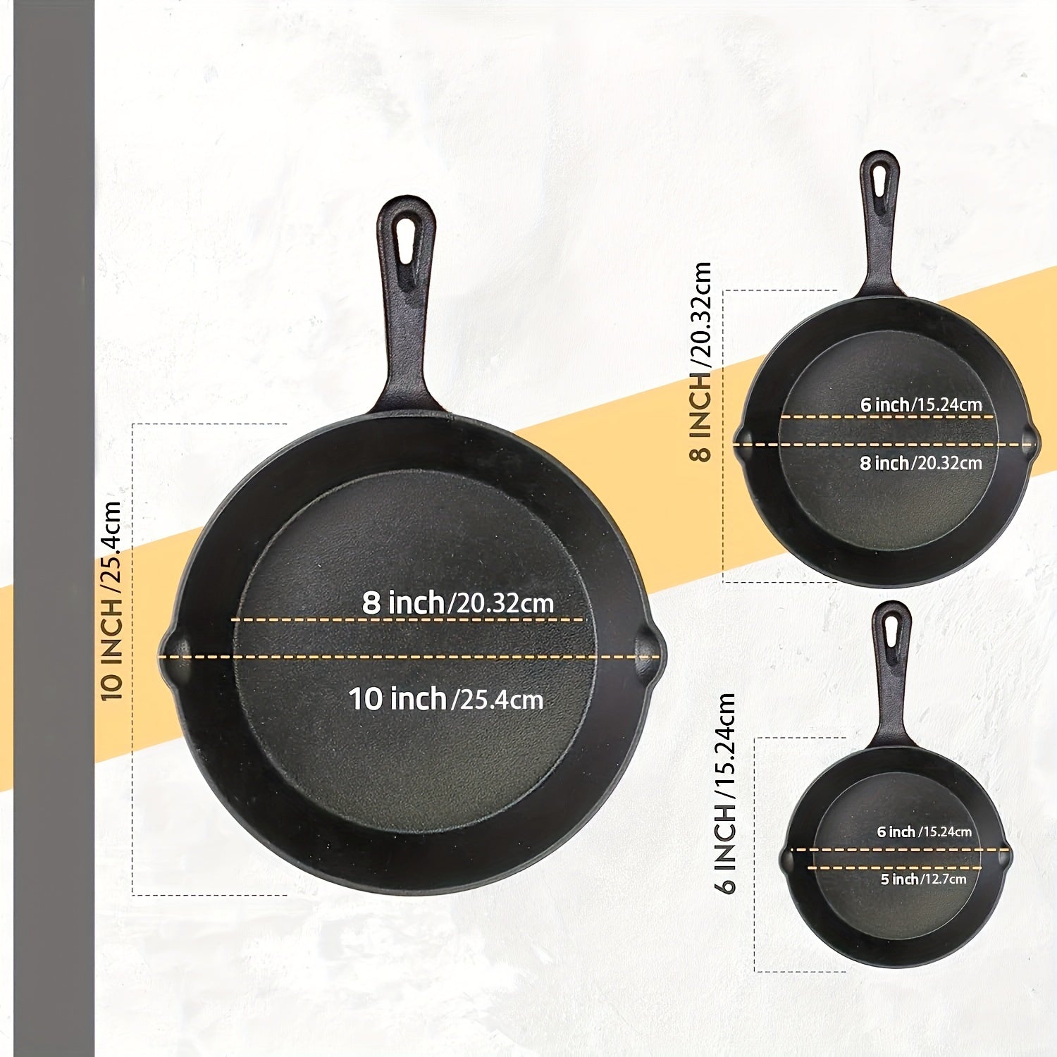 Набор из трех предварительно закаленных чугунных сковород с двойными носиками для слива - Рекомендуется ручная стирка. Включает размеры 15,24 см, 20,32 см и 25,4 см.
