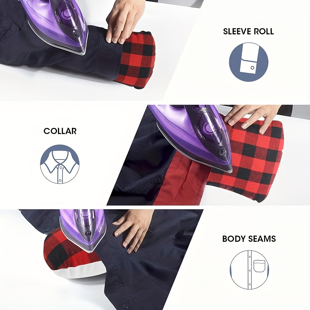 Набор из двух черно-красных клетчатых утюжков и валиков для профессиональной глажки и шитья, включающий валик для рукавов для точной глажки, изогнутую подушку для глажки плечевых накладок и портативный термостойкий утюжок для домашнего использования.