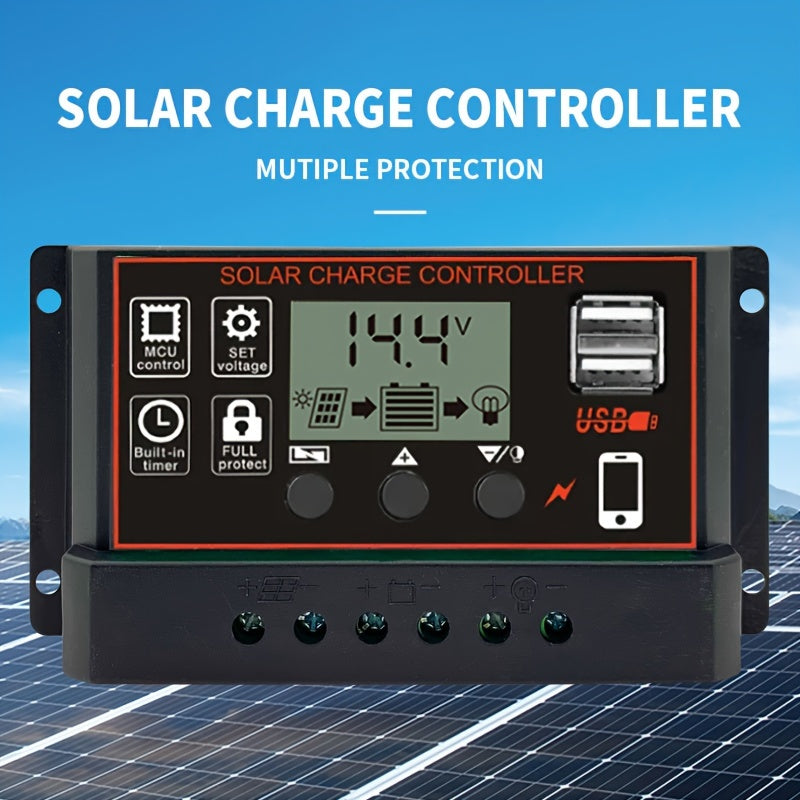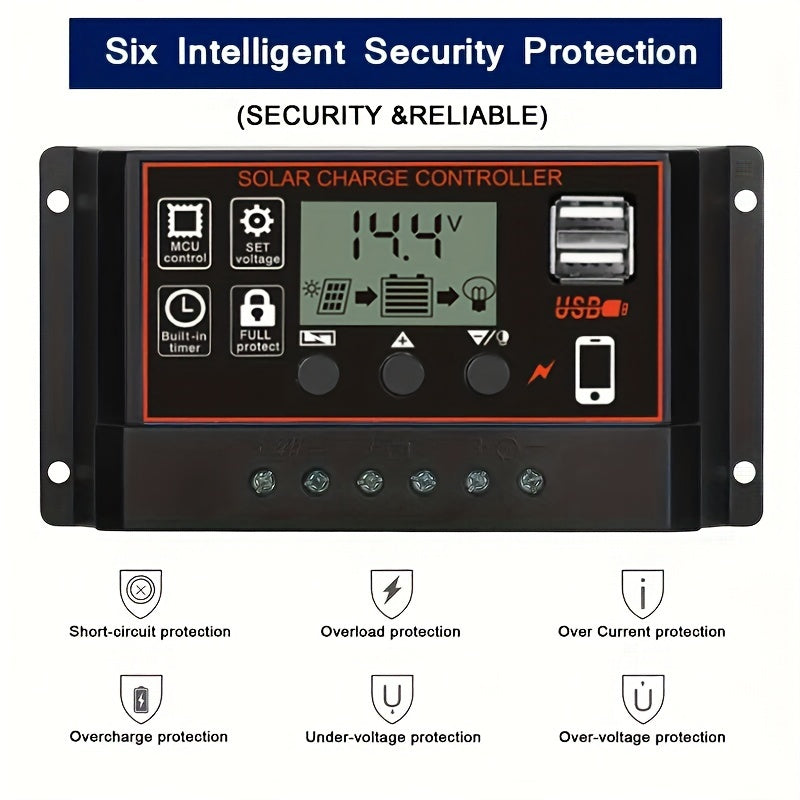Солнечный контроллер заряда с ЖК-дисплеем, двойным USB-выходом, регулируемым таймером и многоуровневой системой защиты для эффективного производства энергии. Жестко подключаемый источник питания без необходимости в аккумуляторе.